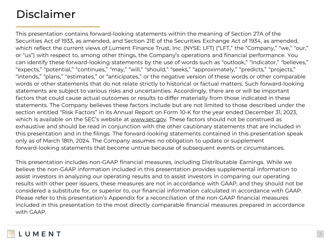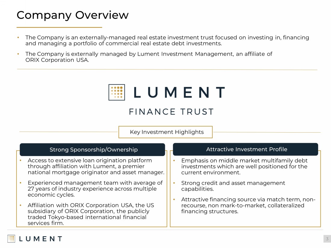 Disclaimer 2 This presentation contains forward - looking statements within the meaning of Section 27A of the Securities Act of 1933, as amended, and Section 21E of the Securities Exchange Act of 1934, as amended, which reflect the current views of Lument Finance Trust, Inc. (NYSE: LFT) (“LFT,” the “Company,” “we,” “our,” or “us”) with respect to, among other things, the Company’s operations and financial performance. You can identify these forward - looking statements by the use of words such as “outlook,” “indicator,” “believes,” “expects,” “potential,” “continues,” “may,” “will,” “should,” “seeks,” “approximately,” “predicts,” “projects,” “intends,” “plans,” “estimates,” or “anticipates,” or the negative version of these words or other comparable words or other statements that do not relate strictly to historical or factual matters. Such forward - looking statements are subject to various risks and uncertainties. Accordingly, there are or will be important factors that could cause actual outcomes or results to differ materially from those indicated in these statements. The Company believes these factors include but are not limited to those described under the section entitled “Risk Factors” in its Annual Report on Form 10 - K for the year ended December 31, 2023, which is available on the SEC’s website at www.sec.gov . These factors should not be construed as exhaustive and should be read in conjunction with the other cautionary statements that are included in this presentation and in the filings. The forward - looking statements contained in this presentation speak only as of March 18th, 2024. The Company assumes no obligation to update or supplement forward-looking statements that become untrue because of subsequent events or circumstances. This presentation includes non - GAAP financial measures, including Distributable Earnings. While we believe the non - GAAP information included in this presentation provides supplemental information to assist investors in analyzing our operating results and to assist investors in comparing our operating results with other peer issuers, these measures are not in accordance with GAAP, and they should not be considered a substitute for, or superior to, our financial information calculated in accordance with GAAP. Please refer to this presentation’s Appendix for a reconciliation of the non - GAAP financial measures included in this presentation to the most directly comparable financial measures prepared in accordance with GAAP.
