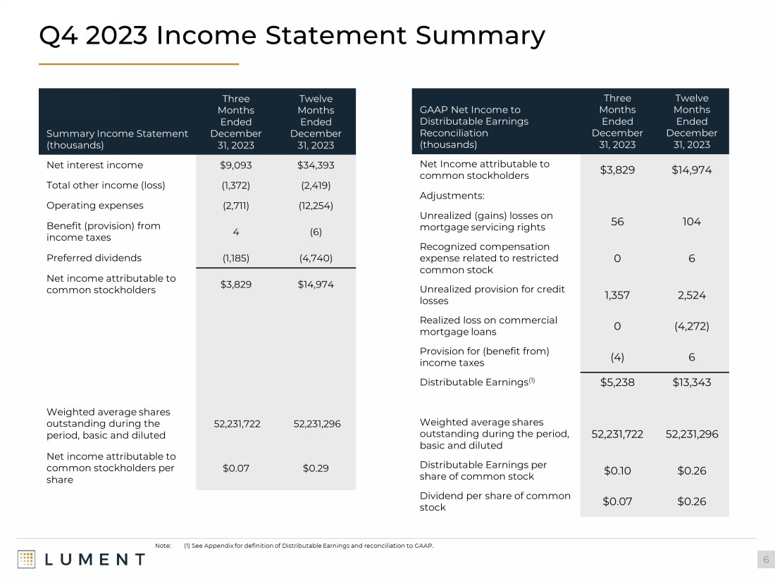 Q4 2023 Balance Sheet Summary 5 Balance Sheet (thousands) December 31, 2023 (1) Commercial mortgage loans held - for - investment (net of allowance for credit losses) $1,383,881 Cash and cash equivalents 51,247 Restricted cash (2) 270 Accrued interest receivable 8,589 Investment related receivable 0 Other assets (3) 2,945 Total assets $1,446,932 Secured financings (4) $1,146,211 Credit facility (4) 47,220 Other liabilities 12,709 Total liabilities $1,206,140 Total equity $240,792 Total liabilities / total equity 5.01x Book Value Per Share of Common Stock (5) $3.46 Note: (1) See Appendix for detailed consolidated balance sheet, including the Company’s consolidated variable interest entities (“VIE’s”). (2) Restricted cash held by LMNT 2021 - FL1 and the LMF 2023 - 1 is available for investment in eligible mortgage assets. (3) Includes mortgage servicing rights, carried at fair value of $0.7 million. (4) Outstanding principal amount of investment grade notes issued by LMNT 2021 - FL1 and LMF 2023 - 1 is $833.8 million and $317.7 million, respectively. The unpaid principal balance of the credit facility is $47.8 million. For GAAP purposes, these liabilities are carried at their outstanding unpaid principal balance, net of any una mor tized discounts and debt issuance costs. (5) See Appendix for definition of Book Value Per Share of Common Stock.
