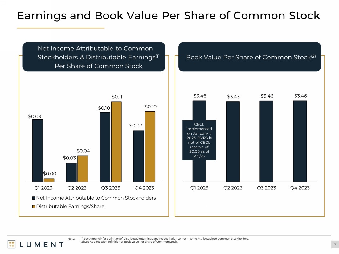 Q4 2023 Income Statement Summary 6 Summary Income Statement (thousands) Three Months Ended December 31, 2023 Twelve Months Ended December 31, 2023 Net interest income $9,093 $34,393 Total other income (loss) (1,372) (2,419) Operating expenses (2,711) (12,254) Benefit (provision) from income taxes 4 (6) Preferred dividends (1,185) (4,740) Net income attributable to common stockholders $3,829 $14,974 Weighted average shares outstanding during the period, basic and diluted 52,231,722 52,231,296 Net income attributable to common stockholders per share $0.07 $0.29 GAAP Net Income to Distributable Earnings Reconciliation (thousands) Three Months Ended December 31, 2023 Twelve Months Ended December 31, 2023 Net Income attributable to common stockholders $3,829 $14,974 Adjustments: Unrealized (gains) losses on mortgage servicing rights 56 104 Recognized compensation expense related to restricted common stock 0 6 Unrealized provision for credit losses 1,357 2,524 Realized loss on commercial mortgage loans 0 (4,272) Provision for (benefit from) income taxes (4) 6 Distributable Earnings (1) $5,238 $13,343 Weighted average shares outstanding during the period, basic and diluted 52,231,722 52,231,296 Distributable Earnings per share of common stock $0.10 $0.26 Dividend per share of common stock $0.07 $0.26 Note: (1) See Appendix for definition of Distributable Earnings and reconciliation to GAAP.