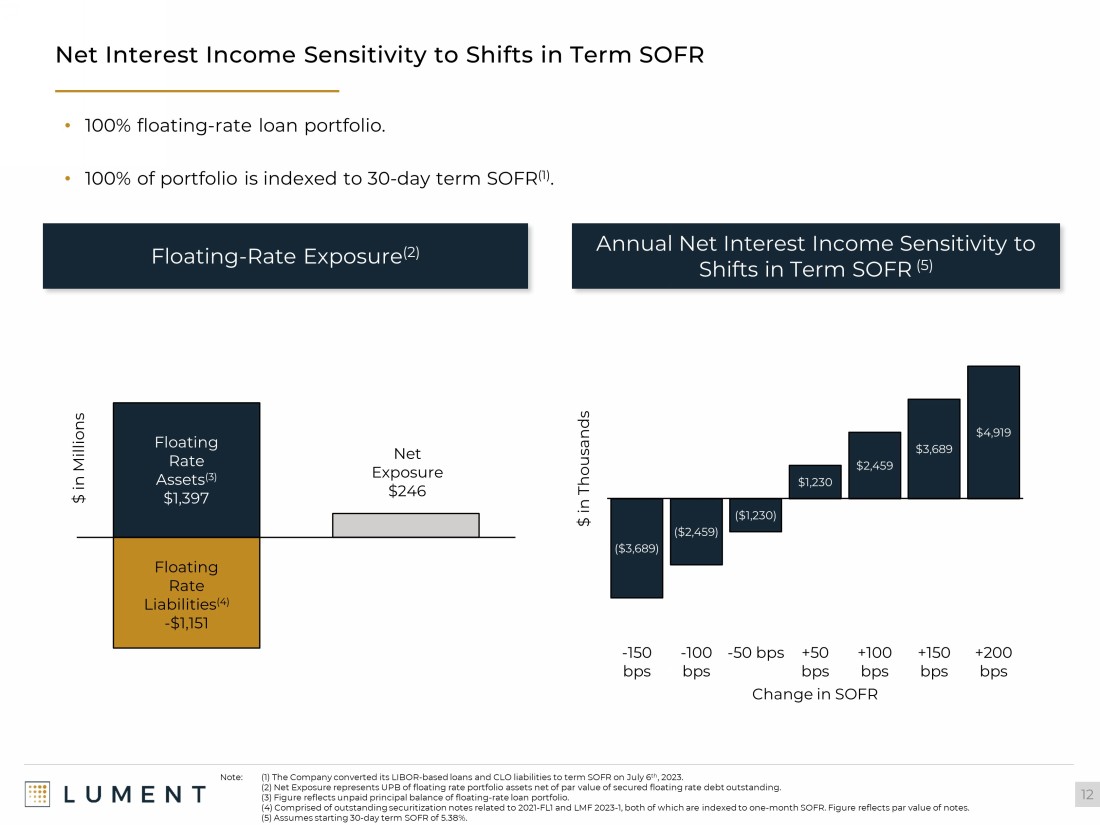 ($3,689) ($2,459) ($1,230) $1,230 $2,459 $3,689 $4,919 -150 bps -100 bps -50 bps +50 bps +100 bps +150 bps +200 bps $ in Thousands Change in SOFR Net Interest Income Sensitivity to Shifts in Term SOFR 12 Floating Rate Assets (3) $1,397 Floating Rate Liabilities (4) - $1,151 Net Exposure $246 Floating - Rate Exposure (2) Annual Net Interest Income Sensitivity to Shifts in Term SOFR (5) $ in Millions Note: (1) The Company converted its LIBOR - based loans and CLO liabilities to term SOFR on July 6 th , 2023. (2) Net Exposure represents UPB of floating rate portfolio assets net of par value of secured floating rate debt outstanding. (3) Figure reflects unpaid principal balance of floating - rate loan portfolio. (4) Comprised of outstanding securitization notes related to 2021 - FL1 and LMF 2023 - 1, both of which are indexed to one - month SO FR. Figure reflects par value of notes. (5) Assumes starting 30 - day term SOFR of 5.38%. • 100% floating - rate loan portfolio. • 100% of portfolio is indexed to 30 - day term SOFR (1) .