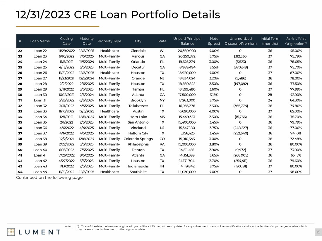 12/31/2023 CRE Loan Portfolio Details 14 Continued on the following page Note: (1) LTV as of the date the loan was originated by an affiliate. LTV has not been updated for any subsequent draws or loan modifications and is not reflective of any changes in value which may have occurred subsequent to the origination date. # Loan Name Closing Date Maturity Date Property Type City State Unpaid Principal Balance Note Spread Unamortized Discount/Premium Initial Term (months) As-Is LTV at Origination (1) 1 Loan 1 12/16/2021 1/3/2025 Multi-Family Daytona FL 51,375,000 3.05% 0 37 71.70% 2 Loan 2 11/22/2019 11/3/2023 Multi-Family Virginia Beach VA 36,781,588 3.27% 0 48 77.10% 3 Loan 3 6/28/2021 7/6/2024 Multi-Family Barrington NJ 36,658,084 3.05% (11,619) 36 78.13% 4 Loan 4 6/8/2021 7/5/2024 Multi-Family Chattanooga TN 33,360,000 3.65% 0 37 79.76% 5 Loan 5 3/22/2022 4/5/2025 Multi-Family Seneca SC 31,876,244 3.35% (586,121) 37 74.54% 6 Loan 6 6/28/2022 7/3/2025 Multi-Family Dallas TX 31,602,808 3.90% (478,708) 36 71.59% 7 Loan 7 12/29/2021 1/6/2025 Multi-Family Multi NC 30,709,146 3.85% 0 36 59.90% 8 Loan 8 6/8/2021 7/5/2024 Multi-Family Miami FL 30,576,666 3.20% 0 37 74.26% 9 Loan 9 5/20/2021 6/6/2024 Multi-Family Marietta GA 30,220,508 3.10% (19,636) 37 77.02% 10 Loan 10 8/25/2022 9/5/2025 Multi-Family Wilmington NC 28,653,440 4.00% 0 36 71.45% 11 Loan 11 6/7/2021 7/5/2024 Multi-Family San Antonio TX 27,569,521 3.40% (4,190) 37 80.00% 12 Loan 12 11/2/2021 11/5/2024 Multi-Family Melbourne FL 26,049,291 3.70% (215,316) 36 72.09% 13 Loan 13 8/26/2021 8/5/2024 Multi-Family Clarkston GA 25,440,413 3.50% (1,240) 35 79.00% 14 Loan 14 11/15/2021 12/6/2024 Multi-Family El Paso TX 24,330,000 3.10% 0 37 75.96% 15 Loan 15 10/18/2021 11/6/2024 Multi-Family Cherry Hill NJ 23,348,000 3.00% 0 37 72.40% 16 Loan 16 8/26/2021 9/5/2024 Multi-Family Union City GA 22,872,354 3.35% (3,906) 36 70.40% 17 Loan 17 4/27/2022 5/5/2025 Multi-Family North Brunswick NJ 22,182,443 3.40% (145,601) 36 79.90% 18 Loan 18 3/22/2022 4/5/2025 Multi-Family York PA 21,934,375 3.30% (523,963) 37 79.17% 19 Loan 19 11/16/2021 12/5/2024 Multi-Family Dallas TX 21,916,753 3.20% (9,236) 37 73.54% 20 Loan 20 7/8/2022 8/5/2025 Multi-Family Arlington TX 21,818,465 3.75% (306,198) 37 67.10% 21 Loan 21 8/31/2021 9/6/2024 Multi-Family Houston TX 21,644,684 3.30% (2,267) 36 74.20%