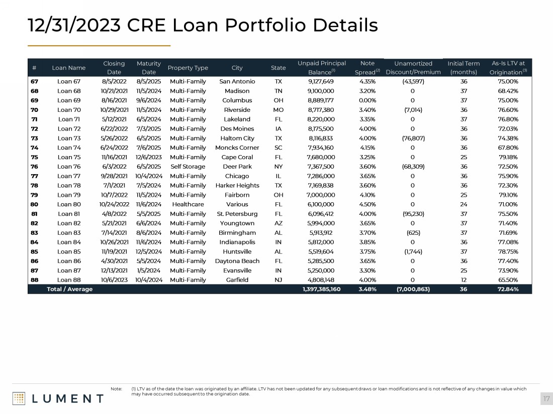 12/31/2023 CRE Loan Portfolio Details 16 Continued on the following page Note: (1) LTV as of the date the loan was originated by an affiliate. LTV has not been updated for any subsequent draws or loan modifications and is not reflective of any changes in value which may have occurred subsequent to the origination date. # Loan Name Closing Date Maturity Date Property Type City State Unpaid Principal Balance Note Spread Unamortized Discount/Premium Initial Term (months) As-Is LTV at Origination (1) 45 Loan 45 12/28/2021 1/3/2025 Multi-Family Houston TX 14,000,000 3.25% (214,653) 36 71.22% 46 Loan 46 5/13/2022 6/5/2025 Multi-Family Decatur AL 13,885,769 3.50% (119,462) 37 59.21% 47 Loan 47 4/12/2021 5/5/2024 Multi-Family Cedar Park TX 13,666,721 3.75% 0 37 66.70% 48 Loan 48 6/10/2022 7/5/2025 Multi-Family Blakely PA 13,625,505 3.90% (99,181) 37 75.00% 49 Loan 49 10/6/2023 10/4/2024 Multi-Family Garfield NJ 13,191,852 4.00% 0 12 65.50% 50 Loan 50 12/13/2021 1/5/2024 Multi-Family Evansville IN 12,600,000 3.30% 0 25 74.30% 51 Loan 51 12/28/2021 1/3/2025 Multi-Family Houston TX 12,322,717 3.25% (119,341) 36 71.20% 52 Loan 52 1/25/2022 2/6/2025 Multi-Family Corpus Christi TX 12,249,079 3.55% (148,122) 36 78.76% 53 Loan 53 5/12/2022 6/5/2025 Multi-Family Ypsilanti MI 11,926,591 3.50% (191,907) 37 68.40% 54 Loan 54 12/10/2021 1/5/2025 Multi-Family Los Angeles CA 11,662,582 3.50% (282,033) 37 67.93% 55 Loan 55 3/4/2022 3/5/2025 Multi-Family Houston TX 11,467,505 3.45% (266,666) 36 78.30% 56 Loan 56 4/14/2022 5/5/2025 Multi-Family Irving TX 11,287,602 3.50% (194,811) 37 74.90% 57 Loan 57 10/28/2021 11/6/2024 Multi-Family Tampa FL 11,202,535 2.95% 0 36 75.70% 58 Loan 58 4/23/2021 5/6/2024 Multi-Family Tualatin OR 10,986,357 3.20% (2,431) 36 73.90% 59 Loan 59 5/3/2022 5/5/2025 Multi-Family Port Richey FL 10,818,945 3.55% (229,803) 36 79.05% 60 Loan 60 9/30/2021 10/4/2024 Multi-Family Clearfield UT 10,795,000 3.15% 0 36 67.98% 61 Loan 61 12/29/2021 1/3/2025 Multi-Family Phoenix AZ 10,615,094 3.65% (5,820) 36 75.90% 62 Loan 62 6/28/2022 7/4/2025 Multi-Family Colorado Springs CO 10,531,845 3.90% 0 36 73.06% 63 Loan 63 12/2/2021 12/6/2024 Multi-Family Tomball TX 9,975,000 3.40% 0 36 68.50% 64 Loan 64 11/23/2021 12/5/2024 Multi-Family Atlanta GA 9,856,000 3.35% 0 36 79.50% 65 Loan 65 1/14/2022 2/5/2025 Multi-Family Houston TX 9,609,250 3.60% 0 37 78.76% 66 Loan 66 7/14/2022 8/5/2025 Multi-Family Bradenton FL 9,429,206 3.90% (78,381) 37 74.40%
