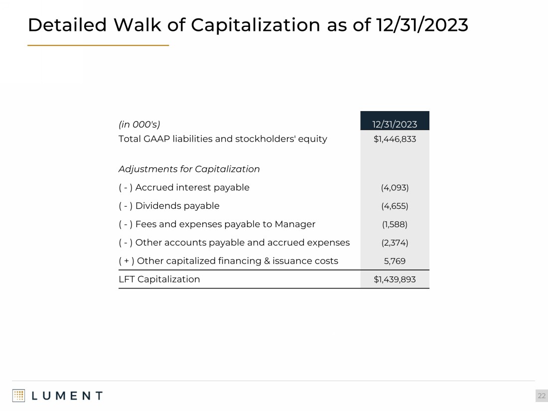 Detailed Walk of Capitalization as of 12/31/2023 22 (in 000's) 12/31/2023 Total GAAP liabilities and stockholders' equity $1,446,833 Adjustments for Capitalization ( - ) Accrued interest payable (4,093) ( - ) Dividends payable (4,655) ( - ) Fees and expenses payable to Manager (1,588) ( - ) Other accounts payable and accrued expenses (2,374) ( + ) Other capitalized financing & issuance costs 5,769 LFT Capitalization $1,439,893