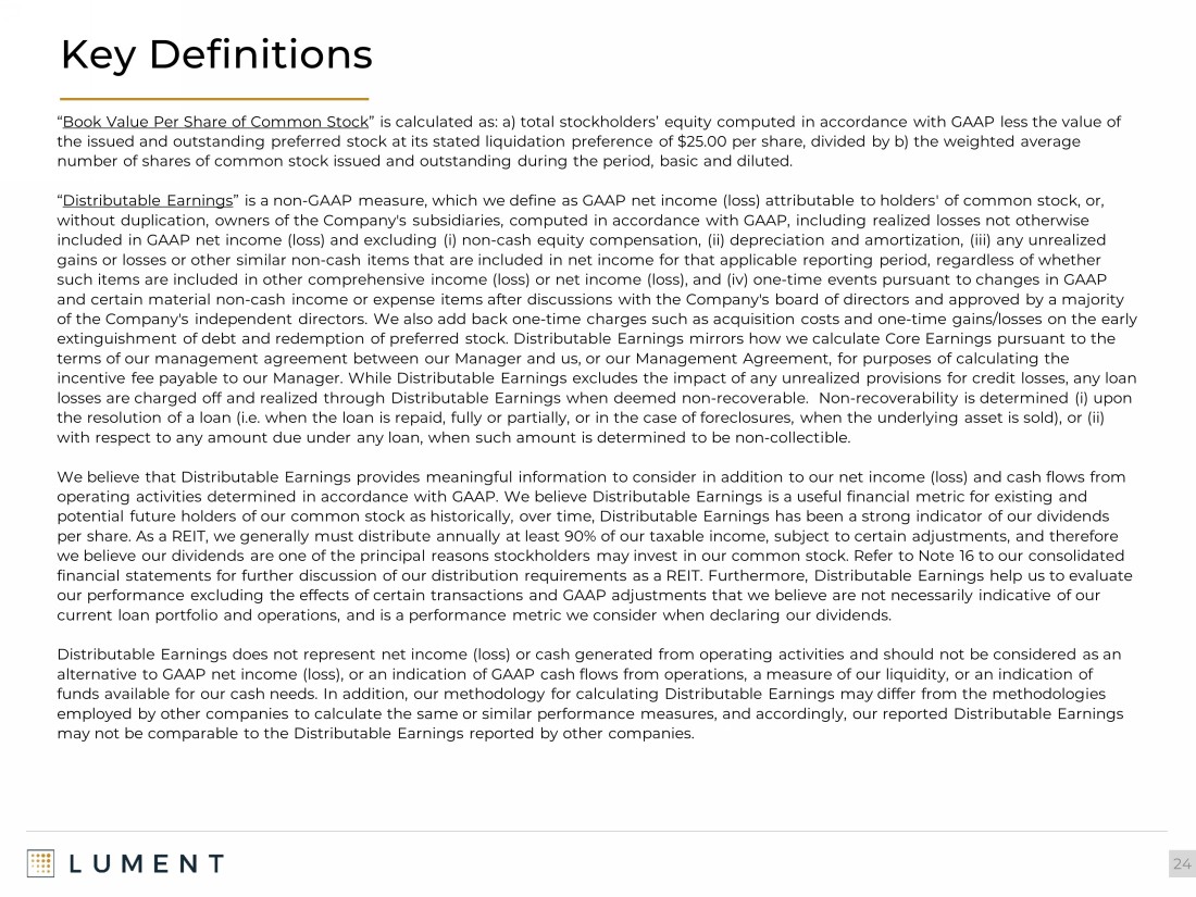 Key Definitions 24 “ Book Value Per Share of Common Stock ” is calculated as: a) total stockholders’ equity computed in accordance with GAAP less the value of the issued and outstanding preferred stock at its stated liquidation preference of $25.00 per share, divided by b) the weight ed average number of shares of common stock issued and outstanding during the period, basic and diluted. “ Distributable Earnings ” is a non - GAAP measure, which we define as GAAP net income (loss) attributable to holders' of common stock, or, without duplication, owners of the Company's subsidiaries, computed in accordance with GAAP, including realized losses not ot her wise included in GAAP net income (loss) and excluding (i) non - cash equity compensation, (ii) depreciation and amortization, (iii) any unrealized gains or losses or other similar non - cash items that are included in net income for that applicable reporting period, regardless of whether such items are included in other comprehensive income (loss) or net income (loss), and (iv) one - time events pursuant to changes in GAAP and certain material non - cash income or expense items after discussions with the Company's board of directors and approved by a majority of the Company's independent directors. We also add back one - time charges such as acquisition costs and one - time gains/losses on the early extinguishment of debt and redemption of preferred stock. Distributable Earnings mirrors how we calculate Core Earnings pursu ant to the terms of our management agreement between our Manager and us, or our Management Agreement, for purposes of calculating the incentive fee payable to our Manager. While Distributable Earnings excludes the impact of any unrealized provisions for credi t l osses, any loan losses are charged off and realized through Distributable Earnings when deemed non - recoverable. Non - recoverability is determine d (i) upon the resolution of a loan (i.e. when the loan is repaid, fully or partially, or in the case of foreclosures, when the underlyi ng asset is sold), or (ii) with respect to any amount due under any loan, when such amount is determined to be non - collectible. We believe that Distributable Earnings provides meaningful information to consider in addition to our net income (loss) and c ash flows from operating activities determined in accordance with GAAP. We believe Distributable Earnings is a useful financial metric for e xis ting and potential future holders of our common stock as historically, over time, Distributable Earnings has been a strong indicator o f o ur dividends per share. As a REIT, we generally must distribute annually at least 90% of our taxable income, subject to certain adjustment s, and therefore we believe our dividends are one of the principal reasons stockholders may invest in our common stock. Refer to Note 16 to ou r c onsolidated financial statements for further discussion of our distribution requirements as a REIT. Furthermore, Distributable Earnings h elp us to evaluate our performance excluding the effects of certain transactions and GAAP adjustments that we believe are not necessarily indica tiv e of our current loan portfolio and operations, and is a performance metric we consider when declaring our dividends. Distributable Earnings does not represent net income (loss) or cash generated from operating activities and should not be con sid ered as an alternative to GAAP net income (loss), or an indication of GAAP cash flows from operations, a measure of our liquidity, or an in dication of funds available for our cash needs. In addition, our methodology for calculating Distributable Earnings may differ from the m eth odologies employed by other companies to calculate the same or similar performance measures, and accordingly, our reported Distributabl e E arnings may not be comparable to the Distributable Earnings reported by other companies.