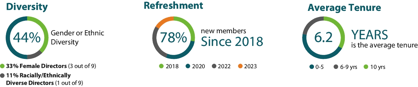 | | Continuous Board Refreshment | | | The average tenure of our directors is 6.2 years. Since 2018, the Board has appointed seven new directors, representing refreshment of 78% of the current nine-member Board in that time. Bryan D. Yokley is the Board’s most recent addition, having been appointed in October 2023. | |