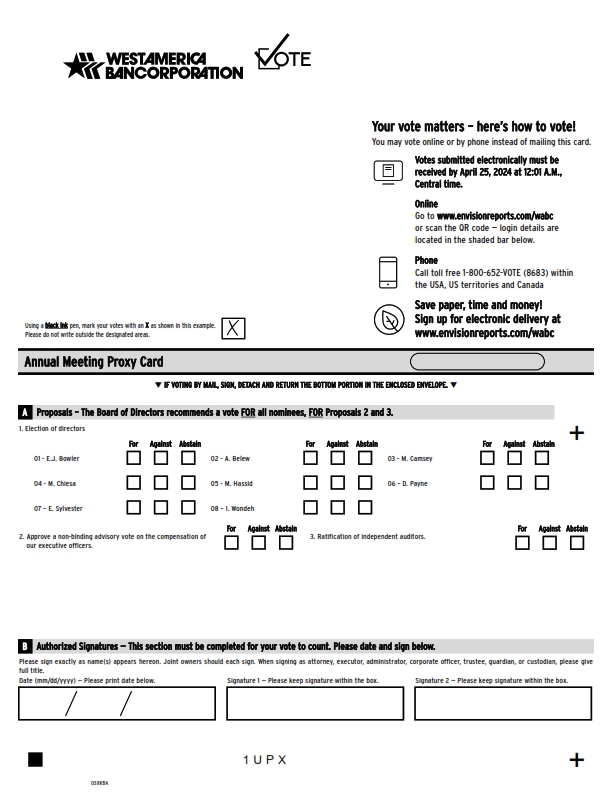 Admission to the Meeting WESTAMERICA BANCORPORATION ANNUAL MEETING OF SHAREHOLDERS 10:00 A.M. PACIFIC STANDARD TIME, THURSDAY, APRIL 25, 2024, WESTAMERICA BANCORPORATION, 4550 MANGELS BLVD., FAIRFIELD, CALIFORNIA Registered holders can avoid registration lines by marking the Meeting Attendance box to the right of your signature on your Proxy Card and returning it to Computershare Investor Services in the enclosed return envelope, or indicate your intent to attend through a toll free telephone vote or Internet vote. Beneficial Owners holding their shares in a brokerage account or at a bank or other intermediary must proceed to the registration desk and provide the following evidence of ownership: 1) a Legal Proxy, which you can obtain from your bank or broker or other intermediary or your shareholder statement dated on or after March 6, 2024, the Annual Meeting Record Date; and 2) a picture identification. Because of seating limitations, no more than one guest will be allowed per shareholder. Small steps make an impact. Help the environment by consenting to receive electronic delivery, sign up at www.envisionreports.com/wabc q IF VOTING BY MAIL, SIGN, DETACH AND RETURN THE BOTTOM PORTION IN THE ENCLOSED ENVELOPE. q Proxy — Westamerica Bancorporation PROXY SOLICITED BY THE BOARD OF DIRECTORS OF WESTAMERICA BANCORPORATION FOR THE ANNUAL MEETING OF SHAREHOLDERS ON APRIL 25, 2024. The undersigned holder hereby authorizes E. Joseph Bowler, Michele Hassid and Edward B. Sylvester, each with full power of substitution, to represent and vote, as designated on the reverse side, all full and fractional shares of Common Stock of Westamerica Bancorporation which the undersigned would be entitled to vote at the Annual Meeting of Shareholders of said corporation to be held at Westamerica Bancorporation, 4550 Mangels Blvd., Fairfield, California at 10:00 a.m., Pacific Standard Time, on Thursday, April 25, 2024, upon the matters set forth on the reverse side of this Proxy and described in the accompanying Proxy Statement and upon such other business as may properly come before the meeting or any postponement or adjournment thereof. The Proxy, when properly executed will be voted as directed herein by the undersigned shareholder. If no direction is indicated, this Proxy will be voted FOR ALL NOMINEES, FOR Proposals 2 and 3, and at the direction of the Proxies on all other matters which may properly come before the meeting. If you are a participant in the Westamerica Bancorporation Tax Deferred Savings/Retirement Plan (ESOP) (the “Plan”), you may direct the Trustee of the Plan to vote all full and fractional shares of Westamerica Bancorporation common stock standing to your credit of your individual account(s) as of March 6, 2024. The Board of Directors of Westamerica Bancorporation recommends a vote FOR ALL NOMINEES, FOR Proposals 2 and 3. Please instruct the Trustee how to vote on these proposals by indicating your selection on the reverse of this Proxy Card. If the Trustee does not receive written instructions from you before April 15, 2024, it will vote all the shares for which you are entitled to provide instruction in the same proportion as shares for which instructions are received. C Non-Voting Items PLEASE MARK, SIGN, DATE, AND MAIL THIS PROXY PROMPTLY, USING THE ENCLOSED ENVELOPE. (Continued, and to be signed on the other side) Change of Address — Please print new address below. Comments — Please print your comments below. Meeting Attendance Mark box to the right if you plan to attend the Annual Meeting. +