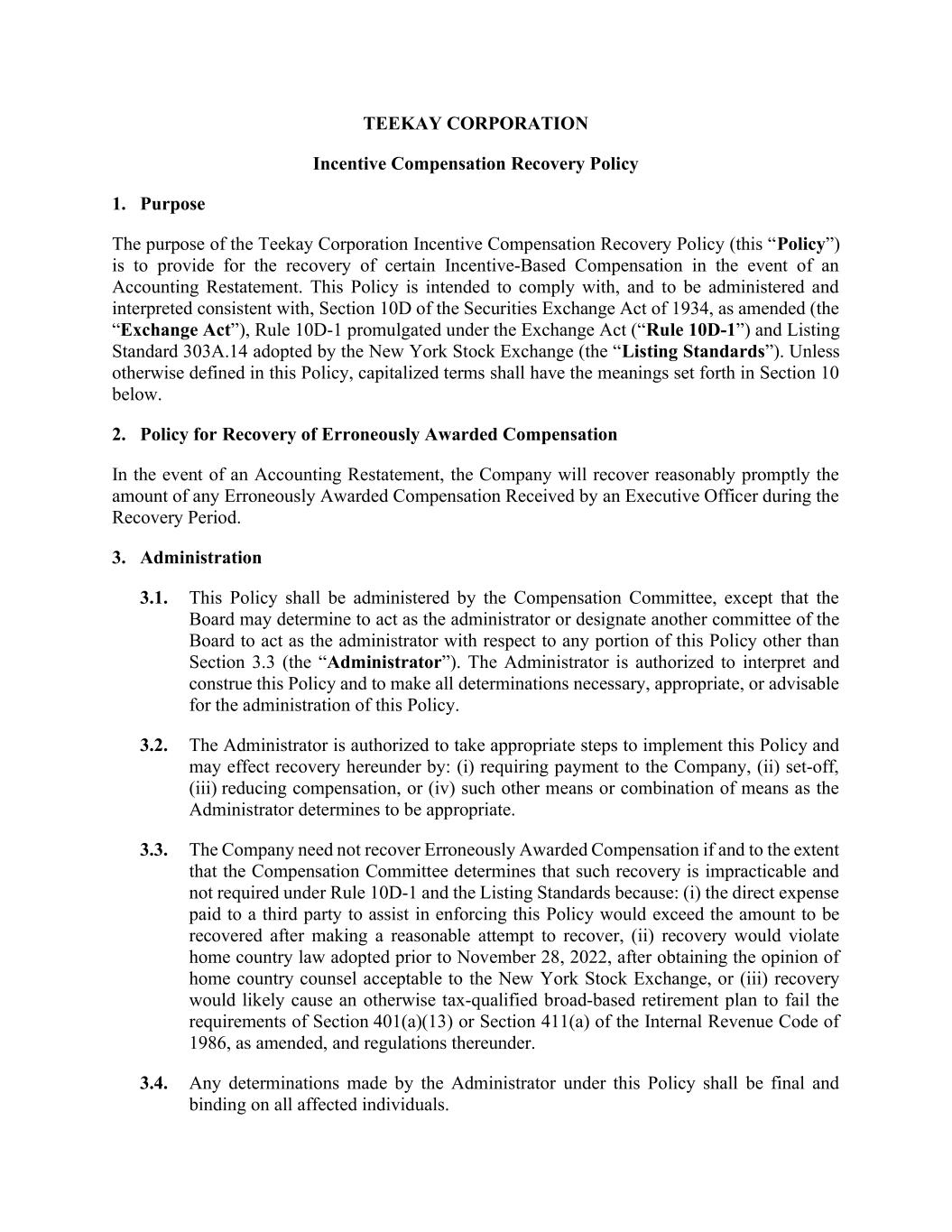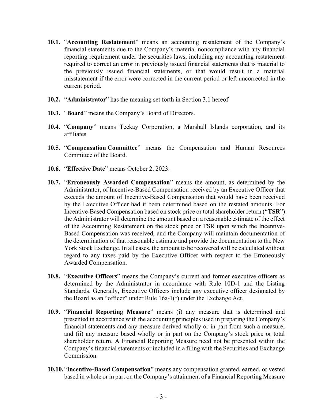 - 3 - 10.1. “Accounting Restatement” means an accounting restatement of the Company’s financial statements due to the Company’s material noncompliance with any financial reporting requirement under the securities laws, including any accounting restatement required to correct an error in previously issued financial statements that is material to the previously issued financial statements, or that would result in a material misstatement if the error were corrected in the current period or left uncorrected in the current period. 10.2. “Administrator” has the meaning set forth in Section 3.1 hereof. 10.3. “Board” means the Company’s Board of Directors. 10.4. “Company” means Teekay Corporation, a Marshall Islands corporation, and its affiliates. 10.5. “Compensation Committee” means the Compensation and Human Resources Committee of the Board. 10.6. “Effective Date” means October 2, 2023. 10.7. “Erroneously Awarded Compensation” means the amount, as determined by the Administrator, of Incentive-Based Compensation received by an Executive Officer that exceeds the amount of Incentive-Based Compensation that would have been received by the Executive Officer had it been determined based on the restated amounts. For Incentive-Based Compensation based on stock price or total shareholder return (“TSR”) the Administrator will determine the amount based on a reasonable estimate of the effect of the Accounting Restatement on the stock price or TSR upon which the Incentive- Based Compensation was received, and the Company will maintain documentation of the determination of that reasonable estimate and provide the documentation to the New York Stock Exchange. In all cases, the amount to be recovered will be calculated without regard to any taxes paid by the Executive Officer with respect to the Erroneously Awarded Compensation. 10.8. “Executive Officers” means the Company’s current and former executive officers as determined by the Administrator in accordance with Rule 10D-1 and the Listing Standards. Generally, Executive Officers include any executive officer designated by the Board as an “officer” under Rule 16a-1(f) under the Exchange Act. 10.9. “Financial Reporting Measure” means (i) any measure that is determined and presented in accordance with the accounting principles used in preparing the Company’s financial statements and any measure derived wholly or in part from such a measure, and (ii) any measure based wholly or in part on the Company’s stock price or total shareholder return. A Financial Reporting Measure need not be presented within the Company’s financial statements or included in a filing with the Securities and Exchange Commission. 10.10. “Incentive-Based Compensation” means any compensation granted, earned, or vested based in whole or in part on the Company’s attainment of a Financial Reporting Measure