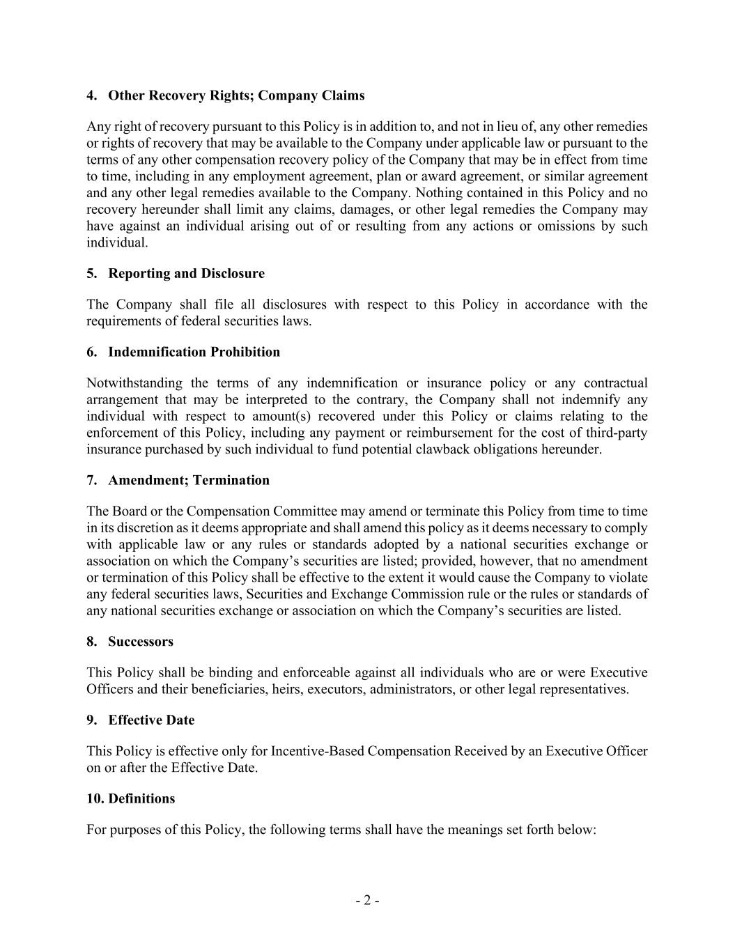 - 2 - 4. Other Recovery Rights; Company Claims Any right of recovery pursuant to this Policy is in addition to, and not in lieu of, any other remedies or rights of recovery that may be available to the Company under applicable law or pursuant to the terms of any other compensation recovery policy of the Company that may be in effect from time to time, including in any employment agreement, plan or award agreement, or similar agreement and any other legal remedies available to the Company. Nothing contained in this Policy and no recovery hereunder shall limit any claims, damages, or other legal remedies the Company may have against an individual arising out of or resulting from any actions or omissions by such individual. 5. Reporting and Disclosure The Company shall file all disclosures with respect to this Policy in accordance with the requirements of federal securities laws. 6. Indemnification Prohibition Notwithstanding the terms of any indemnification or insurance policy or any contractual arrangement that may be interpreted to the contrary, the Company shall not indemnify any individual with respect to amount(s) recovered under this Policy or claims relating to the enforcement of this Policy, including any payment or reimbursement for the cost of third-party insurance purchased by such individual to fund potential clawback obligations hereunder. 7. Amendment; Termination The Board or the Compensation Committee may amend or terminate this Policy from time to time in its discretion as it deems appropriate and shall amend this policy as it deems necessary to comply with applicable law or any rules or standards adopted by a national securities exchange or association on which the Company’s securities are listed; provided, however, that no amendment or termination of this Policy shall be effective to the extent it would cause the Company to violate any federal securities laws, Securities and Exchange Commission rule or the rules or standards of any national securities exchange or association on which the Company’s securities are listed. 8. Successors This Policy shall be binding and enforceable against all individuals who are or were Executive Officers and their beneficiaries, heirs, executors, administrators, or other legal representatives. 9. Effective Date This Policy is effective only for Incentive-Based Compensation Received by an Executive Officer on or after the Effective Date. 10. Definitions For purposes of this Policy, the following terms shall have the meanings set forth below: