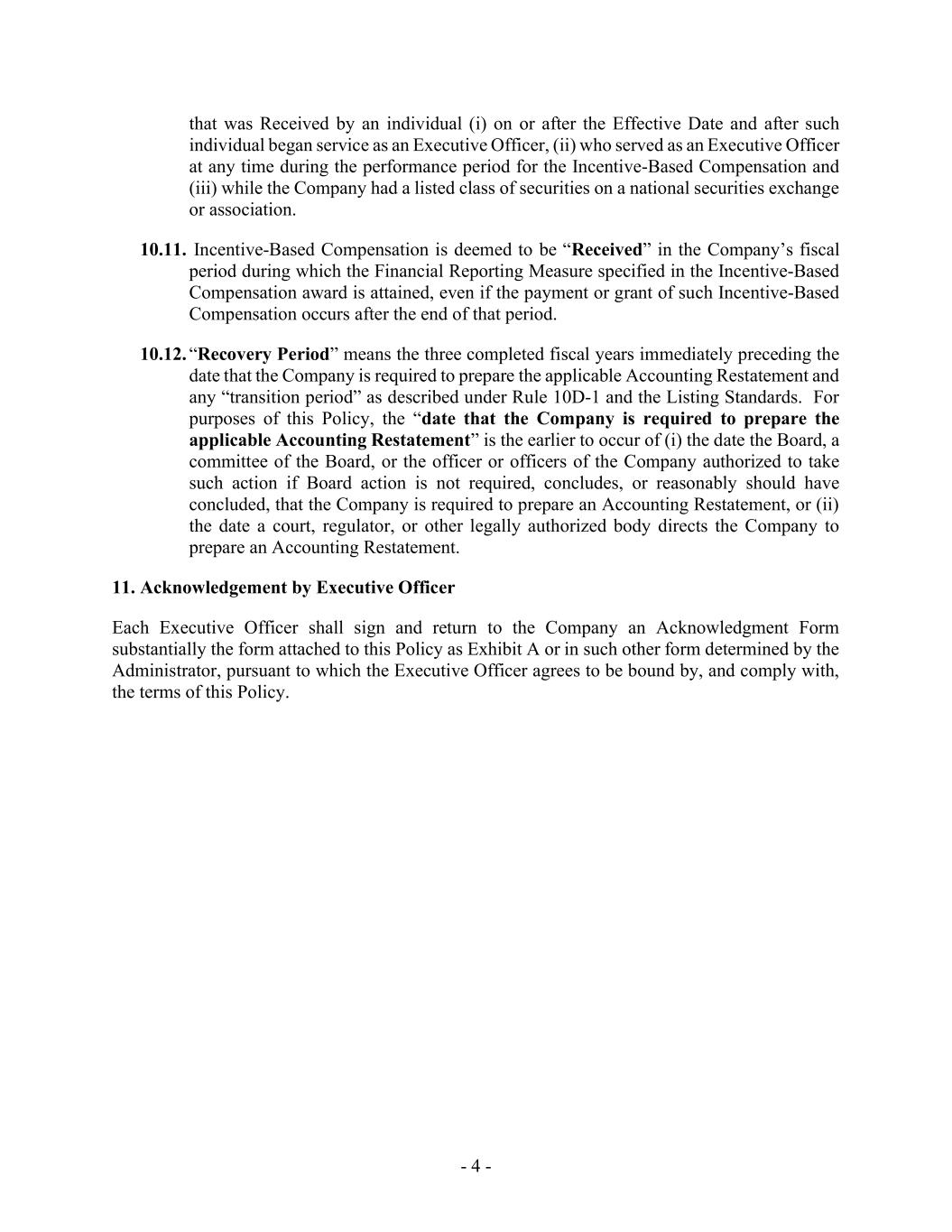- 4 - that was Received by an individual (i) on or after the Effective Date and after such individual began service as an Executive Officer, (ii) who served as an Executive Officer at any time during the performance period for the Incentive-Based Compensation and (iii) while the Company had a listed class of securities on a national securities exchange or association. 10.11. Incentive-Based Compensation is deemed to be “Received” in the Company’s fiscal period during which the Financial Reporting Measure specified in the Incentive-Based Compensation award is attained, even if the payment or grant of such Incentive-Based Compensation occurs after the end of that period. 10.12. “Recovery Period” means the three completed fiscal years immediately preceding the date that the Company is required to prepare the applicable Accounting Restatement and any “transition period” as described under Rule 10D-1 and the Listing Standards. For purposes of this Policy, the “date that the Company is required to prepare the applicable Accounting Restatement” is the earlier to occur of (i) the date the Board, a committee of the Board, or the officer or officers of the Company authorized to take such action if Board action is not required, concludes, or reasonably should have concluded, that the Company is required to prepare an Accounting Restatement, or (ii) the date a court, regulator, or other legally authorized body directs the Company to prepare an Accounting Restatement. 11. Acknowledgement by Executive Officer Each Executive Officer shall sign and return to the Company an Acknowledgment Form substantially the form attached to this Policy as Exhibit A or in such other form determined by the Administrator, pursuant to which the Executive Officer agrees to be bound by, and comply with, the terms of this Policy.