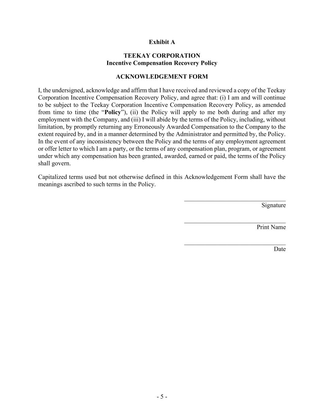 - 5 - Exhibit A TEEKAY CORPORATION Incentive Compensation Recovery Policy ACKNOWLEDGEMENT FORM I, the undersigned, acknowledge and affirm that I have received and reviewed a copy of the Teekay Corporation Incentive Compensation Recovery Policy, and agree that: (i) I am and will continue to be subject to the Teekay Corporation Incentive Compensation Recovery Policy, as amended from time to time (the “Policy”), (ii) the Policy will apply to me both during and after my employment with the Company, and (iii) I will abide by the terms of the Policy, including, without limitation, by promptly returning any Erroneously Awarded Compensation to the Company to the extent required by, and in a manner determined by the Administrator and permitted by, the Policy. In the event of any inconsistency between the Policy and the terms of any employment agreement or offer letter to which I am a party, or the terms of any compensation plan, program, or agreement under which any compensation has been granted, awarded, earned or paid, the terms of the Policy shall govern. Capitalized terms used but not otherwise defined in this Acknowledgement Form shall have the meanings ascribed to such terms in the Policy. ________________________________ Signature ________________________________ Print Name ________________________________ Date