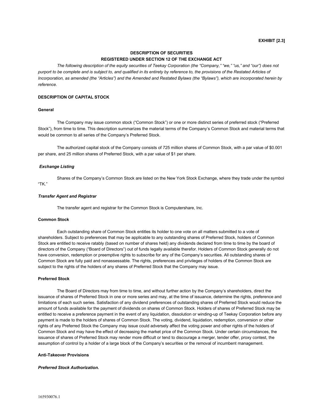 | Common Stock, par value of $0.001 per share | TK | New York Stock Exchange |