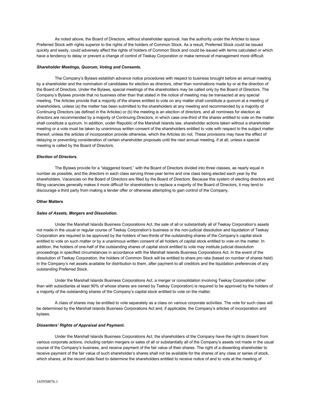 TEEKAY CORPORATION Incentive Compensation Recovery Policy 1. Purpose The purpose of the Teekay Corporation Incentive Compensation Recovery Policy (this “Policy”) is to provide for the recovery of certain Incentive-Based Compensation in the event of an Accounting Restatement. This Policy is intended to comply with, and to be administered and interpreted consistent with, Section 10D of the Securities Exchange Act of 1934, as amended (the “Exchange Act”), Rule 10D-1 promulgated under the Exchange Act (“Rule 10D-1”) and Listing Standard 303A.14 adopted by the New York Stock Exchange (the “Listing Standards”). Unless otherwise defined in this Policy, capitalized terms shall have the meanings set forth in Section 10 below. 2. Policy for Recovery of Erroneously Awarded Compensation In the event of an Accounting Restatement, the Company will recover reasonably promptly the amount of any Erroneously Awarded Compensation Received by an Executive Officer during the Recovery Period. 3. Administration 3.1. This Policy shall be administered by the Compensation Committee, except that the Board may determine to act as the administrator or designate another committee of the Board to act as the administrator with respect to any portion of this Policy other than Section 3.3 (the “Administrator”). The Administrator is authorized to interpret and construe this Policy and to make all determinations necessary, appropriate, or advisable for the administration of this Policy. 3.2. The Administrator is authorized to take appropriate steps to implement this Policy and may effect recovery hereunder by: (i) requiring payment to the Company, (ii) set-off, (iii) reducing compensation, or (iv) such other means or combination of means as the Administrator determines to be appropriate. 3.3. The Company need not recover Erroneously Awarded Compensation if and to the extent that the Compensation Committee determines that such recovery is impracticable and not required under Rule 10D-1 and the Listing Standards because: (i) the direct expense paid to a third party to assist in enforcing this Policy would exceed the amount to be recovered after making a reasonable attempt to recover, (ii) recovery would violate home country law adopted prior to November 28, 2022, after obtaining the opinion of home country counsel acceptable to the New York Stock Exchange, or (iii) recovery would likely cause an otherwise tax-qualified broad-based retirement plan to fail the requirements of Section 401(a)(13) or Section 411(a) of the Internal Revenue Code of 1986, as amended, and regulations thereunder. 3.4. Any determinations made by the Administrator under this Policy shall be final and binding on all affected individuals.