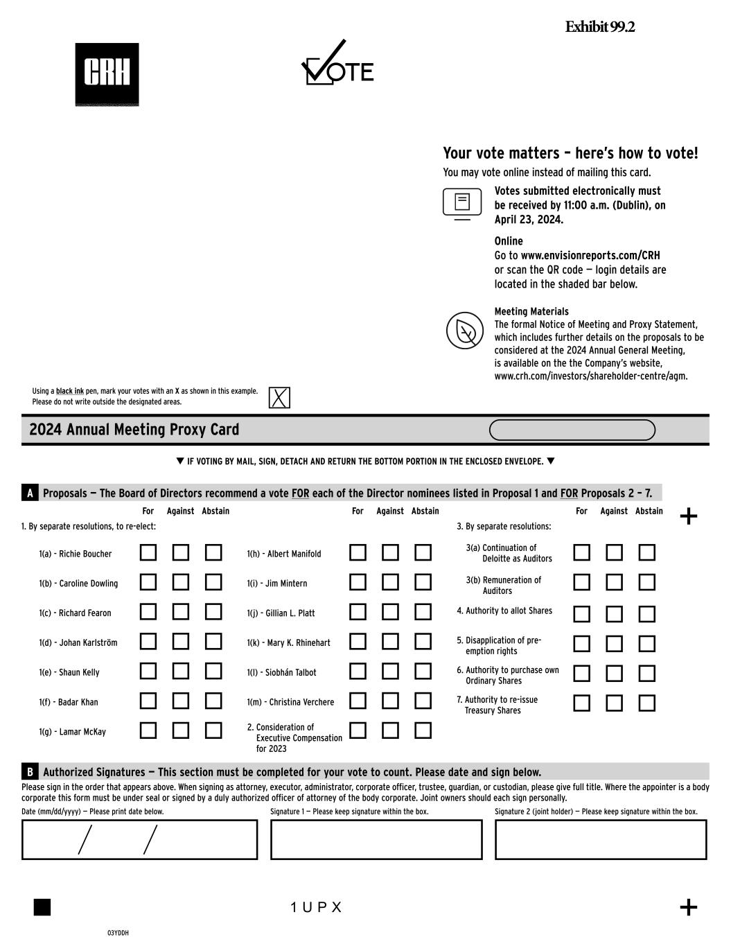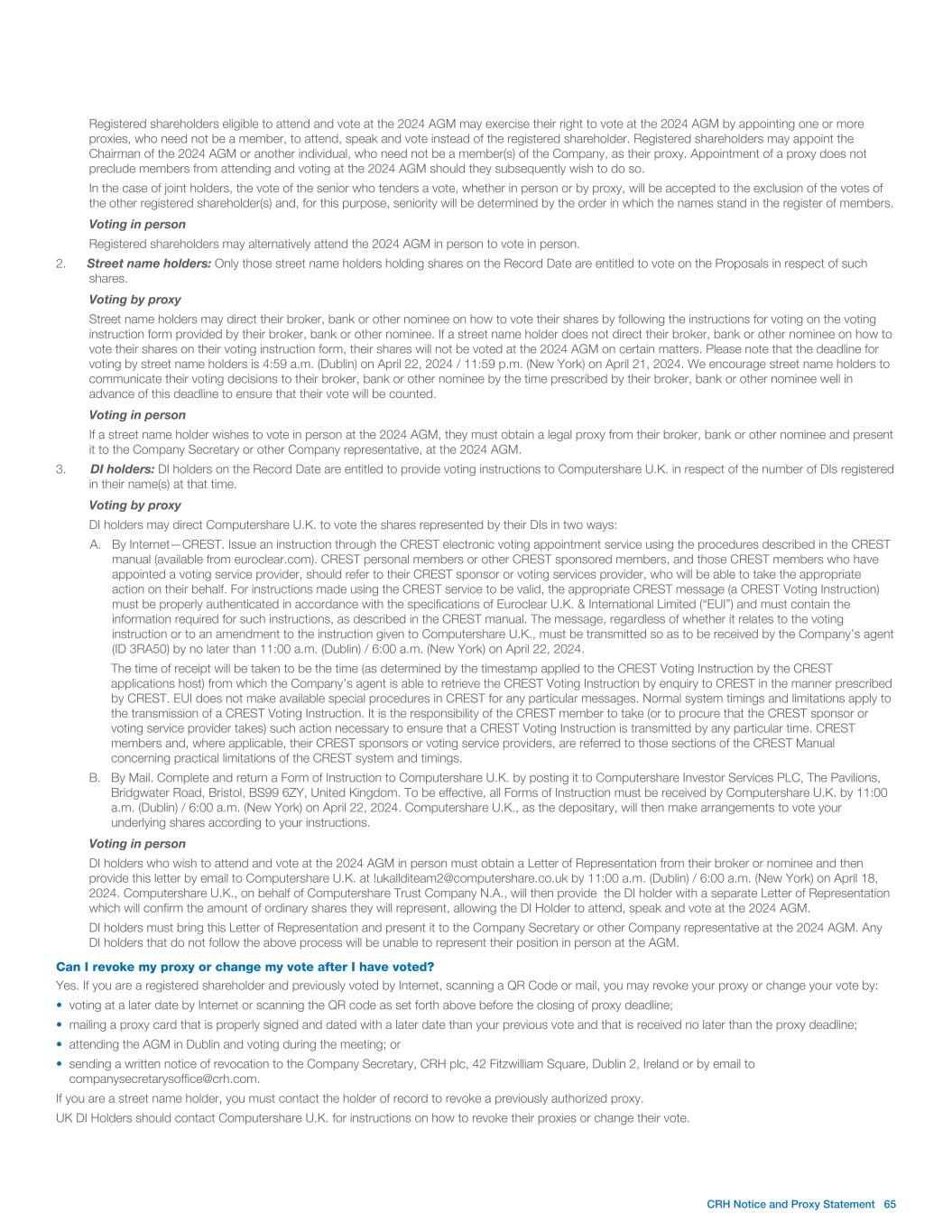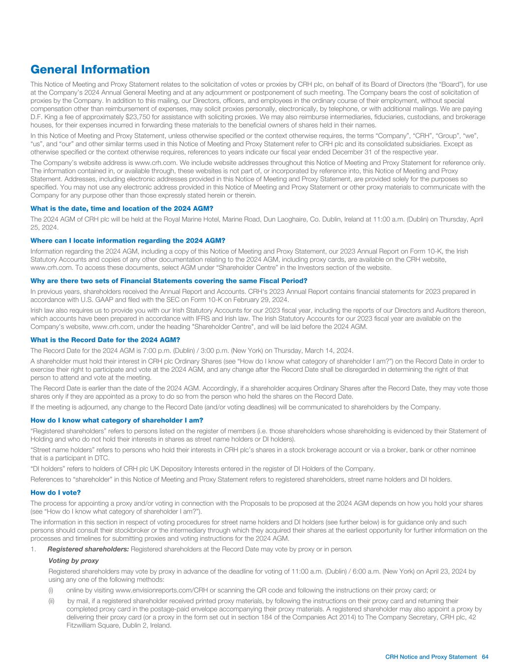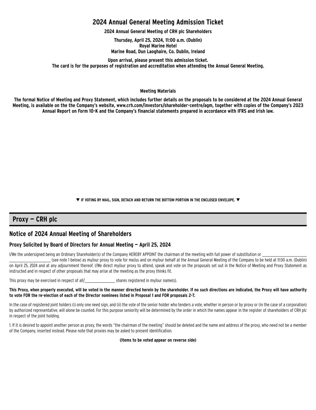 General Information This Notice of Meeting and Proxy Statement relates to the solicitation of votes or proxies by CRH plc, on behalf of its Board of Directors (the “Board”), for use at the Company’s 2024 Annual General Meeting and at any adjournment or postponement of such meeting. The Company bears the cost of solicitation of proxies by the Company. In addition to this mailing, our Directors, officers, and employees in the ordinary course of their employment, without special compensation other than reimbursement of expenses, may solicit proxies personally, electronically, by telephone, or with additional mailings. We are paying D.F. King a fee of approximately $23,750 for assistance with soliciting proxies. We may also reimburse intermediaries, fiduciaries, custodians, and brokerage houses, for their expenses incurred in forwarding these materials to the beneficial owners of shares held in their names. In this Notice of Meeting and Proxy Statement, unless otherwise specified or the context otherwise requires, the terms “Company”, “CRH”, “Group”, “we”, “us”, and “our” and other similar terms used in this Notice of Meeting and Proxy Statement refer to CRH plc and its consolidated subsidiaries. Except as otherwise specified or the context otherwise requires, references to years indicate our fiscal year ended December 31 of the respective year. The Company’s website address is www.crh.com. We include website addresses throughout this Notice of Meeting and Proxy Statement for reference only. The information contained in, or available through, these websites is not part of, or incorporated by reference into, this Notice of Meeting and Proxy Statement. Addresses, including electronic addresses provided in this Notice of Meeting and Proxy Statement, are provided solely for the purposes so specified. You may not use any electronic address provided in this Notice of Meeting and Proxy Statement or other proxy materials to communicate with the Company for any purpose other than those expressly stated herein or therein. What is the date, time and location of the 2024 AGM? The 2024 AGM of CRH plc will be held at the Royal Marine Hotel, Marine Road, Dun Laoghaire, Co. Dublin, Ireland at 11:00 a.m. (Dublin) on Thursday, April 25, 2024. Where can I locate information regarding the 2024 AGM? Information regarding the 2024 AGM, including a copy of this Notice of Meeting and Proxy Statement, our 2023 Annual Report on Form 10-K, the Irish Statutory Accounts and copies of any other documentation relating to the 2024 AGM, including proxy cards, are available on the CRH website, www.crh.com. To access these documents, select AGM under “Shareholder Centre” in the Investors section of the website. Why are there two sets of Financial Statements covering the same Fiscal Period? In previous years, shareholders received the Annual Report and Accounts. CRH's 2023 Annual Report contains financial statements for 2023 prepared in accordance with U.S. GAAP and filed with the SEC on Form 10-K on February 29, 2024. Irish law also requires us to provide you with our Irish Statutory Accounts for our 2023 fiscal year, including the reports of our Directors and Auditors thereon, which accounts have been prepared in accordance with IFRS and Irish law. The Irish Statutory Accounts for our 2023 fiscal year are available on the Company's website, www.crh.com, under the heading "Shareholder Centre", and will be laid before the 2024 AGM. What is the Record Date for the 2024 AGM? The Record Date for the 2024 AGM is 7:00 p.m. (Dublin) / 3:00 p.m. (New York) on Thursday, March 14, 2024. A shareholder must hold their interest in CRH plc Ordinary Shares (see “How do I know what category of shareholder I am?”) on the Record Date in order to exercise their right to participate and vote at the 2024 AGM, and any change after the Record Date shall be disregarded in determining the right of that person to attend and vote at the meeting. The Record Date is earlier than the date of the 2024 AGM. Accordingly, if a shareholder acquires Ordinary Shares after the Record Date, they may vote those shares only if they are appointed as a proxy to do so from the person who held the shares on the Record Date. If the meeting is adjourned, any change to the Record Date (and/or voting deadlines) will be communicated to shareholders by the Company. How do I know what category of shareholder I am? “Registered shareholders” refers to persons listed on the register of members (i.e. those shareholders whose shareholding is evidenced by their Statement of Holding and who do not hold their interests in shares as street name holders or DI holders). “Street name holders” refers to persons who hold their interests in CRH plc’s shares in a stock brokerage account or via a broker, bank or other nominee that is a participant in DTC. “DI holders” refers to holders of CRH plc UK Depository Interests entered in the register of DI Holders of the Company. References to “shareholder” in this Notice of Meeting and Proxy Statement refers to registered shareholders, street name holders and DI holders. How do I vote? The process for appointing a proxy and/or voting in connection with the Proposals to be proposed at the 2024 AGM depends on how you hold your shares (see “How do I know what category of shareholder I am?”). The information in this section in respect of voting procedures for street name holders and DI holders (see further below) is for guidance only and such persons should consult their stockbroker or the intermediary through which they acquired their shares at the earliest opportunity for further information on the processes and timelines for submitting proxies and voting instructions for the 2024 AGM. 1. Registered shareholders: Registered shareholders at the Record Date may vote by proxy or in person. Voting by proxy Registered shareholders may vote by proxy in advance of the deadline for voting of 11:00 