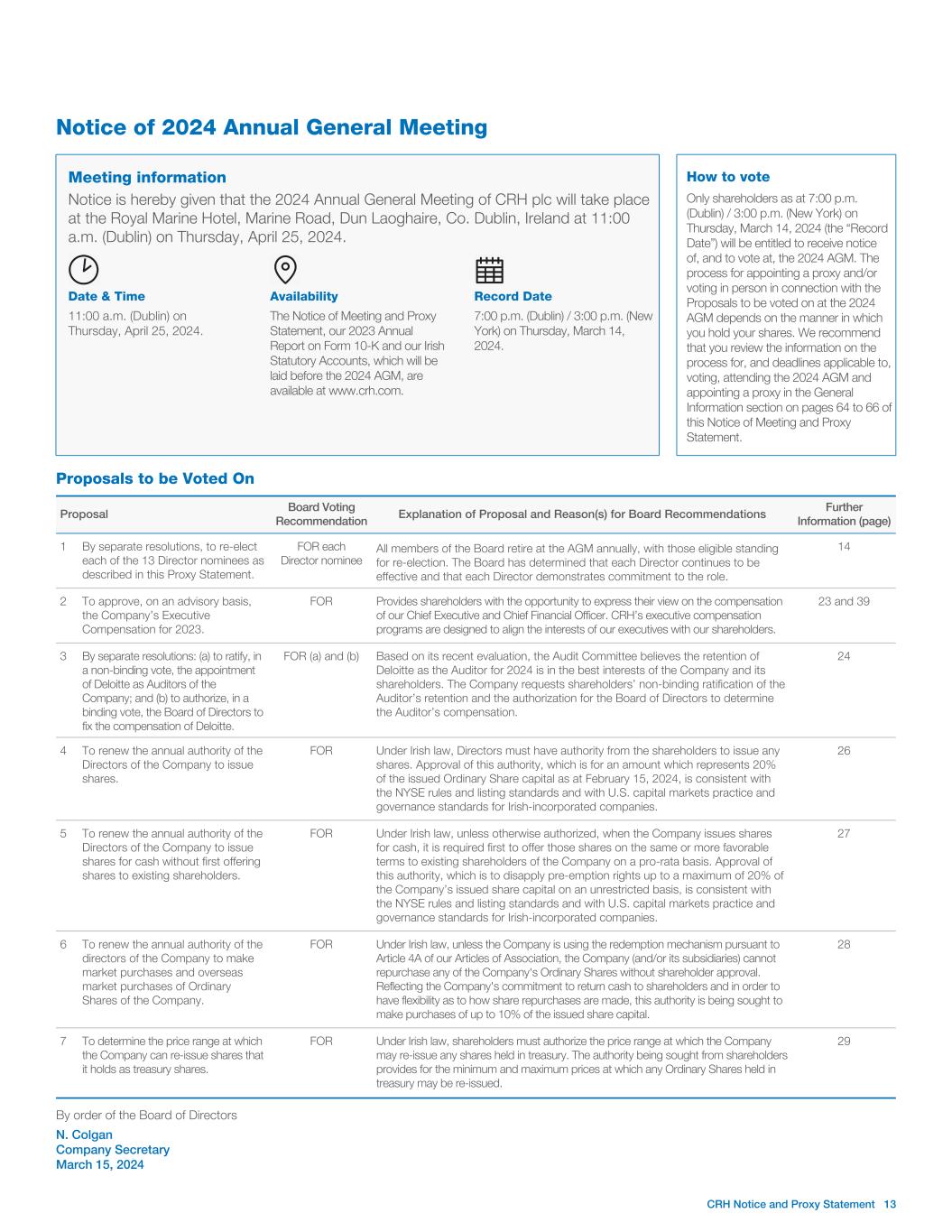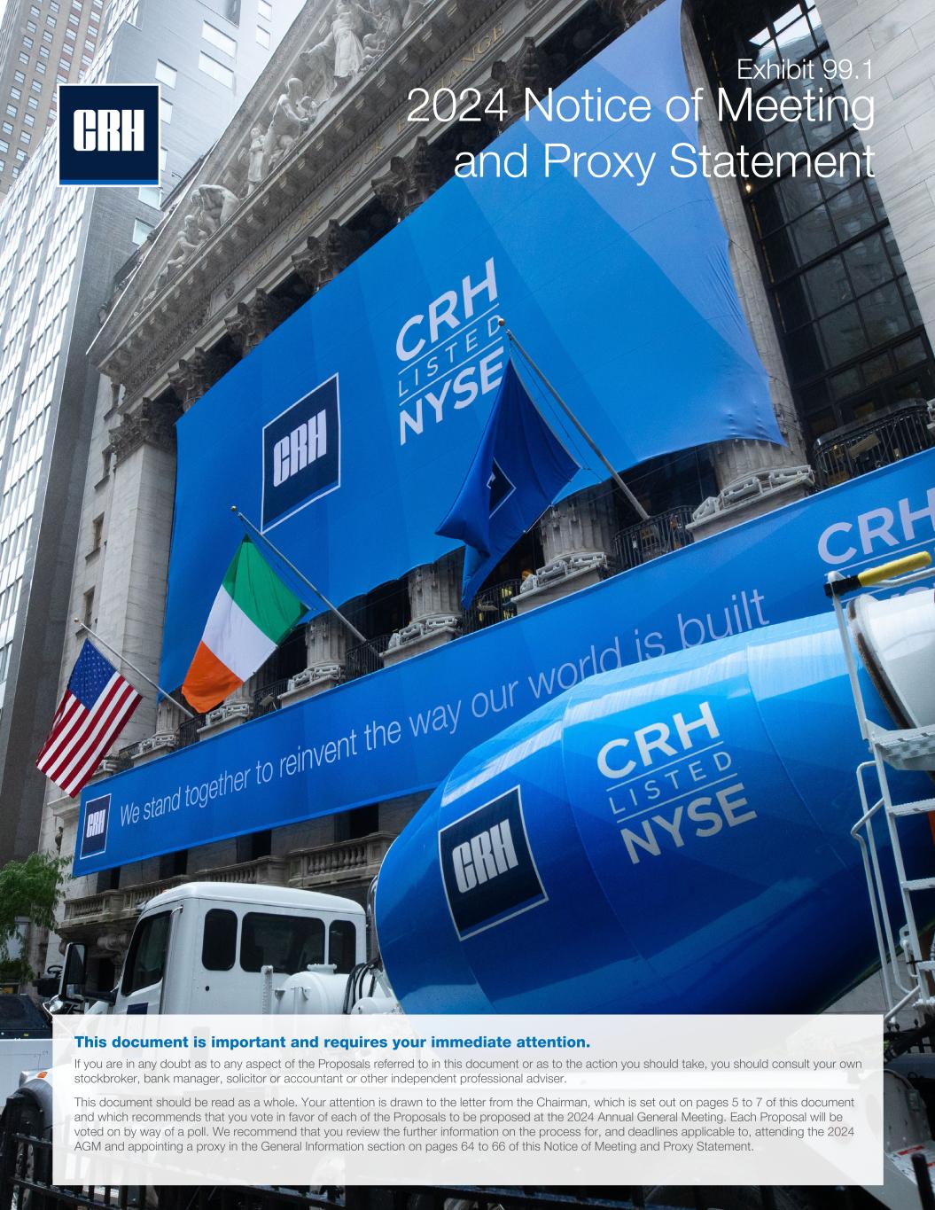 Notice of 2024 Annual General Meeting Meeting information How to vote Notice is hereby given that the 2024 Annual General Meeting of CRH plc will take place at the Royal Marine Hotel, Marine Road, Dun Laoghaire, Co. Dublin, Ireland at 11:00 a.m. (Dublin) on Thursday, April 25, 2024. Only shareholders as at 7:00 p.m. (Dublin) / 3:00 p.m. (New York) on Thursday, March 14, 2024 (the “Record Date”) will be entitled to receive notice of, and to vote at, the 2024 AGM. The process for appointing a proxy and/or voting in person in connection with the Proposals to be voted on at the 2024 AGM depends on the manner in which you hold your shares. We recommend that you review the information on the process for, and deadlines applicable to, voting, attending the 2024 AGM and appointing a proxy in the General Information section on pages 64 to 66 of this Notice of Meeting and Proxy Statement. Date & Time 11:00 a.m. (Dublin) on Thursday, April 25, 2024. Availability The Notice of Meeting and Proxy Statement, our 2023 Annual Report on Form 10-K and our Irish Statutory Accounts, which will be laid before the 2024 AGM, are available at www.crh.com. Record Date 7:00 p.m. (Dublin) / 3:00 p.m. (New York) on Thursday, March 14, 2024. Proposals to be Voted On Proposal Board Voting Recommendation Explanation of Proposal and Reason(s) for Board Recommendations Further Information (page) 1 By separate resolutions, to re-elect each of the 13 Director nominees as described in this Proxy Statement. FOR each Director nominee All members of the Board retire at the AGM annually, with those eligible standing for re-election. The Board has determined that each Director continues to be effective and that each Director demonstrates commitment to the role. 14 2 To approve, on an advisory basis, the Company’s Executive Compensation for 2023. FOR Provides shareholders with the opportunity to express their view on the compensation of our Chief Executive and Chief Financial Officer. CRH’s executive compensation programs are designed to align the interests of our executives with our shareholders. 23 and 39 3 By separate resolutions: (a) to ratify, in a non-binding vote, the appointment of Deloitte as Auditors of the Company; and (b) to authorize, in a binding vote, the Board of Directors to fix the compensation of Deloitte. FOR (a) and (b) Based on its recent evaluation, the Audit Committee believes the retention of Deloitte as the Auditor for 2024 is in the best interests of the Company and its shareholders. The Company requests shareholders’ non-binding ratification of the Auditor’s retention and the authorization for the Board of Directors to determine the Auditor’s compensation. 24 4 To renew the annual authority of the Directors of the Company to issue shares. FOR Under Irish law, Directors must have authority from the shareholders to issue any shares. Approval of this authority, which is for an amount which represents 20% of the issued Ordinary Share capital as at February 15, 2024, is consistent with the NYSE rules and listing standards and with U.S. capital markets practice and governance standards for Irish-incorporated companies. 26 5 To renew the annual authority of the Directors of the Company to issue shares for cash without first offering shares to existing shareholders. FOR Under Irish law, unless otherwise authorized, when the Company issues shares for cash, it is required first to offer those shares on the same or more favorable terms to existing shareholders of the Company on a pro-rata basis. Approval of this authority, which is to disapply pre-emption rights up to a maximum of 20% of the Company’s issued share capital on an unrestricted basis, is consistent with the NYSE rules and listing standards and with U.S. capital markets practice and governance standards for Irish-incorporated companies. 27 6 To renew the annual authority of the directors of the Company to make market purchases and overseas market purchases of Ordinary Shares of the Company. FOR Under Irish law, unless the Company is using the redemption mechanism pursuant to Article 4A of our Articles of Association, the Company (and/or its subsidiaries) cannot repurchase any of the Company's Ordinary Shares without shareholder approval. Reflecting the Company's commitment to return cash to shareholders and in order to have flexibility as to how share repurchases are made, this authority is being sought to make purchases of up to 10% of the issued share capital. 28 7 To determine the price range at which the Company can re-issue shares that it holds as treasury shares. FOR Under Irish law, shareholders must authorize the price range at which the Company may re-issue any shares held in treasury. The authority being sought from shareholders provides for the minimum and maximum prices at which any Ordinary Shares held in treasury may be re-issued. 29 By order of the Board of Directors N. Colgan Company Secretary March 15, 2024 CRH Notice and Proxy Statement 13
