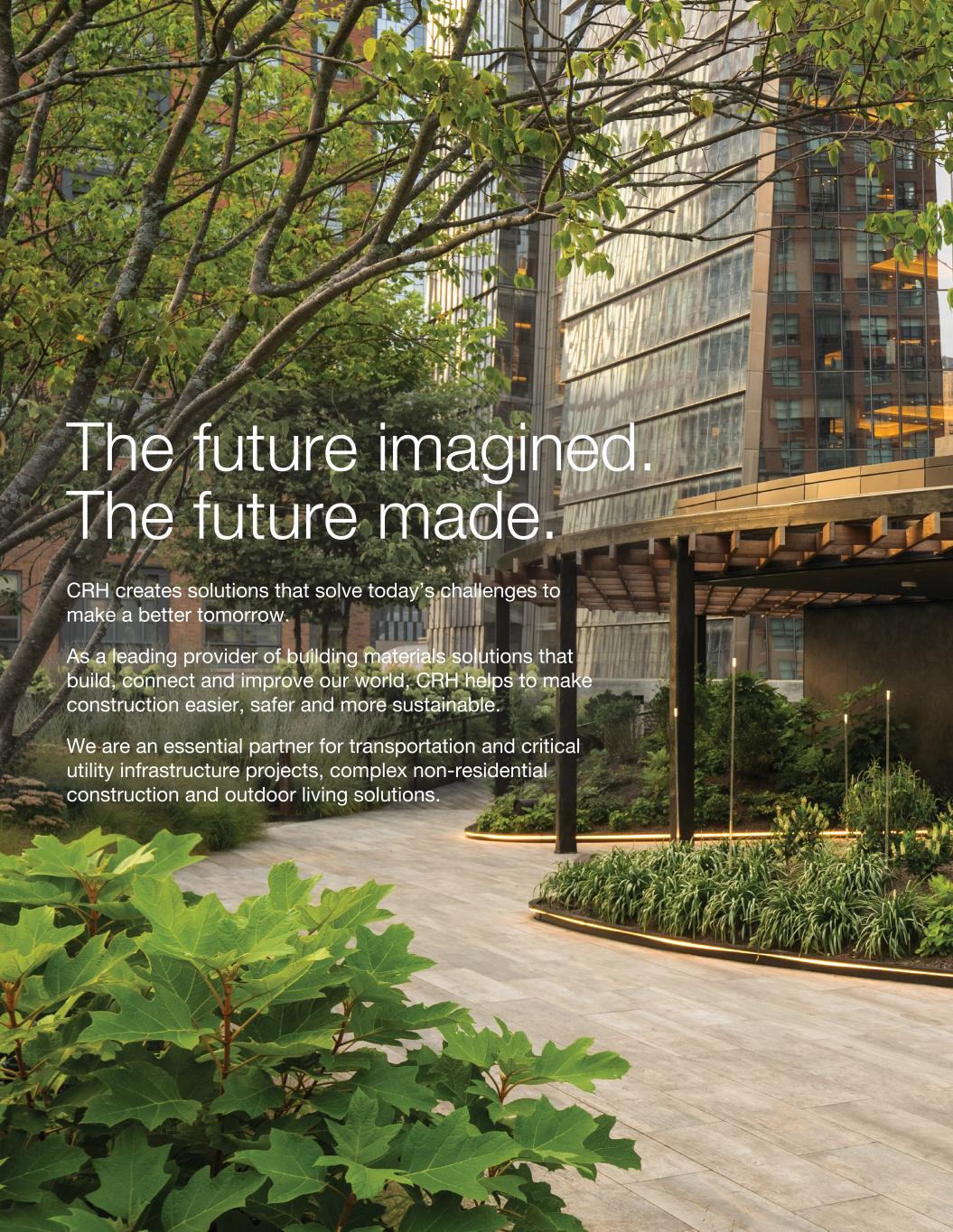 The future imagined. The future made. CRH creates solutions that solve today’s challenges to make a better tomorrow. As a leading provider of building materials solutions that build, connect and improve our world, CRH helps to make construction easier, safer and more sustainable. We are an essential partner for transportation and critical utility infrastructure projects, complex non-residential construction and outdoor living solutions.
