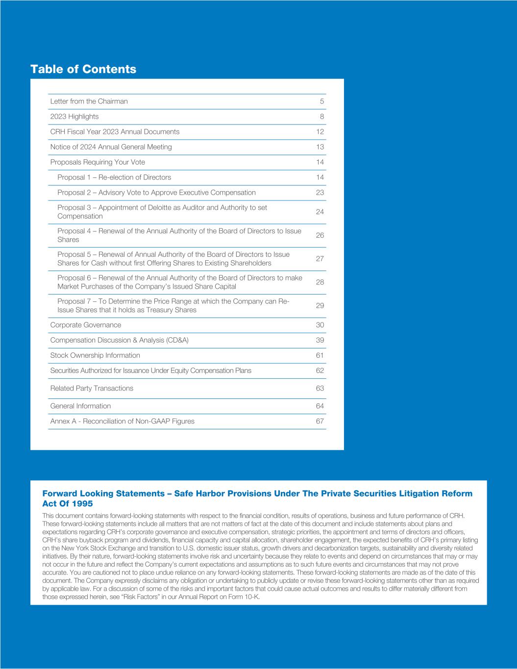 Table of Contents Letter from the Chairman 5 2023 Highlights 8 CRH Fiscal Year 2023 Annual Documents 12 Notice of 2024 Annual General Meeting 13 Proposals Requiring Your Vote 14 Proposal 1 – Re-election of Directors 14 Proposal 2 – Advisory Vote to Approve Executive Compensation 23 Proposal 3 – Appointment of Deloitte as Auditor and Authority to set Compensation 24 Proposal 4 – Renewal of the Annual Authority of the Board of Directors to Issue Shares 26 Proposal 5 – Renewal of Annual Authority of the Board of Directors to Issue Shares for Cash without first Offering Shares to Existing Shareholders 27 Proposal 6 – Renewal of the Annual Authority of the Board of Directors to make Market Purchases of the Company’s Issued Share Capital 28 Proposal 7 – To Determine the Price Range at which the Company can Re- Issue Shares that it holds as Treasury Shares 29 Corporate Governance 30 Compensation Discussion & Analysis (CD&A) 39 Stock Ownership Information 61 Securities Authorized for Issuance Under Equity Compensation Plans 62 Related Party Transactions 63 General Information 64 Annex A - Reconciliation of Non-GAAP Figures 67 Forward Looking Statements – Safe Harbor Provisions Under The Private Securities Litigation Reform Act Of 1995 This document contains forward-looking statements with respect to the financial condition, results of operations, business and future performance of CRH. These forward-looking statements include all matters that are not matters of fact at the date of this document and include statements about plans and expectations regarding CRH’s corporate governance and executive compensation, strategic priorities, the appointment and terms of directors and officers, CRH’s share buyback program and dividends, financial capacity and capital allocation, shareholder engagement, the expected benefits of CRH’s primary listing on the New York Stock Exchange and transition to U.S. domestic issuer status, growth drivers and decarbonization targets, sustainability and diversity related initiatives. By their nature, forward-looking statements involve risk and uncertainty because they relate to events and depend on circumstances that may or may not occur in the future and reflect the Company’s current expectations and assumptions as to such future events and circumstances that may not prove accurate. You are cautioned not to place undue reliance on any forward-looking statements. These forward-looking statements are made as of the date of this document. The Company expressly disclaims any obligation or undertaking to publicly update or revise these forward-looking statements other than as required by applicable law. For a discussion of some of the risks and important factors that could cause actual outcomes and results to differ materially different from those expressed herein, see “Risk Factors” in our Annual Report on Form 10-K.