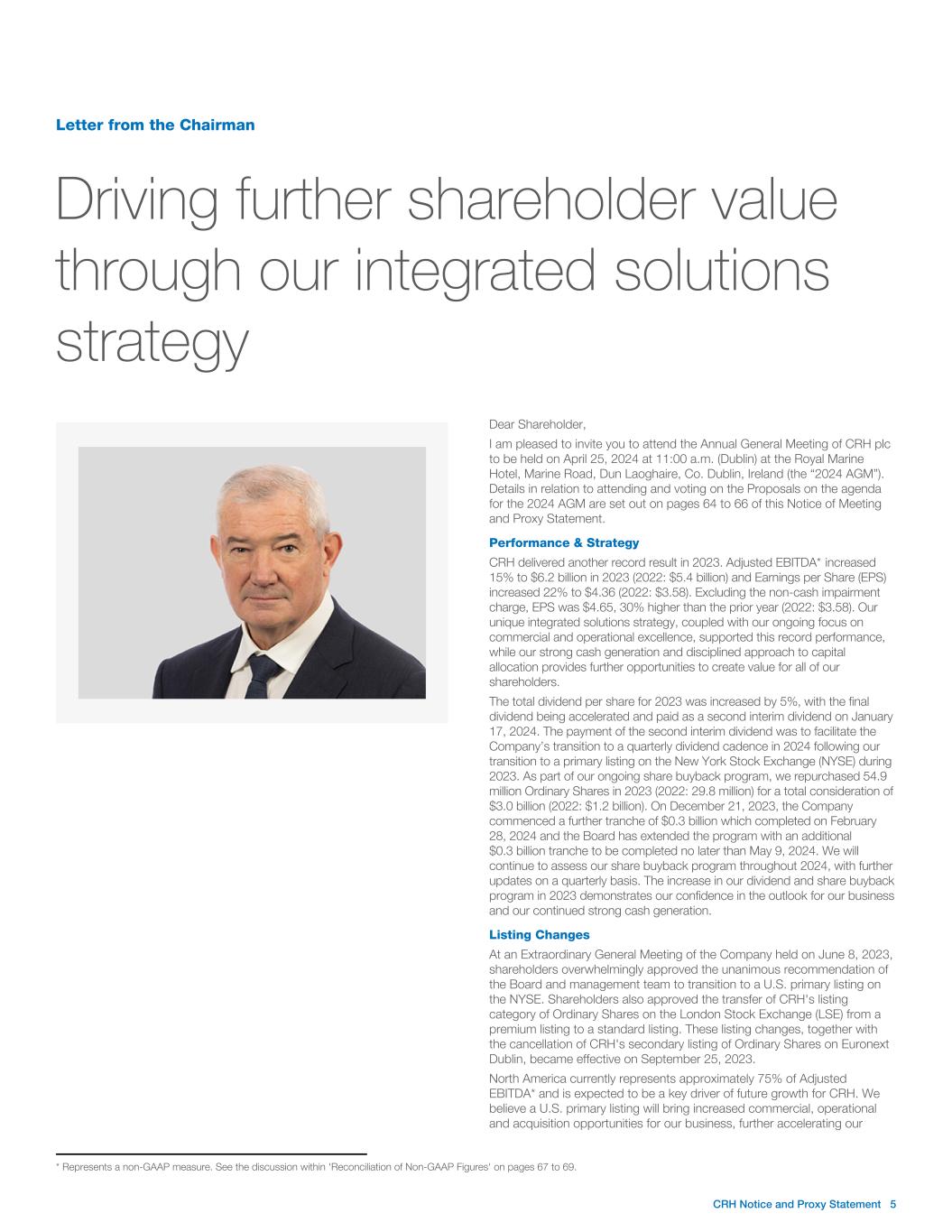 Letter from the Chairman Dear Shareholder, I am pleased to invite you to attend the Annual General Meeting of CRH plc to be held on April 25, 2024 at 11:00 a.m. (Dublin) at the Royal Marine Hotel, Marine Road, Dun Laoghaire, Co. Dublin, Ireland (the “2024 AGM”). Details in relation to attending and voting on the Proposals on the agenda for the 2024 AGM are set out on pages 64 to 66 of this Notice of Meeting and Proxy Statement. Performance & Strategy CRH delivered another record result in 2023. Adjusted EBITDA*1increased 15% to $6.2 billion in 2023 (2022: $5.4 billion) and Earnings per Share (EPS) increased 22% to $4.36 (2022: $3.58). Excluding the non-cash impairment charge, EPS was $4.65, 30% higher than the prior year (2022: $3.58). Our unique integrated solutions strategy, coupled with our ongoing focus on commercial and operational excellence, supported this record performance, while our strong cash generation and disciplined approach to capital allocation provides further opportunities to create value for all of our shareholders. The total dividend per share for 2023 was increased by 5%, with the final dividend being accelerated and paid as a second interim dividend on January 17, 2024. The payment of the second interim dividend was to facilitate the Company’s transition to a quarterly dividend cadence in 2024 following our transition to a primary listing on the New York Stock Exchange (NYSE) during 2023. As part of our ongoing share buyback program, we repurchased 54.9 million Ordinary Shares in 2023 (2022: 29.8 million) for a total consideration of $3.0 billion (2022: $1.2 billion). On December 21, 2023, the Company commenced a further tranche of $0.3 billion which completed on February 28, 2024 and the Board has extended the program with an additional $0.3 billion tranche to be completed no later than May 9, 2024. We will continue to assess our share buyback program throughout 2024, with further updates on a quarterly basis. The increase in our dividend and share buyback program in 2023 demonstrates our confidence in the outlook for our business and our continued strong cash generation. Listing Changes At an Extraordinary General Meeting of the Company held on June 8, 2023, shareholders overwhelmingly approved the unanimous recommendation of the Board and management team to transition to a U.S. primary listing on the NYSE. Shareholders also approved the transfer of CRH's listing category of Ordinary Shares on the London Stock Exchange (LSE) from a premium listing to a standard listing. These listing changes, together with the cancellation of CRH's secondary listing of Ordinary Shares on Euronext Dublin, became effective on September 25, 2023. North America currently represents approximately 75% of Adjusted EBITDA* and is expected to be a key driver of future growth for CRH. We believe a U.S. primary listing will bring increased commercial, operational and acquisition opportunities for our business, further accelerating our CRH Notice and Proxy Statement 5 * Represents a non-GAAP measure. See the discussion within 'Reconciliation of Non-GAAP Figures' on pages 67 to 69. 1 Driving further shareholder value through our integrated solutions strategy