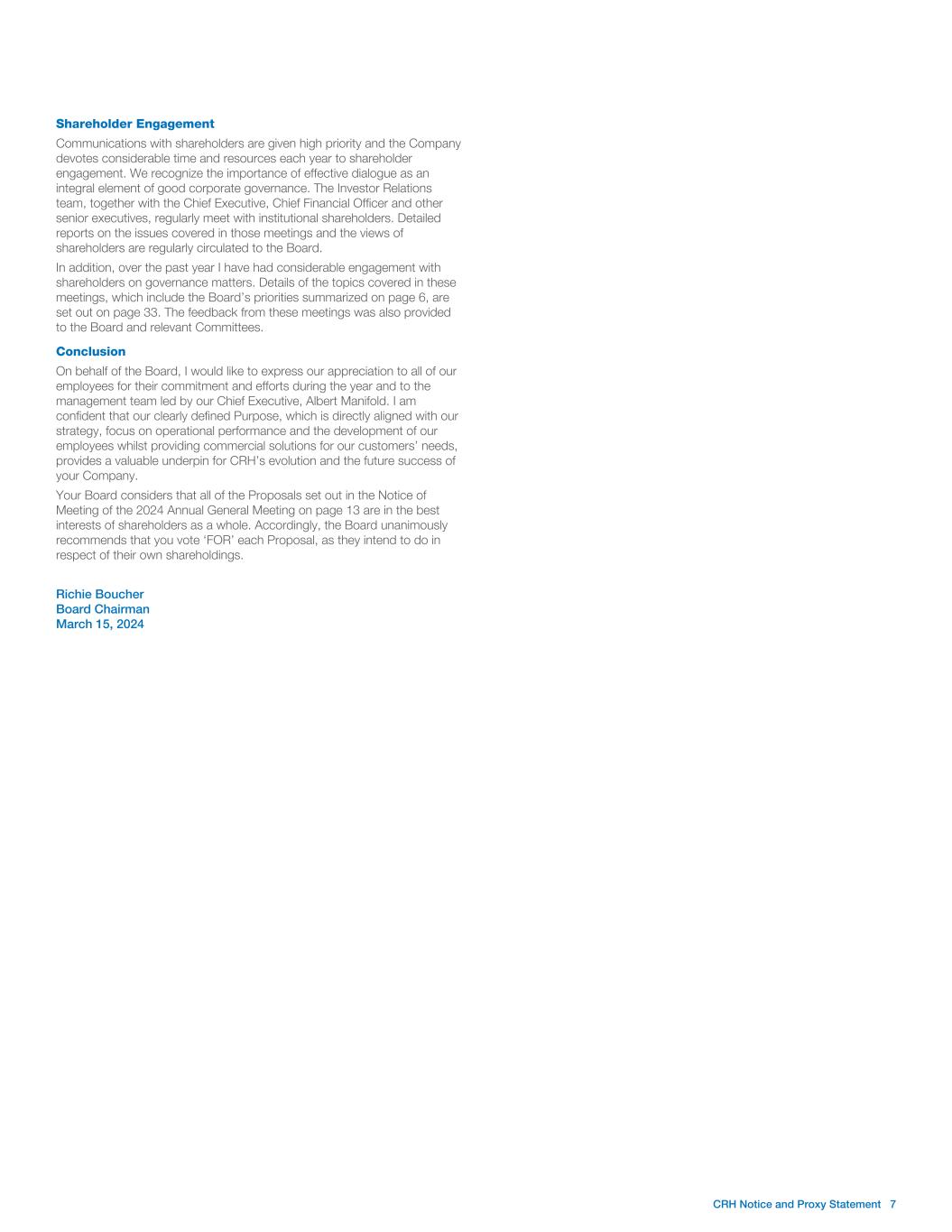Shareholder Engagement Communications with shareholders are given high priority and the Company devotes considerable time and resources each year to shareholder engagement. We recognize the importance of effective dialogue as an integral element of good corporate governance. The Investor Relations team, together with the Chief Executive, Chief Financial Officer and other senior executives, regularly meet with institutional shareholders. Detailed reports on the issues covered in those meetings and the views of shareholders are regularly circulated to the Board. In addition, over the past year I have had considerable engagement with shareholders on governance matters. Details of the topics covered in these meetings, which include the Board’s priorities summarized on page 6, are set out on page 33. The feedback from these meetings was also provided to the Board and relevant Committees. Conclusion On behalf of the Board, I would like to express our appreciation to all of our employees for their commitment and efforts during the year and to the management team led by our Chief Executive, Albert Manifold. I am confident that our clearly defined Purpose, which is directly aligned with our strategy, focus on operational performance and the development of our employees whilst providing commercial solutions for our customers’ needs, provides a valuable underpin for CRH’s evolution and the future success of your Company. Your Board considers that all of the Proposals set out in the Notice of Meeting of the 2024 Annual General Meeting on page 13 are in the best interests of shareholders as a whole. Accordingly, the Board unanimously recommends that you vote ‘FOR’ each Proposal, as they intend to do in respect of their own shareholdings. Richie Boucher Board Chairman March 15, 2024 CRH Notice and Proxy Statement 7