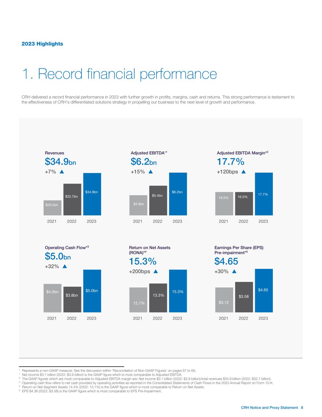 1,2 CRH Notice and Proxy Statement 8 * Represents a non-GAAP measure. See the discussion within 'Reconciliation of Non-GAAP Figures' on pages 67 to 69. 1 Net income $3.1 billion (2022: $3.9 billion) is the GAAP figure which is most comparable to Adjusted EBITDA. 2 The GAAP figures which are most comparable to Adjusted EBITDA margin are: Net income $3.1 billion (2022: $3.9 billion)/total revenues $34.9 billion (2022: $32.7 billion). 3 Operating cash flow refers to net cash provided by operating activities as reported in the Consolidated Statements of Cash Flows in the 2023 Annual Report on Form 10-K. 4 Return on Net Segment Assets 14.4% (2022: 13.1%) is the GAAP figure which is most comparable to Return on Net Assets. 5 EPS $4.36 (2022: $3.58) is the GAAP figure which is most comparable to EPS Pre-Impairment. 2 2021 2022 2023 Revenues $34.9bn +7% p $32.7bn $34.9bn $29.2bn 2021 2022 2023 Adjusted EBITDA*1 $6.2bn +15% p $5.4bn $6.2bn $4.8bn 2021 2022 2023 Adjusted EBITDA Margin*2 17.7% +120bps p 16.5% 17.7% 16.5% 2021 2022 2023 Operating Cash Flow*3 $5.0bn +32% p $3.8bn $5.0bn $4.0bn 2021 2022 2023 Return on Net Assets (RONA)*4 15.3% +200bps p 13.3% 15.3% 12.7% 2021 2022 2023 Earnings Per Share (EPS) Pre-impairment*5 $4.65 +30% p $3.58 $4.65 $3.12 2023 Highlights 1. Record financial performance CRH delivered a record financial performance in 2023 with further growth in profits, margins, cash and returns. This strong performance is testament to the effectiveness of CRH's differentiated solutions strategy in propelling our business to the next level of growth and performance.