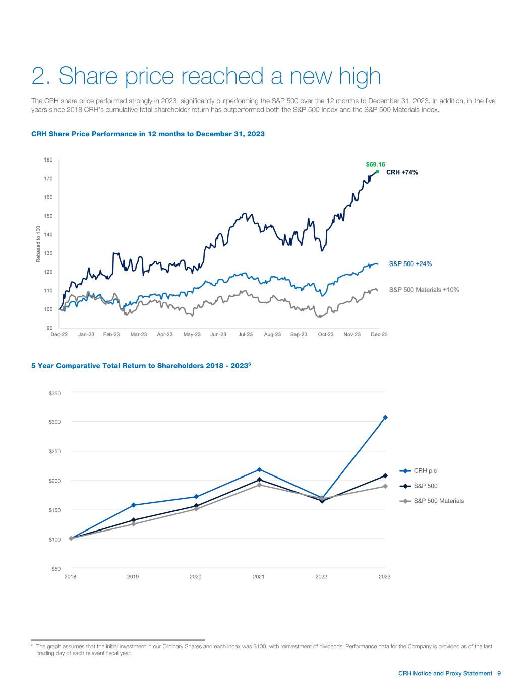 2. Share price reached a new high The CRH share price performed strongly in 2023, significantly outperforming the S&P 500 over the 12 months to December 31, 2023. In addition, in the five years since 2018 CRH’s cumulative total shareholder return has outperformed both the S&P 500 Index and the S&P 500 Materials Index. CRH Share Price Performance in 12 months to December 31, 2023 5 Year Comparative Total Return to Shareholders 2018 - 202363 CRH plc S&P 500 S&P 500 Materials 2018 2019 2020 2021 2022 2023 $50 $100 $150 $200 $250 $300 $350 CRH Notice and Proxy Statement 9 6 The graph assumes that the initial investment in our Ordinary Shares and each index was $100, with reinvestment of dividends. Performance data for the Company is provided as of the last trading day of each relevant fiscal year.3