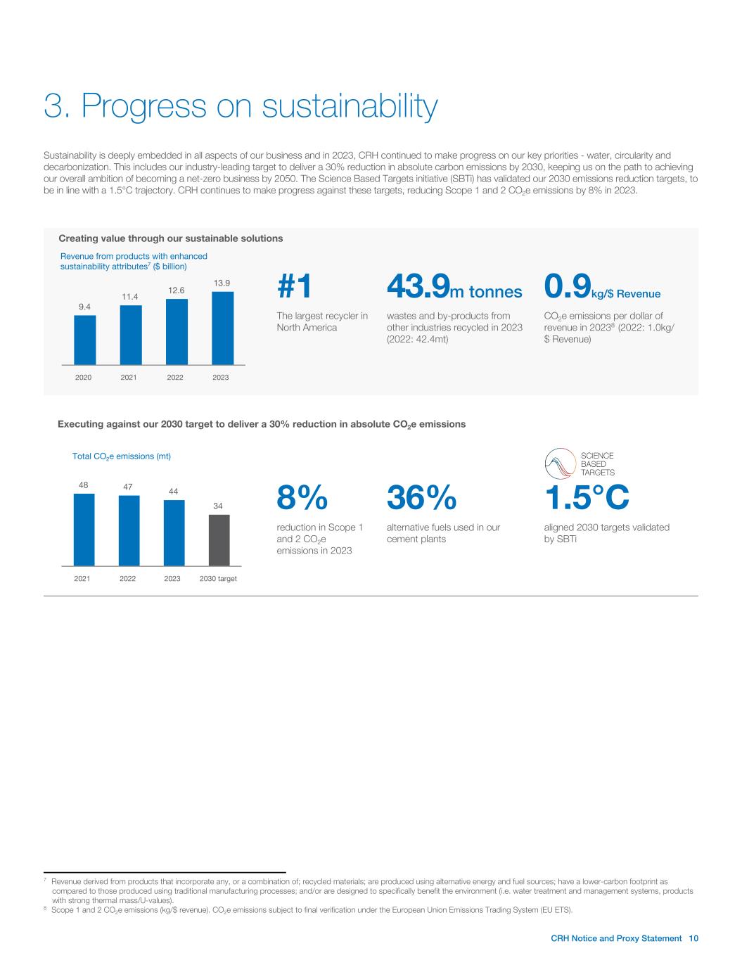 3. Progress on sustainability4 Sustainability is deeply embedded in all aspects of our business and in 2023, CRH continued to make progress on our key priorities - water, circularity and decarbonization. This includes our industry-leading target to deliver a 30% reduction in absolute carbon emissions by 2030, keeping us on the path to achieving our overall ambition of becoming a net-zero business by 2050. The Science Based Targets initiative (SBTi) has validated our 2030 emissions reduction targets, to be in line with a 1.5°C trajectory. CRH continues to make progress against these targets, reducing Scope 1 and 2 CO2e emissions by 8% in 2023.5 Creating value through our sustainable solutions #1 43.9m tonnes 0.9kg/$ Revenue The largest recycler in North America wastes and by-products from other industries recycled in 2023 (2022: 42.4mt) CO2e emissions per dollar of revenue in 20238 (2022: 1.0kg/ $ Revenue) Executing against our 2030 target to deliver a 30% reduction in absolute CO2e emissions 8% 36% 1.5°C reduction in Scope 1 and 2 CO2e emissions in 2023 alternative fuels used in our cement plants aligned 2030 targets validated by SBTi CRH Notice and Proxy Statement 10 74 Revenue derived from products that incorporate any, or a combination of; recycled materials; are produced using alternative energy and fuel sources; have a lower-carbon footprint as compared to those produced using traditional manufacturing processes; and/or are designed to specifically benefit the environment (i.e. water treatment and management systems, products with strong thermal mass/U-values). 85 Scope 1 and 2 CO2e emissions (kg/$ revenue). CO2e emissions subject to final verification under the European Union Emissions Trading System (EU ETS). 9.4 11.4 12.6 13.9 2020 2021 2022 2023 Revenue from products with enhanced sustainability attributes7 ($ billion) 48 47 44 34 2021 2022 2023 2030 target Total CO2e emissions (mt)