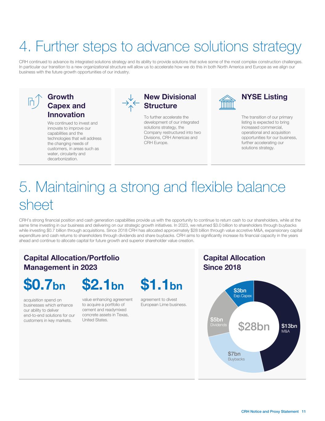 4. Further steps to advance solutions strategy CRH continued to advance its integrated solutions strategy and its ability to provide solutions that solve some of the most complex construction challenges. In particular our transition to a new organizational structure will allow us to accelerate how we do this in both North America and Europe as we align our business with the future growth opportunities of our industry. Growth Capex and Innovation New Divisional Structure NYSE Listing To further accelerate the development of our integrated solutions strategy, the Company restructured into two Divisions, CRH Americas and CRH Europe. The transition of our primary listing is expected to bring increased commercial, operational and acquisition opportunities for our business, further accelerating our solutions strategy. We continued to invest and innovate to improve our capabilities and the technologies that will address the changing needs of customers, in areas such as water, circularity and decarbonization. 5. Maintaining a strong and flexible balance sheet CRH’s strong financial position and cash generation capabilities provide us with the opportunity to continue to return cash to our shareholders, while at the same time investing in our business and delivering on our strategic growth initiatives. In 2023, we returned $3.0 billion to shareholders through buybacks while investing $0.7 billion through acquisitions. Since 2018 CRH has allocated approximately $28 billion through value accretive M&A, expansionary capital expenditure and cash returns to shareholders through dividends and share buybacks. CRH aims to significantly increase its financial capacity in the years ahead and continue to allocate capital for future growth and superior shareholder value creation. Capital Allocation/Portfolio Management in 2023 Capital Allocation Since 2018 $0.7bn acquisition spend on businesses which enhance our ability to deliver end-to-end solutions for our customers in key markets. $2.1bn value enhancing agreement to acquire a portfolio of cement and readymixed concrete assets in Texas, United States. $1.1bn agreement to divest European Lime business. CRH Notice and Proxy Statement 11