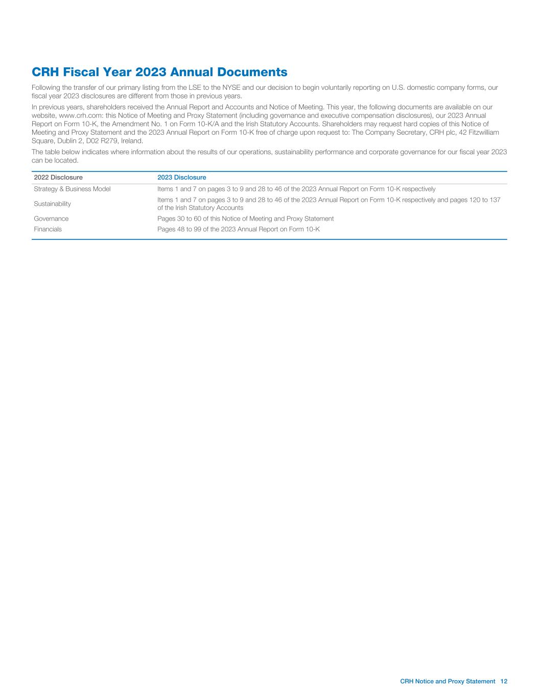 CRH Fiscal Year 2023 Annual Documents Following the transfer of our primary listing from the LSE to the NYSE and our decision to begin voluntarily reporting on U.S. domestic company forms, our fiscal year 2023 disclosures are different from those in previous years. In previous years, shareholders received the Annual Report and Accounts and Notice of Meeting. This year, the following documents are available on our website, www.crh.com: this Notice of Meeting and Proxy Statement (including governance and executive compensation disclosures), our 2023 Annual Report on Form 10-K, the Amendment No. 1 on Form 10-K/A and the Irish Statutory Accounts. Shareholders may request hard copies of this Notice of Meeting and Proxy Statement and the 2023 Annual Report on Form 10-K free of charge upon request to: The Company Secretary, CRH plc, 42 Fitzwilliam Square, Dublin 2, D02 R279, Ireland. The table below indicates where information about the results of our operations, sustainability performance and corporate governance for our fiscal year 2023 can be located. 2022 Disclosure 2023 Disclosure Strategy & Business Model Items 1 and 7 on pages 3 to 9 and 28 to 46 of the 2023 Annual Report on Form 10-K respectively Sustainability Items 1 and 7 on pages 3 to 9 and 28 to 46 of the 2023 Annual Report on Form 10-K respectively and pages 120 to 137 of the Irish Statutory Accounts Governance Pages 30 to 60 of this Notice of Meeting and Proxy Statement Financials Pages 48 to 99 of the 2023 Annual Report on Form 10-K CRH Notice and Proxy Statement 12