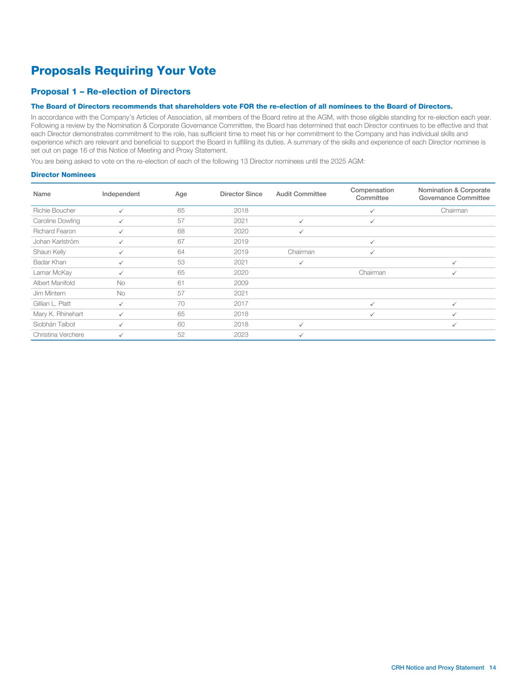 Proposals Requiring Your Vote Proposal 1 – Re-election of Directors The Board of Directors recommends that shareholders vote FOR the re-election of all nominees to the Board of Directors. In accordance with the Company’s Articles of Association, all members of the Board retire at the AGM, with those eligible standing for re-election each year. Following a review by the Nomination & Corporate Governance Committee, the Board has determined that each Director continues to be effective and that each Director demonstrates commitment to the role, has sufficient time to meet his or her commitment to the Company and has individual skills and experience which are relevant and beneficial to support the Board in fulfilling its duties. A summary of the skills and experience of each Director nominee is set out on page 16 of this Notice of Meeting and Proxy Statement. You are being asked to vote on the re-election of each of the following 13 Director nominees until the 2025 AGM: Director Nominees Name Independent Age Director Since Audit Committee Compensation Committee Nomination & Corporate Governance Committee Richie Boucher ü 65 2018 ü Chairman Caroline Dowling ü 57 2021 ü ü Richard Fearon ü 68 2020 ü Johan Karlström ü 67 2019 ü Shaun Kelly ü 64 2019 Chairman ü Badar Khan ü 53 2021 ü ü Lamar McKay ü 65 2020 Chairman ü Albert Manifold No 61 2009 Jim Mintern No 57 2021 Gillian L. Platt ü 70 2017 ü ü Mary K. Rhinehart ü 65 2018 ü ü Siobhán Talbot ü 60 2018 ü ü Christina Verchere ü 52 2023 ü CRH Notice and Proxy Statement 14