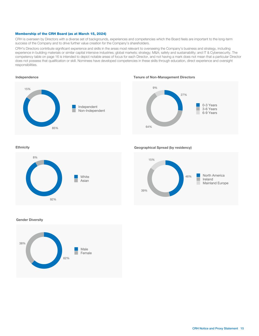 Membership of the CRH Board (as at March 15, 2024) CRH is overseen by Directors with a diverse set of backgrounds, experiences and competencies which the Board feels are important to the long-term success of the Company and to drive further value creation for the Company’s shareholders. CRH’s Directors contribute significant experience and skills in the areas most relevant to overseeing the Company’s business and strategy, including experience in building materials or similar capital intensive industries; global markets; strategy; M&A; safety and sustainability; and IT & Cybersecurity. The competency table on page 16 is intended to depict notable areas of focus for each Director, and not having a mark does not mean that a particular Director does not possess that qualification or skill. Nominees have developed competencies in these skills through education, direct experience and oversight responsibilities. CRH Notice and Proxy Statement 15 85% 15% Independent Non-Independent Independence 27% 64% 9% 0-3 Years 3-6 Years 6-9 Years Tenure of Non-Management Directors 92% 8% White Asian Ethnicity 46% 39% 15% North America Ireland Mainland Europe Geographical Spread (by residency) 62% 38% Male Female Gender Diversity