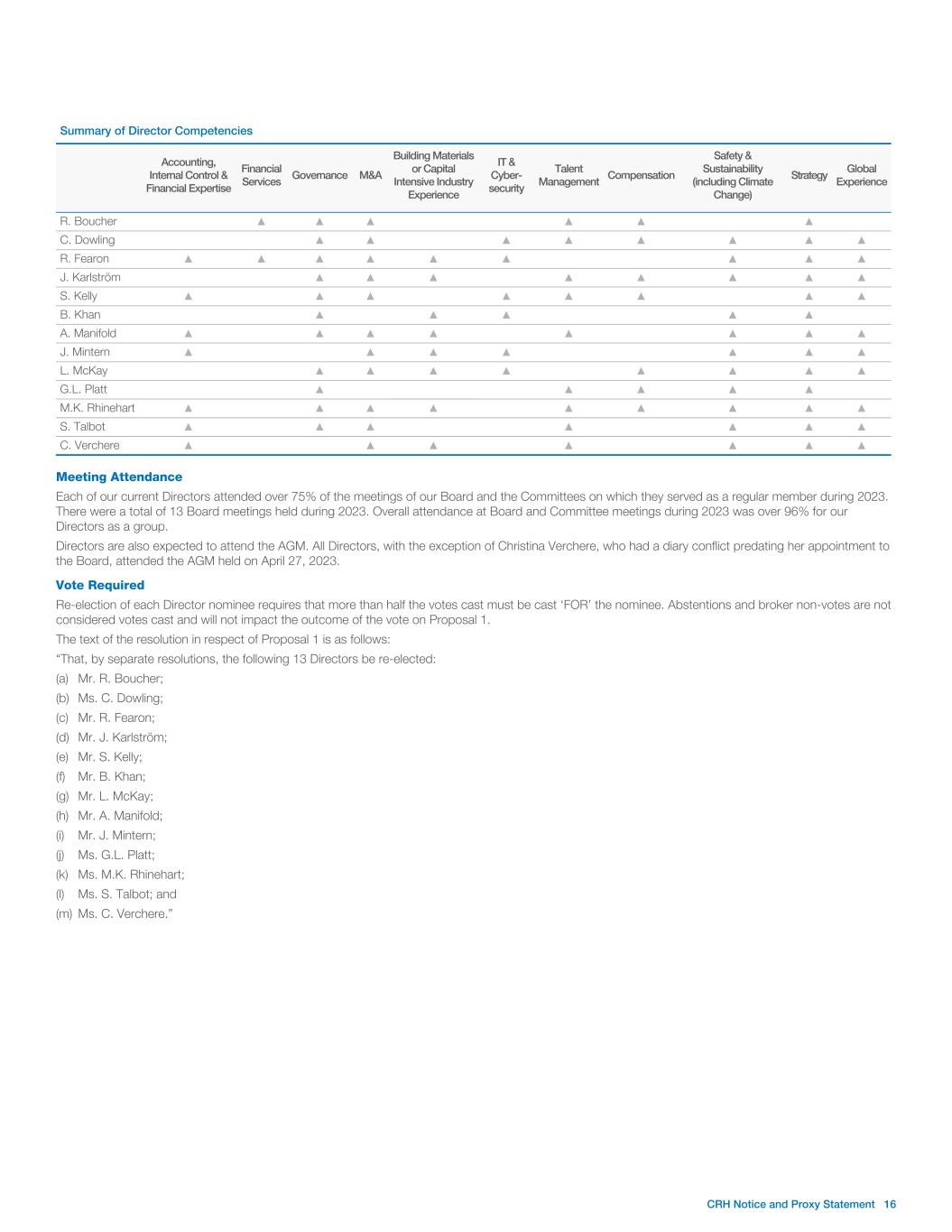 Summary of Director Competencies Accounting, Internal Control & Financial Expertise Financial Services Governance M&A Building Materials or Capital Intensive Industry Experience IT & Cyber- security Talent Management Compensation Safety & Sustainability (including Climate Change) Strategy Global Experience R. Boucher ▲ ▲ ▲ ▲ ▲ ▲ C. Dowling ▲ ▲ ▲ ▲ ▲ ▲ ▲ ▲ R. Fearon ▲ ▲ ▲ ▲ ▲ ▲ ▲ ▲ ▲ J. Karlström ▲ ▲ ▲ ▲ ▲ ▲ ▲ ▲ S. Kelly ▲ ▲ ▲ ▲ ▲ ▲ ▲ ▲ B. Khan ▲ ▲ ▲ ▲ ▲ A. Manifold ▲ ▲ ▲ ▲ ▲ ▲ ▲ ▲ J. Mintern ▲ ▲ ▲ ▲ ▲ ▲ ▲ L. McKay ▲ ▲ ▲ ▲ ▲ ▲ ▲ ▲ G.L. Platt ▲ ▲ ▲ ▲ ▲ M.K. Rhinehart ▲ ▲ ▲ ▲ ▲ ▲ ▲ ▲ ▲ S. Talbot ▲ ▲ ▲ ▲ ▲ ▲ ▲ C. Verchere ▲ ▲ ▲ ▲ ▲ ▲ ▲ Meeting Attendance Each of our current Directors attended over 75% of the meetings of our Board and the Committees on which they served as a regular member during 2023. There were a total of 13 Board meetings held during 2023. Overall attendance at Board and Committee meetings during 2023 was over 96% for our Directors as a group. Directors are also expected to attend the AGM. All Directors, with the exception of Christina Verchere, who had a diary conflict predating her appointment to the Board, attended the AGM held on April 27, 2023. Vote Required Re-election of each Director nominee requires that more than half the votes cast must be cast ‘FOR’ the nominee. Abstentions and broker non-votes are not considered votes cast and will not impact the outcome of the vote on Proposal 1. The text of the resolution in respect of Proposal 1 is as follows: “That, by separate resolutions, the following 13 Directors be re-elected: (a) Mr. R. Boucher; (b) Ms. C. Dowling; (c) Mr. R. Fearon; (d) Mr. J. Karlström; (e) Mr. S. Kelly; (f) Mr. B. Khan; (g) Mr. L. McKay; (h) Mr. A. Manifold; (i) Mr. J. Mintern; (j) Ms. G.L. Platt; (k) Ms. M.K. Rhinehart; (l) Ms. S. Talbot; and (m) Ms. C. Verchere.” CRH Notice and Proxy Statement 16