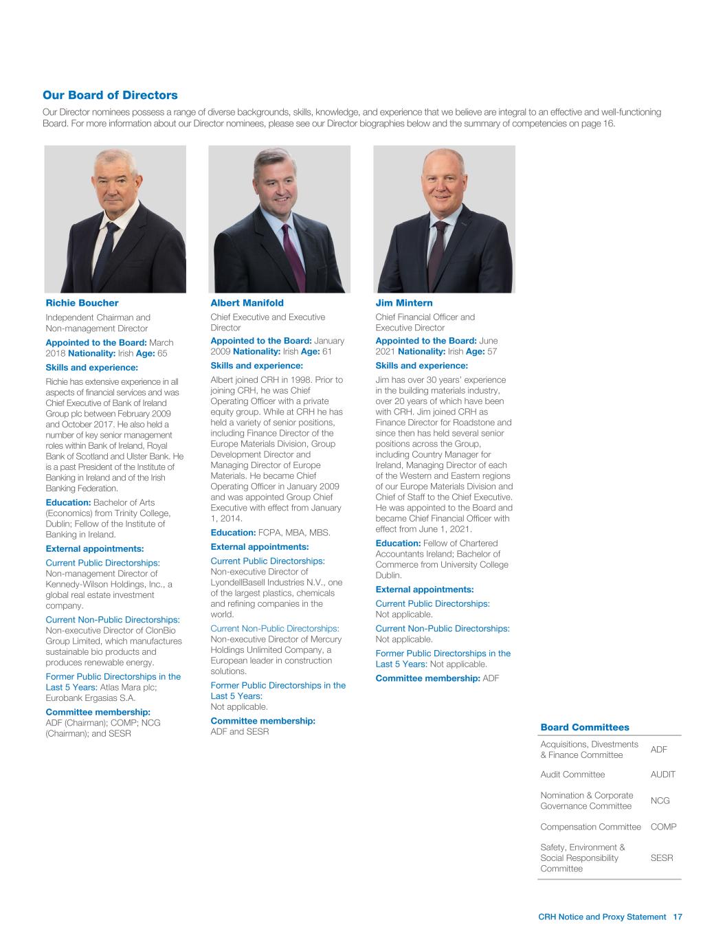 Our Board of Directors Our Director nominees possess a range of diverse backgrounds, skills, knowledge, and experience that we believe are integral to an effective and well-functioning Board. For more information about our Director nominees, please see our Director biographies below and the summary of competencies on page 16. Richie Boucher Independent Chairman and Non-management Director Appointed to the Board: March 2018 Nationality: Irish Age: 65 Skills and experience: Richie has extensive experience in all aspects of financial services and was Chief Executive of Bank of Ireland Group plc between February 2009 and October 2017. He also held a number of key senior management roles within Bank of Ireland, Royal Bank of Scotland and Ulster Bank. He is a past President of the Institute of Banking in Ireland and of the Irish Banking Federation. Education: Bachelor of Arts (Economics) from Trinity College, Dublin; Fellow of the Institute of Banking in Ireland. External appointments: Current Public Directorships: Non-management Director of Kennedy-Wilson Holdings, Inc., a global real estate investment company. Current Non-Public Directorships: Non-executive Director of ClonBio Group Limited, which manufactures sustainable bio products and produces renewable energy. Former Public Directorships in the Last 5 Years: Atlas Mara plc; Eurobank Ergasias S.A. Committee membership: ADF (Chairman); COMP; NCG (Chairman); and SESR Albert Manifold Chief Executive and Executive Director Appointed to the Board: January 2009 Nationality: Irish Age: 61 Skills and experience: Albert joined CRH in 1998. Prior to joining CRH, he was Chief Operating Officer with a private equity group. While at CRH he has held a variety of senior positions, including Finance Director of the Europe Materials Division, Group Development Director and Managing Director of Europe Materials. He became Chief Operating Officer in January 2009 and was appointed Group Chief Executive with effect from January 1, 2014. Education: FCPA, MBA, MBS. External appointments: Current Public Directorships: Non-executive Director of LyondellBasell Industries N.V., one of the largest plastics, chemicals and refining companies in the world. Current Non-Public Directorships: Non-executive Director of Mercury Holdings Unlimited Company, a European leader in construction solutions. Former Public Directorships in the Last 5 Years: Not applicable. Committee membership: ADF and SESR Jim Mintern Chief Financial Officer and Executive Director Appointed to the Board: June 2021 Nationality: Irish Age: 57 Skills and experience: Jim has over 30 years’ experience in the building materials industry, over 20 years of which have been with CRH. Jim joined CRH as Finance Director for Roadstone and since then has held several senior positions across the Group, including Country Manager for Ireland, Managing Director of each of the Western and Eastern regions of our Europe Materials Division and Chief of Staff to the Chief Executive. He was appointed to the Board and became Chief Financial Officer with effect from June 1, 2021. Education: Fellow of Chartered Accountants Ireland; Bachelor of Commerce from University College Dublin. External appointments: Current Public Directorships: Not applicable. Current Non-Public Directorships: Not applicable. Former Public Directorships in the Last 5 Years: Not applicable. Committee membership: ADF Board Committees Acquisitions, Divestments & Finance Committee ADF Audit Committee AUDIT Nomination & Corporate Governance Committee NCG Compensation Committee COMP Safety, Environment & Social Responsibility Committee SESR CRH Notice and Proxy Statement 17