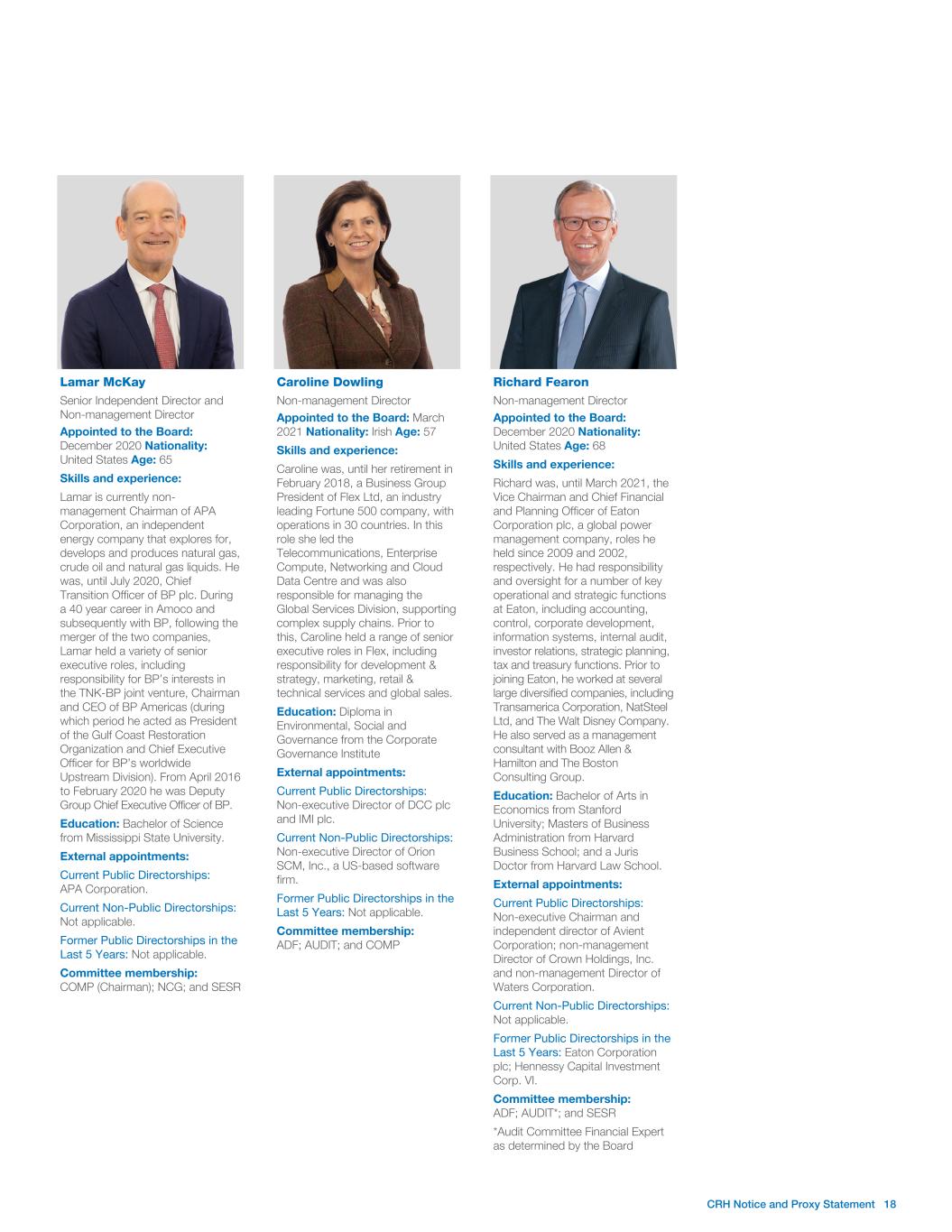 Lamar McKay Senior Independent Director and Non-management Director Appointed to the Board: December 2020 Nationality: United States Age: 65 Skills and experience: Lamar is currently non‐ management Chairman of APA Corporation, an independent energy company that explores for, develops and produces natural gas, crude oil and natural gas liquids. He was, until July 2020, Chief Transition Officer of BP plc. During a 40 year career in Amoco and subsequently with BP, following the merger of the two companies, Lamar held a variety of senior executive roles, including responsibility for BP’s interests in the TNK-BP joint venture, Chairman and CEO of BP Americas (during which period he acted as President of the Gulf Coast Restoration Organization and Chief Executive Officer for BP’s worldwide Upstream Division). From April 2016 to February 2020 he was Deputy Group Chief Executive Officer of BP. Education: Bachelor of Science from Mississippi State University. External appointments: Current Public Directorships: APA Corporation. Current Non-Public Directorships: Not applicable. Former Public Directorships in the Last 5 Years: Not applicable. Committee membership: COMP (Chairman); NCG; and SESR Caroline Dowling Non-management Director Appointed to the Board: March 2021 Nationality: Irish Age: 57 Skills and experience: Caroline was, until her retirement in February 2018, a Business Group President of Flex Ltd, an industry leading Fortune 500 company, with operations in 30 countries. In this role she led the Telecommunications, Enterprise Compute, Networking and Cloud Data Centre and was also responsible for managing the Global Services Division, supporting complex supply chains. Prior to this, Caroline held a range of senior executive roles in Flex, including responsibility for development & strategy, marketing, retail & technical services and global sales. Education: Diploma in Environmental, Social and Governance from the Corporate Governance Institute External appointments: Current Public Directorships: Non-executive Director of DCC plc and IMI plc. Current Non-Public Directorships: Non-executive Director of Orion SCM, Inc., a US-based software firm. Former Public Directorships in the Last 5 Years: Not applicable. Committee membership: ADF; AUDIT; and COMP Richard Fearon Non-management Director Appointed to the Board: December 2020 Nationality: United States Age: 68 Skills and experience: Richard was, until March 2021, the Vice Chairman and Chief Financial and Planning Officer of Eaton Corporation plc, a global power management company, roles he held since 2009 and 2002, respectively. He had responsibility and oversight for a number of key operational and strategic functions at Eaton, including accounting, control, corporate development, information systems, internal audit, investor relations, strategic planning, tax and treasury functions. Prior to joining Eaton, he worked at several large diversified companies, including Transamerica Corporation, NatSteel Ltd, and The Walt Disney Company. He also served as a management consultant with Booz Allen & Hamilton and The Boston Consulting Group. Education: Bachelor of Arts in Economics from Stanford University; Masters of Business Administration from Harvard Business School; and a Juris Doctor from Harvard Law School. External appointments: Current Public Directorships: Non-executive Chairman and independent director of Avient Corporation; non-management Director of Crown Holdings, Inc. and non-management Director of Waters Corporation. Current Non-Public Directorships: Not applicable. Former Public Directorships in the Last 5 Years: Eaton Corporation plc; Hennessy Capital Investment Corp. VI. Committee membership: ADF; AUDIT*; and SESR *Audit Committee Financial Expert as determined by the Board CRH Notice and Proxy Statement 18