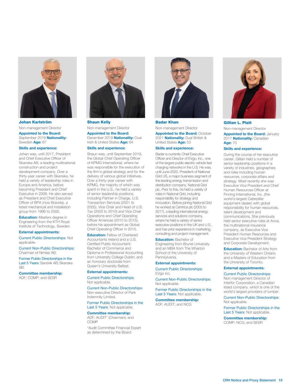 Johan Karlström Non-management Director Appointed to the Board: September 2019 Nationality: Swedish Age: 67 Skills and experience: Johan was, until 2017, President and Chief Executive Officer of Skanska AB, a leading multinational construction and project development company. Over a thirty-year career with Skanska, he held a variety of leadership roles in Europe and America, before becoming President and Chief Executive in 2008. He also served as President and Chief Executive Officer of BPA (now Bravida), a listed mechanical and installation group from 1996 to 2000. Education: Masters degree in Engineering from the KTH Royal Institute of Technology, Sweden. External appointments: Current Public Directorships: Not applicable. Current Non-Public Directorships: Chairman of Nimlas AB. Former Public Directorships in the Last 5 Years: Sandvik AB; Skanska SB. Committee membership: ADF; COMP; and SESR Shaun Kelly Non-management Director Appointed to the Board: December 2019 Nationality: Dual Irish & United States Age: 64 Skills and experience: Shaun was, until September 2019, the Global Chief Operating Officer of KPMG International, where he was responsible for the execution of the firm’s global strategy and for the delivery of various global initiatives. Over a thirty-year career with KPMG, the majority of which was spent in the U.S., he held a variety of senior leadership positions, including Partner in Charge, U.S. Transaction Services (2001 to 2005), Vice Chair and Head of U.S. Tax (2005 to 2010) and Vice Chair Operations and Chief Operating Officer Americas (2010 to 2015), before his appointment as Global Chief Operating Officer in 2015. Education: Fellow of Chartered Accountants Ireland and a U.S. Certified Public Accountant; Bachelor of Commerce and Diploma in Professional Accounting from University College Dublin; and an honorary doctorate from Queen’s University Belfast. External appointments: Current Public Directorships: Not applicable. Current Non-Public Directorships: Non-executive Director of Park Indemnity Limited. Former Public Directorships in the Last 5 Years: Not applicable. Committee membership: ADF; AUDIT* (Chairman); and COMP *Audit Committee Financial Expert as determined by the Board Badar Khan Non-management Director Appointed to the Board: October 2021 Nationality: Dual British & United States Age: 53 Skills and experience: Badar is currently Chief Executive Officer and Director of EVgo, Inc., one of the largest public electric vehicle fast charging networks in the U.S. He was, until June 2022, President of National Grid US, a major business segment of the leading energy transmission and distribution company, National Grid plc. Prior to this, he held a variety of roles in National Grid, including responsibility for strategy and innovation. Before joining National Grid he worked at Centrica plc (2003 to 2017), a leading international energy services and solutions company, where he held a variety of senior executive positions in the UK and U.S., and has prior experience in marketing, consulting and project management. Education: Bachelor of Engineering from Brunel University and an MBA from The Wharton School of the University of Pennsylvania. External appointments: Current Public Directorships: EVgo Inc. Current Non-Public Directorships: Not applicable. Former Public Directorships in the Last 5 Years: Not applicable. Committee membership: ADF; AUDIT; and NCG Gillian L. Platt Non-management Director Appointed to the Board: January 2017 Nationality: Canadian Age: 70 Skills and experience: During the course of her executive career, Gillian held a number of senior leadership positions in a variety of industries, geographies and roles including human resources, corporate affairs and strategy. Most recently she was Executive Vice President and Chief Human Resources Officer at Finning International, Inc. (the world’s largest Caterpillar equipment dealer) with global responsibility for human resources, talent development and communications. She previously held senior executive roles at Aviva, the multinational insurance company, as Executive Vice President Human Resources and Executive Vice President Strategy and Corporate Development. Education: Bachelor of Arts from the University of Western Ontario and a Masters of Education from the University of Toronto. External appointments: Current Public Directorships: Non-management Director of Interfor Corporation, a Canadian listed company, which is one of the world’s largest providers of lumber. Current Non-Public Directorships: Not applicable. Former Public Directorships in the Last 5 Years: Not applicable. Committee membership: COMP; NCG; and SESR CRH Notice and Proxy Statement 19