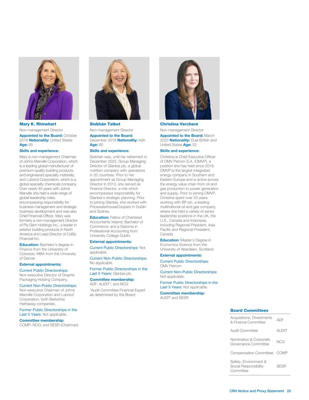 Mary K. Rhinehart Non-management Director Appointed to the Board: October 2018 Nationality: United States Age: 65 Skills and experience: Mary is non‐management Chairman of Johns Manville Corporation, which is a leading global manufacturer of premium-quality building products and engineered specialty materials, and Lubrizol Corporation, which is a global specialty chemicals company. Over nearly 40 years with Johns Manville she held a wide range of global leadership roles, encompassing responsibility for business management and strategic business development and was also Chief Financial Officer. Mary was formerly a non‐management Director of Ply Gem Holdings Inc., a leader in exterior building products in North America and Lead Director of CoBiz Financial Inc. Education: Bachelor’s degree in Finance from the University of Colorado; MBA from the University of Denver. External appointments: Current Public Directorships: Non-executive Director of Graphic Packaging Holding Company. Current Non-Public Directorships: Non-executive Chairman of Johns Manville Corporation and Lubrizol Corporation, both Berkshire Hathaway companies. Former Public Directorships in the Last 5 Years: Not applicable. Committee membership: COMP; NCG; and SESR (Chairman) Siobhán Talbot Non-management Director Appointed to the Board: December 2018 Nationality: Irish Age: 60 Skills and experience: Siobhán was, until her retirement in December 2023, Group Managing Director of Glanbia plc, a global nutrition company with operations in 32 countries. Prior to her appointment as Group Managing Director in 2013, she served as Finance Director, a role which encompassed responsibility for Glanbia’s strategic planning. Prior to joining Glanbia, she worked with PricewaterhouseCoopers in Dublin and Sydney. Education: Fellow of Chartered Accountants Ireland; Bachelor of Commerce; and a Diploma in Professional Accounting from University College Dublin. External appointments: Current Public Directorships: Not applicable. Current Non-Public Directorships: No applicable. Former Public Directorships in the Last 5 Years: Glanbia plc. Committee membership: ADF; AUDIT*; and NCG *Audit Committee Financial Expert as determined by the Board Christina Verchere Non-management Director Appointed to the Board: March 2023 Nationality: Dual British and United States Age: 52 Skills and experience: Christina is Chief Executive Officer of OMV Petrom S.A. (OMVP), a position she has held since 2018. OMVP is the largest integrated energy company in Southern and Eastern Europe and is active across the energy value chain from oil and gas production to power generation and supply. Prior to joining OMVP, Christina spent over 20 years working with BP plc, a leading multinational oil and gas company, where she held a variety of senior leadership positions in the UK, the U.S., Canada and Indonesia, including Regional President, Asia Pacific and Regional President, Canada. Education: Master’s Degree in Economics Science from the University of Aberdeen, Scotland. External appointments: Current Public Directorships: OMV Petrom Current Non-Public Directorships: Not applicable. Former Public Directorships in the Last 5 Years: Not applicable. Committee membership: AUDIT and SESR Board Committees Acquisitions, Divestments & Finance Committee ADF Audit Committee AUDIT Nomination & Corporate Governance Committee NCG Compensation Committee COMP Safety, Environment & Social Responsibility Committee SESR CRH Notice and Proxy Statement 20
