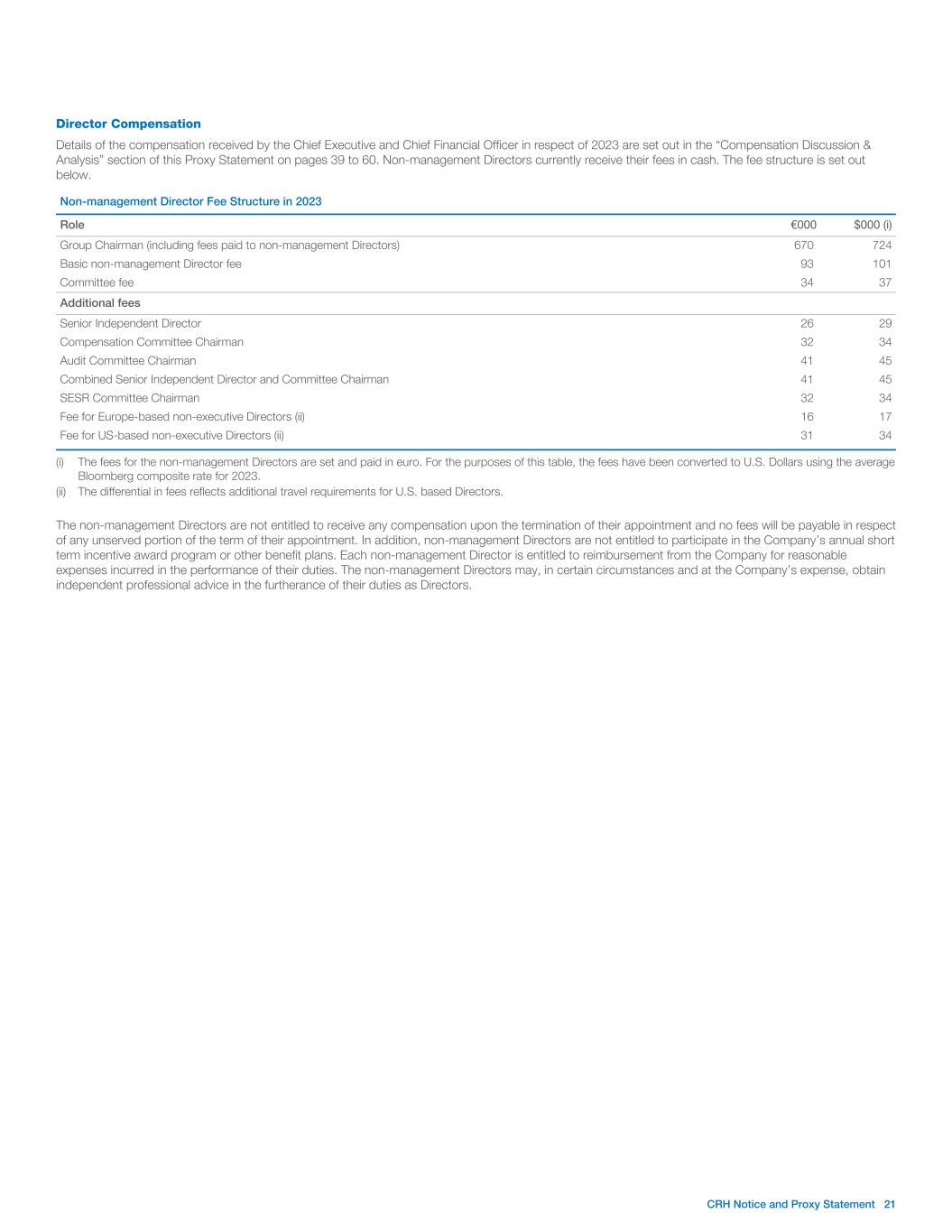 Director Compensation Details of the compensation received by the Chief Executive and Chief Financial Officer in respect of 2023 are set out in the “Compensation Discussion & Analysis” section of this Proxy Statement on pages 39 to 60. Non-management Directors currently receive their fees in cash. The fee structure is set out below. Non-management Director Fee Structure in 2023 Role €000 $000 (i) Group Chairman (including fees paid to non-management Directors) 670 724 Basic non-management Director fee 93 101 Committee fee 34 37 Additional fees Senior Independent Director 26 29 Compensation Committee Chairman 32 34 Audit Committee Chairman 41 45 Combined Senior Independent Director and Committee Chairman 41 45 SESR Committee Chairman 32 34 Fee for Europe-based non-executive Directors (ii) 16 17 Fee for US-based non-executive Directors (ii) 31 34 (i) The fees for the non-management Directors are set and paid in euro. For the purposes of this table, the fees have been converted to U.S. Dollars using the average Bloomberg composite rate for 2023. (ii) The differential in fees reflects additional travel requirements for U.S. based Directors. The non-management Directors are not entitled to receive any compensation upon the termination of their appointment and no fees will be payable in respect of any unserved portion of the term of their appointment. In addition, non-management Directors are not entitled to participate in the Company’s annual short term incentive award program or other benefit plans. Each non-management Director is entitled to reimbursement from the Company for reasonable expenses incurred in the performance of their duties. The non-management Directors may, in certain circumstances and at the Company’s expense, obtain independent professional advice in the furtherance of their duties as Directors. CRH Notice and Proxy Statement 21
