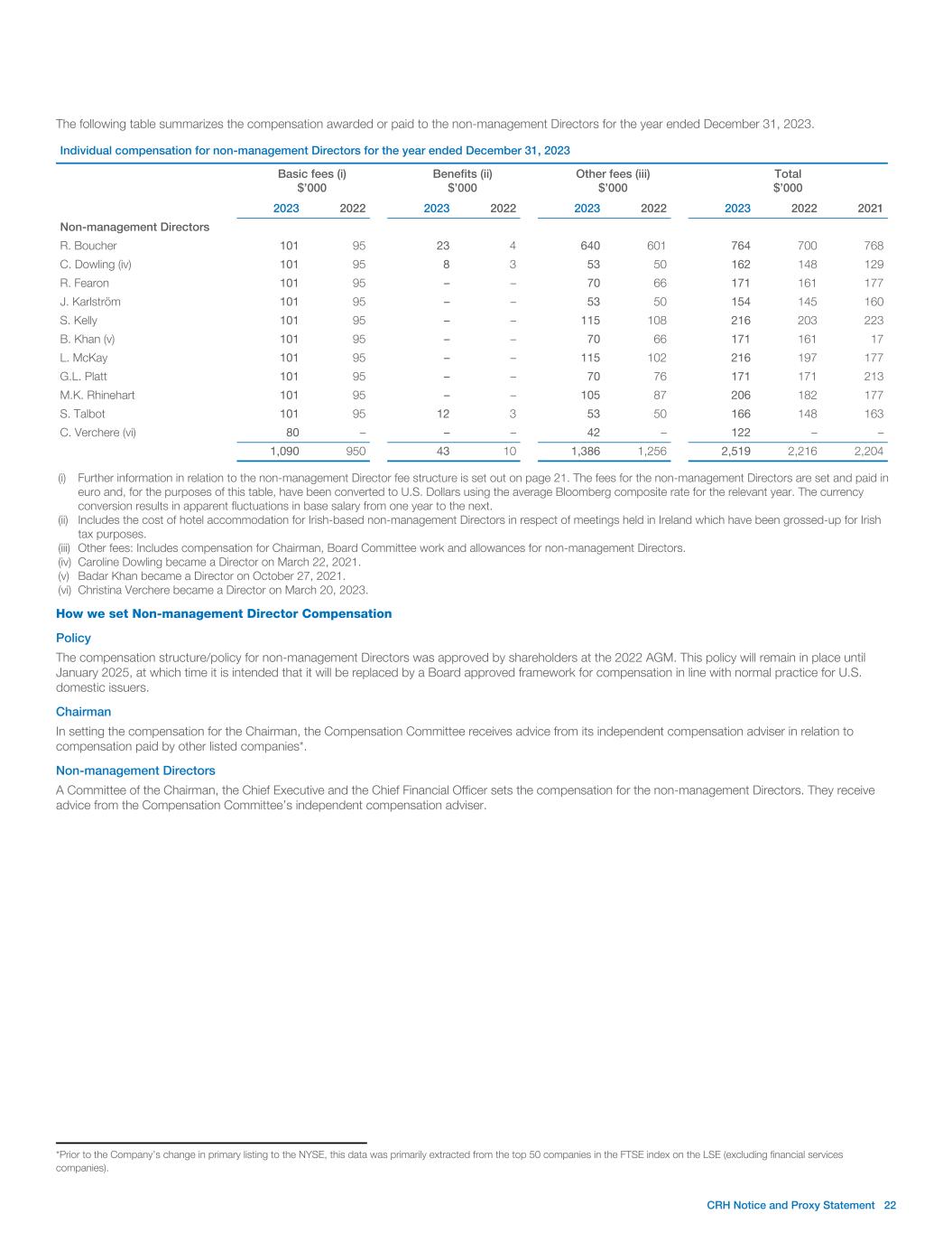 The following table summarizes the compensation awarded or paid to the non-management Directors for the year ended December 31, 2023. Individual compensation for non-management Directors for the year ended December 31, 2023 Basic fees (i) $’000 Benefits (ii) $’000 Other fees (iii) $’000 Total $’000 2023 2022 2023 2022 2023 2022 2023 2022 2021 Non-management Directors R. Boucher 101 95 23 4 640 601 764 700 768 C. Dowling (iv) 101 95 8 3 53 50 162 148 129 R. Fearon 101 95 – – 70 66 171 161 177 J. Karlström 101 95 – – 53 50 154 145 160 S. Kelly 101 95 – – 115 108 216 203 223 B. Khan (v) 101 95 – – 70 66 171 161 17 L. McKay 101 95 – – 115 102 216 197 177 G.L. Platt 101 95 – – 70 76 171 171 213 M.K. Rhinehart 101 95 – – 105 87 206 182 177 S. Talbot 101 95 12 3 53 50 166 148 163 C. Verchere (vi) 80 – – – 42 – 122 – – 1,090 950 43 10 1,386 1,256 2,519 2,216 2,204 (i) Further information in relation to the non-management Director fee structure is set out on page 21. The fees for the non-management Directors are set and paid in euro and, for the purposes of this table, have been converted to U.S. Dollars using the average Bloomberg composite rate for the relevant year. The currency conversion results in apparent fluctuations in base salary from one year to the next. (ii) Includes the cost of hotel accommodation for Irish-based non-management Directors in respect of meetings held in Ireland which have been grossed-up for Irish tax purposes. (iii) Other fees: Includes compensation for Chairman, Board Committee work and allowances for non-management Directors. (iv) Caroline Dowling became a Director on March 22, 2021. (v) Badar Khan became a Director on October 27, 2021. (vi) Christina Verchere became a Director on March 20, 2023. How we set Non-management Director Compensation Policy The compensation structure/policy for non-management Directors was approved by shareholders at the 2022 AGM. This policy will remain in place until January 2025, at which time it is intended that it will be replaced by a Board approved framework for compensation in line with normal practice for U.S. domestic issuers. Chairman In setting the compensation for the Chairman, the Compensation Committee receives advice from its independent compensation adviser in relation to compensation paid by other listed companies*.6 Non-management Directors A Committee of the Chairman, the Chief Executive and the Chief Financial Officer sets the compensation for the non-management Directors. They receive advice from the Compensation Committee’s independent compensation adviser. CRH Notice and Proxy Statement 22 *Prior to the Company’s change in primary listing to the NYSE, this data was primarily extracted from the top 50 companies in the FTSE index on the LSE (excluding financial services companies).6