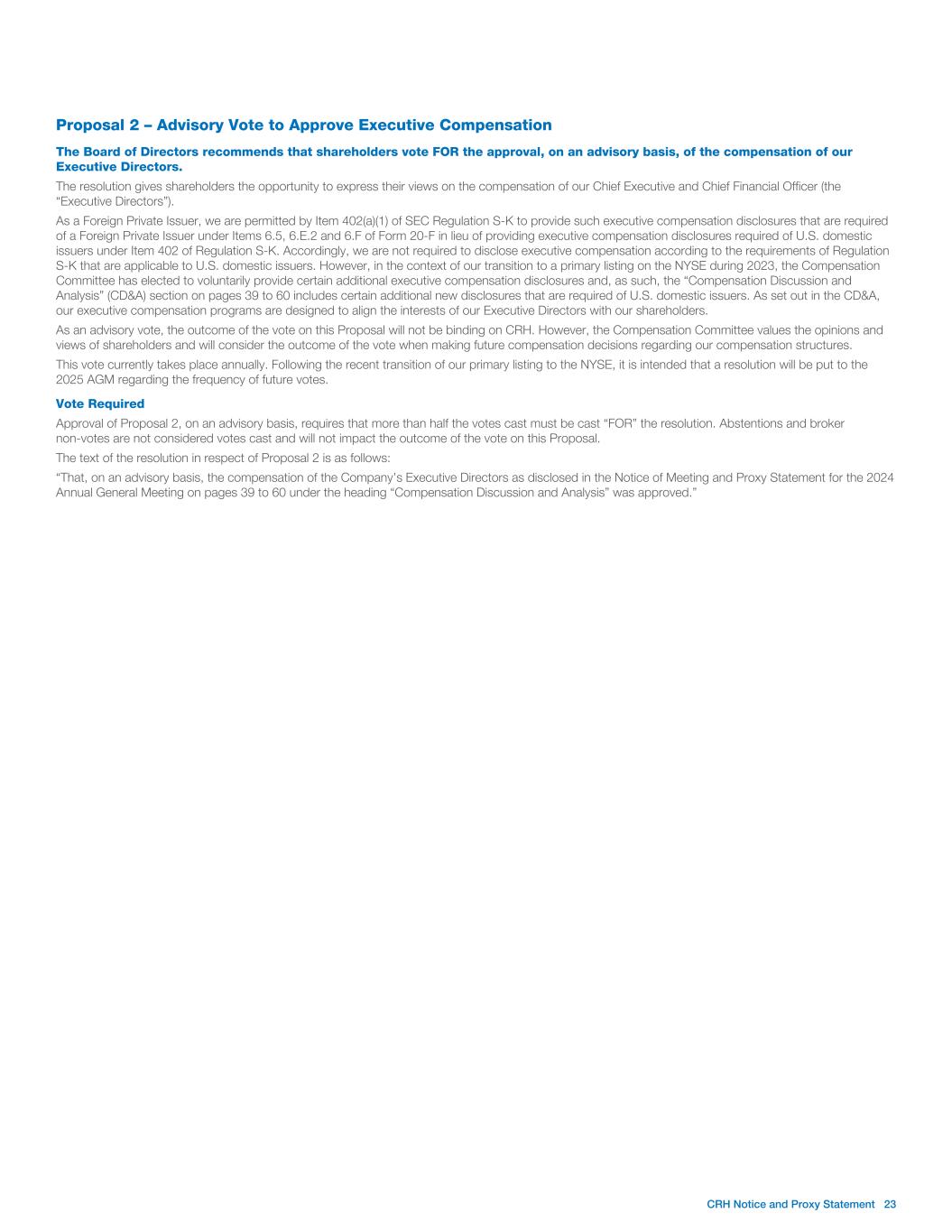 Proposal 2 – Advisory Vote to Approve Executive Compensation The Board of Directors recommends that shareholders vote FOR the approval, on an advisory basis, of the compensation of our Executive Directors. The resolution gives shareholders the opportunity to express their views on the compensation of our Chief Executive and Chief Financial Officer (the “Executive Directors”). As a Foreign Private Issuer, we are permitted by Item 402(a)(1) of SEC Regulation S-K to provide such executive compensation disclosures that are required of a Foreign Private Issuer under Items 6.5, 6.E.2 and 6.F of Form 20-F in lieu of providing executive compensation disclosures required of U.S. domestic issuers under Item 402 of Regulation S-K. Accordingly, we are not required to disclose executive compensation according to the requirements of Regulation S-K that are applicable to U.S. domestic issuers. However, in the context of our transition to a primary listing on the NYSE during 2023, the Compensation Committee has elected to voluntarily provide certain additional executive compensation disclosures and, as such, the “Compensation Discussion and Analysis” (CD&A) section on pages 39 to 60 includes certain additional new disclosures that are required of U.S. domestic issuers. As set out in the CD&A, our executive compensation programs are designed to align the interests of our Executive Directors with our shareholders. As an advisory vote, the outcome of the vote on this Proposal will not be binding on CRH. However, the Compensation Committee values the opinions and views of shareholders and will consider the outcome of the vote when making future compensation decisions regarding our compensation structures. This vote currently takes place annually. Following the recent transition of our primary listing to the NYSE, it is intended that a resolution will be put to the 2025 AGM regarding the frequency of future votes. Vote Required Approval of Proposal 2, on an advisory basis, requires that more than half the votes cast must be cast “FOR” the resolution. Abstentions and broker non-votes are not considered votes cast and will not impact the outcome of the vote on this Proposal. The text of the resolution in respect of Proposal 2 is as follows: “That, on an advisory basis, the compensation of the Company’s Executive Directors as disclosed in the Notice of Meeting and Proxy Statement for the 2024 Annual General Meeting on pages 39 to 60 under the heading “Compensation Discussion and Analysis” was approved.” CRH Notice and Proxy Statement 23