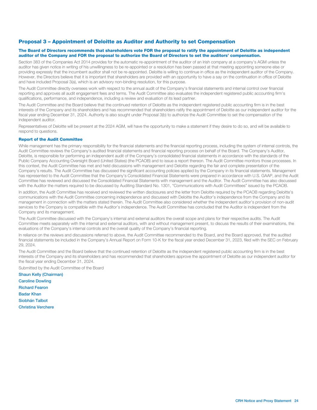 Proposal 3 – Appointment of Deloitte as Auditor and Authority to set Compensation The Board of Directors recommends that shareholders vote FOR the proposal to ratify the appointment of Deloitte as independent auditor of the Company and FOR the proposal to authorize the Board of Directors to set the auditors’ compensation. Section 383 of the Companies Act 2014 provides for the automatic re-appointment of the auditor of an Irish company at a company’s AGM unless the auditor has given notice in writing of his unwillingness to be re-appointed or a resolution has been passed at that meeting appointing someone else or providing expressly that the incumbent auditor shall not be re-appointed. Deloitte is willing to continue in office as the independent auditor of the Company. However, the Directors believe that it is important that shareholders are provided with an opportunity to have a say on the continuation in office of Deloitte and have included Proposal 3(a), which is an advisory non-binding resolution, for this purpose. The Audit Committee directly oversees work with respect to the annual audit of the Company's financial statements and internal control over financial reporting and approves all audit engagement fees and terms. The Audit Committee also evaluates the independent registered public accounting firm's qualifications, performance, and independence, including a review and evaluation of its lead partner. The Audit Committee and the Board believe that the continued retention of Deloitte as the independent registered public accounting firm is in the best interests of the Company and its shareholders and has recommended that shareholders ratify the appointment of Deloitte as our independent auditor for the fiscal year ending December 31, 2024. Authority is also sought under Proposal 3(b) to authorize the Audit Committee to set the compensation of the independent auditor. Representatives of Deloitte will be present at the 2024 AGM, will have the opportunity to make a statement if they desire to do so, and will be available to respond to questions. Report of the Audit Committee While management has the primary responsibility for the financial statements and the financial reporting process, including the system of internal controls, the Audit Committee reviews the Company’s audited financial statements and financial reporting process on behalf of the Board. The Company’s Auditor, Deloitte, is responsible for performing an independent audit of the Company’s consolidated financial statements in accordance with the standards of the Public Company Accounting Oversight Board (United States) (the PCAOB) and to issue a report thereon. The Audit Committee monitors those processes. In this context, the Audit Committee has met and held discussions with management and Deloitte regarding the fair and complete presentation of the Company’s results. The Audit Committee has discussed the significant accounting policies applied by the Company in its financial statements. Management has represented to the Audit Committee that the Company’s Consolidated Financial Statements were prepared in accordance with U.S. GAAP, and the Audit Committee has reviewed and discussed the Consolidated Financial Statements with management and the Auditor. The Audit Committee has also discussed with the Auditor the matters required to be discussed by Auditing Standard No. 1301, “Communications with Audit Committees” issued by the PCAOB. In addition, the Audit Committee has received and reviewed the written disclosures and the letter from Deloitte required by the PCAOB regarding Deloitte’s communications with the Audit Committee concerning independence and discussed with Deloitte the Auditor’s independence from the Company and its management in connection with the matters stated therein. The Audit Committee also considered whether the independent auditor’s provision of non-audit services to the Company is compatible with the Auditor’s independence. The Audit Committee has concluded that the Auditor is independent from the Company and its management. The Audit Committee discussed with the Company’s internal and external auditors the overall scope and plans for their respective audits. The Audit Committee meets separately with the internal and external auditors, with and without management present, to discuss the results of their examinations, the evaluations of the Company’s internal controls and the overall quality of the Company’s financial reporting. In reliance on the reviews and discussions referred to above, the Audit Committee recommended to the Board, and the Board approved, that the audited financial statements be included in the Company’s Annual Report on Form 10-K for the fiscal year ended December 31, 2023, filed with the SEC on February 29, 2024. The Audit Committee and the Board believe that the continued retention of Deloitte as the independent registered public accounting firm is in the best interests of the Company and its shareholders and has recommended that shareholders approve the appointment of Deloitte as our independent auditor for the fiscal year ending December 31, 2024. Submitted by the Audit Committee of the Board Shaun Kelly (Chairman) Caroline Dowling Richard Fearon Badar Khan Siobhán Talbot Christina Verchere CRH Notice and Proxy Statement 24