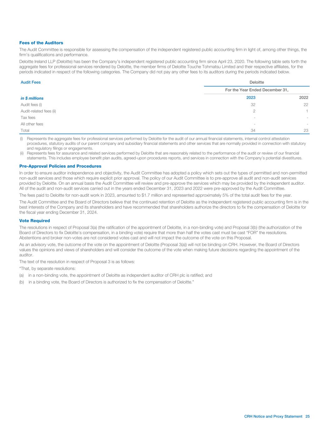 Fees of the Auditors The Audit Committee is responsible for assessing the compensation of the independent registered public accounting firm in light of, among other things, the firm's qualifications and performance. Deloitte Ireland LLP (Deloitte) has been the Company’s independent registered public accounting firm since April 23, 2020. The following table sets forth the aggregate fees for professional services rendered by Deloitte, the member firms of Deloitte Touche Tohmatsu Limited and their respective affiliates, for the periods indicated in respect of the following categories. The Company did not pay any other fees to its auditors during the periods indicated below. Audit Fees Deloitte For the Year Ended December 31, in $ millions 2023 2022 Audit fees (i) 32 22 Audit-related fees (ii) 2 1 Tax fees - - All other fees - - Total 34 23 (i) Represents the aggregate fees for professional services performed by Deloitte for the audit of our annual financial statements, internal control attestation procedures, statutory audits of our parent company and subsidiary financial statements and other services that are normally provided in connection with statutory and regulatory filings or engagements. (ii) Represents fees for assurance and related services performed by Deloitte that are reasonably related to the performance of the audit or review of our financial statements. This includes employee benefit plan audits, agreed-upon procedures reports, and services in connection with the Company’s potential divestitures. Pre-Approval Policies and Procedures In order to ensure auditor independence and objectivity, the Audit Committee has adopted a policy which sets out the types of permitted and non-permitted non-audit services and those which require explicit prior approval. The policy of our Audit Committee is to pre-approve all audit and non-audit services provided by Deloitte. On an annual basis the Audit Committee will review and pre-approve the services which may be provided by the independent auditor. All of the audit and non-audit services carried out in the years ended December 31, 2023 and 2022 were pre-approved by the Audit Committee. The fees paid to Deloitte for non-audit work in 2023, amounted to $1.7 million and represented approximately 5% of the total audit fees for the year. The Audit Committee and the Board of Directors believe that the continued retention of Deloitte as the independent registered public accounting firm is in the best interests of the Company and its shareholders and have recommended that shareholders authorize the directors to fix the compensation of Deloitte for the fiscal year ending December 31, 2024. Vote Required The resolutions in respect of Proposal 3(a) (the ratification of the appointment of Deloitte, in a non-binding vote) and Proposal 3(b) (the authorization of the Board of Directors to fix Deloitte’s compensation, in a binding vote) require that more than half the votes cast must be cast “FOR” the resolutions. Abstentions and broker non-votes are not considered votes cast and will not impact the outcome of the vote on this Proposal. As an advisory vote, the outcome of the vote on the appointment of Deloitte (Proposal 3(a)) will not be binding on CRH. However, the Board of Directors values the opinions and views of shareholders and will consider the outcome of the vote when making future decisions regarding the appointment of the auditor. The text of the resolution in respect of Proposal 3 is as follows: “That, by separate resolutions: (a) in a non-binding vote, the appointment of Deloitte as independent auditor of CRH plc is ratified; and (b) in a binding vote, the Board of Directors is authorized to fix the compensation of Deloitte.” CRH Notice and Proxy Statement 25
