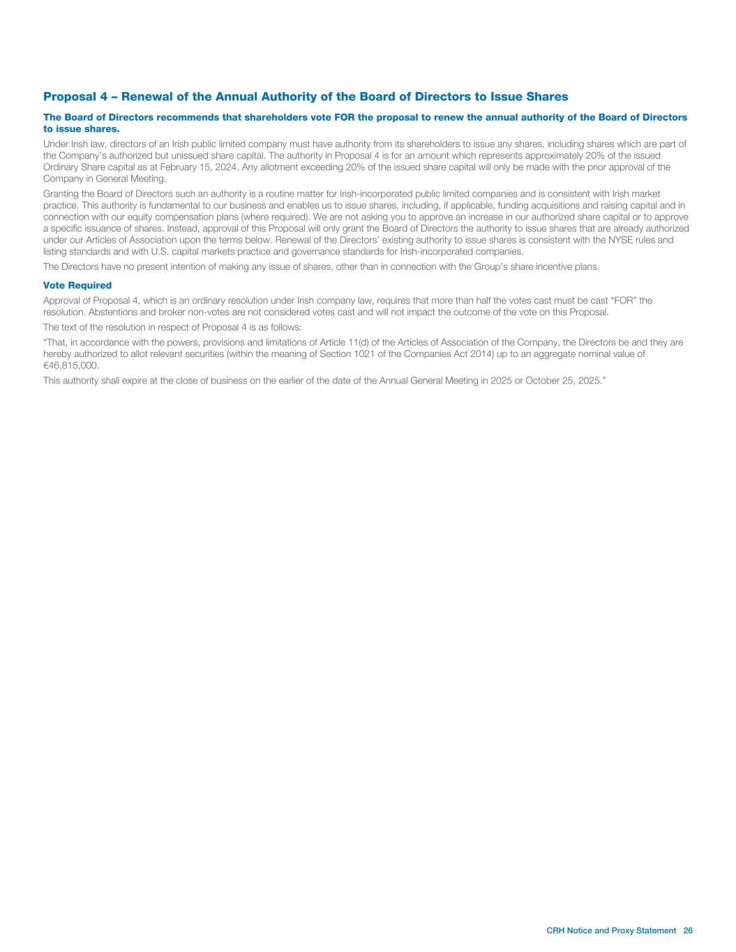 Proposal 4 – Renewal of the Annual Authority of the Board of Directors to Issue Shares The Board of Directors recommends that shareholders vote FOR the proposal to renew the annual authority of the Board of Directors to issue shares. Under Irish law, directors of an Irish public limited company must have authority from its shareholders to issue any shares, including shares which are part of the Company’s authorized but unissued share capital. The authority in Proposal 4 is for an amount which represents approximately 20% of the issued Ordinary Share capital as at February 15, 2024. Any allotment exceeding 20% of the issued share capital will only be made with the prior approval of the Company in General Meeting. Granting the Board of Directors such an authority is a routine matter for Irish-incorporated public limited companies and is consistent with Irish market practice. This authority is fundamental to our business and enables us to issue shares, including, if applicable, funding acquisitions and raising capital and in connection with our equity compensation plans (where required). We are not asking you to approve an increase in our authorized share capital or to approve a specific issuance of shares. Instead, approval of this Proposal will only grant the Board of Directors the authority to issue shares that are already authorized under our Articles of Association upon the terms below. Renewal of the Directors’ existing authority to issue shares is consistent with the NYSE rules and listing standards and with U.S. capital markets practice and governance standards for Irish-incorporated companies. The Directors have no present intention of making any issue of shares, other than in connection with the Group’s share incentive plans. Vote Required Approval of Proposal 4, which is an ordinary resolution under Irish company law, requires that more than half the votes cast must be cast “FOR” the resolution. Abstentions and broker non-votes are not considered votes cast and will not impact the outcome of the vote on this Proposal. The text of the resolution in respect of Proposal 4 is as follows: “That, in accordance with the powers, provisions and limitations of Article 11(d) of the Articles of Association of the Company, the Directors be and they are hereby authorized to allot relevant securities (within the meaning of Section 1021 of the Companies Act 2014) up to an aggregate nominal value of €46,815,000. This authority shall expire at the close of business on the earlier of the date of the Annual General Meeting in 2025 or October 25, 2025.” CRH Notice and Proxy Statement 26
