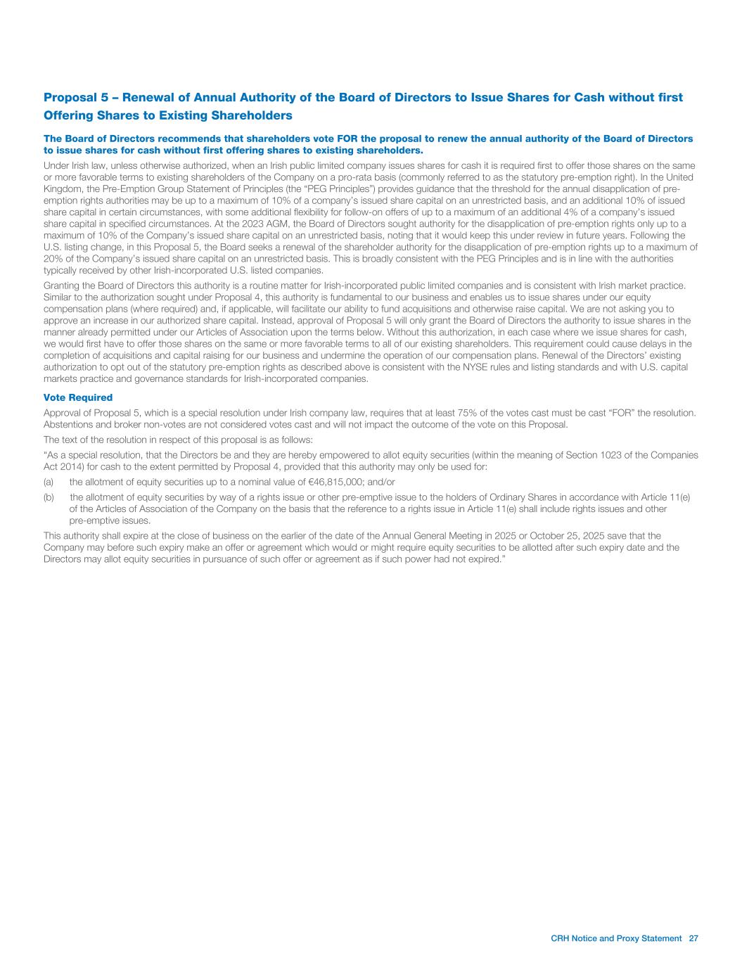 Proposal 5 – Renewal of Annual Authority of the Board of Directors to Issue Shares for Cash without first Offering Shares to Existing Shareholders The Board of Directors recommends that shareholders vote FOR the proposal to renew the annual authority of the Board of Directors to issue shares for cash without first offering shares to existing shareholders. Under Irish law, unless otherwise authorized, when an Irish public limited company issues shares for cash it is required first to offer those shares on the same or more favorable terms to existing shareholders of the Company on a pro-rata basis (commonly referred to as the statutory pre-emption right). In the United Kingdom, the Pre-Emption Group Statement of Principles (the “PEG Principles”) provides guidance that the threshold for the annual disapplication of pre- emption rights authorities may be up to a maximum of 10% of a company’s issued share capital on an unrestricted basis, and an additional 10% of issued share capital in certain circumstances, with some additional flexibility for follow-on offers of up to a maximum of an additional 4% of a company’s issued share capital in specified circumstances. At the 2023 AGM, the Board of Directors sought authority for the disapplication of pre-emption rights only up to a maximum of 10% of the Company’s issued share capital on an unrestricted basis, noting that it would keep this under review in future years. Following the U.S. listing change, in this Proposal 5, the Board seeks a renewal of the shareholder authority for the disapplication of pre-emption rights up to a maximum of 20% of the Company’s issued share capital on an unrestricted basis. This is broadly consistent with the PEG Principles and is in line with the authorities typically received by other Irish-incorporated U.S. listed companies. Granting the Board of Directors this authority is a routine matter for Irish-incorporated public limited companies and is consistent with Irish market practice. Similar to the authorization sought under Proposal 4, this authority is fundamental to our business and enables us to issue shares under our equity compensation plans (where required) and, if applicable, will facilitate our ability to fund acquisitions and otherwise raise capital. We are not asking you to approve an increase in our authorized share capital. Instead, approval of Proposal 5 will only grant the Board of Directors the authority to issue shares in the manner already permitted under our Articles of Association upon the terms below. Without this authorization, in each case where we issue shares for cash, we would first have to offer those shares on the same or more favorable terms to all of our existing shareholders. This requirement could cause delays in the completion of acquisitions and capital raising for our business and undermine the operation of our compensation plans. Renewal of the Directors’ existing authorization to opt out of the statutory pre-emption rights as described above is consistent with the NYSE rules and listing standards and with U.S. capital markets practice and governance standards for Irish-incorporated companies. Vote Required Approval of Proposal 5, which is a special resolution under Irish company law, requires that at least 75% of the votes cast must be cast “FOR” the resolution. Abstentions and broker non-votes are not considered votes cast and will not impact the outcome of the vote on this Proposal. The text of the resolution in respect of this proposal is as follows: “As a special resolution, that the Directors be and they are hereby empowered to allot equity securities (within the meaning of Section 1023 of the Companies Act 2014) for cash to the extent permitted by Proposal 4, provided that this authority may only be used for: (a) the allotment of equity securities up to a nominal value of €46,815,000; and/or (b) the allotment of equity securities by way of a rights issue or other pre-emptive issue to the holders of Ordinary Shares in accordance with Article 11(e) of the Articles of Association of the Company on the basis that the reference to a rights issue in Article 11(e) shall include rights issues and other pre-emptive issues. This authority shall expire at the close of business on the earlier of the date of the Annual General Meeting in 2025 or October 25, 2025 save that the Company may before such expiry make an offer or agreement which would or might require equity securities to be allotted after such expiry date and the Directors may allot equity securities in pursuance of such offer or agreement as if such power had not expired.” CRH Notice and Proxy Statement 27