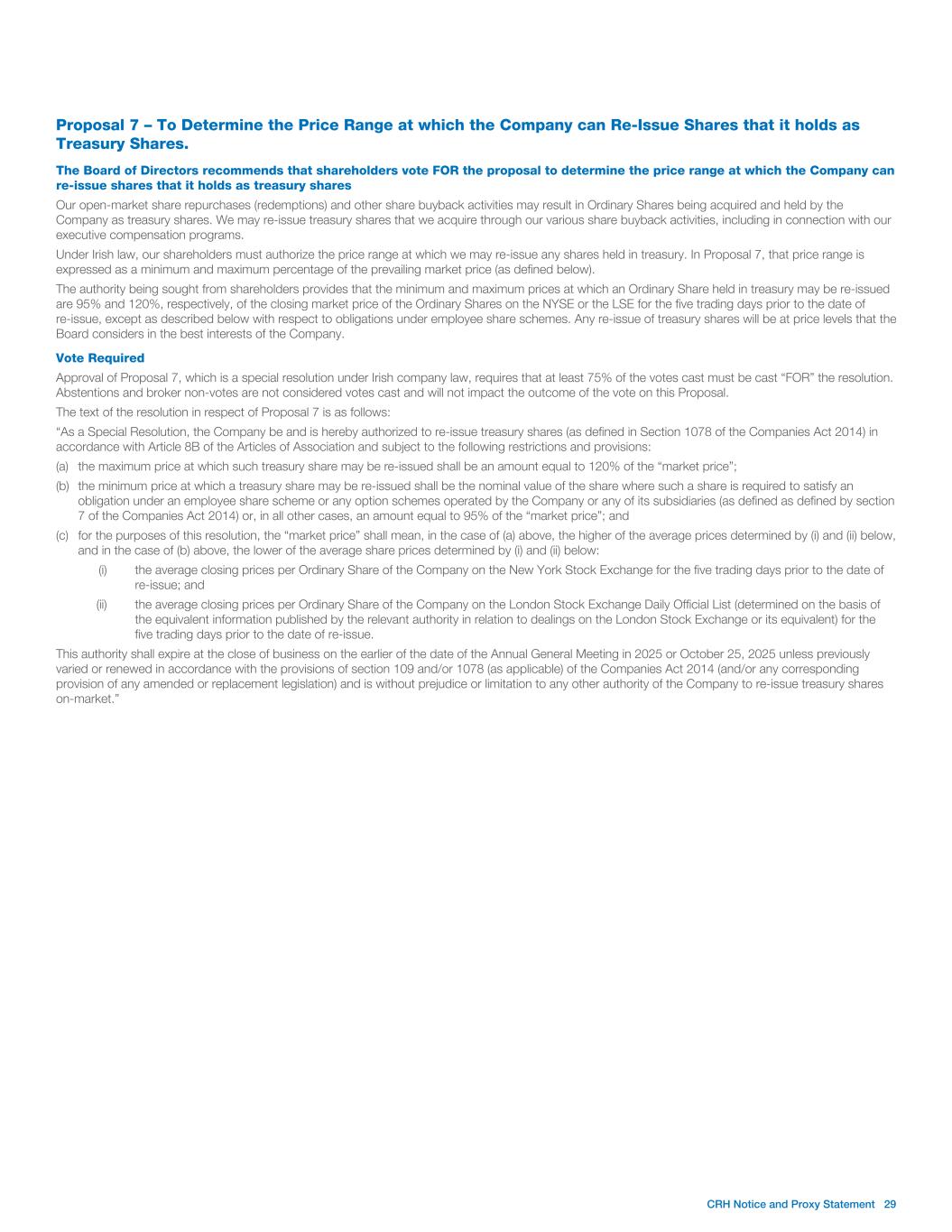 Proposal 7 – To Determine the Price Range at which the Company can Re-Issue Shares that it holds as Treasury Shares. The Board of Directors recommends that shareholders vote FOR the proposal to determine the price range at which the Company can re-issue shares that it holds as treasury shares Our open-market share repurchases (redemptions) and other share buyback activities may result in Ordinary Shares being acquired and held by the Company as treasury shares. We may re-issue treasury shares that we acquire through our various share buyback activities, including in connection with our executive compensation programs. Under Irish law, our shareholders must authorize the price range at which we may re-issue any shares held in treasury. In Proposal 7, that price range is expressed as a minimum and maximum percentage of the prevailing market price (as defined below). The authority being sought from shareholders provides that the minimum and maximum prices at which an Ordinary Share held in treasury may be re-issued are 95% and 120%, respectively, of the closing market price of the Ordinary Shares on the NYSE or the LSE for the five trading days prior to the date of re-issue, except as described below with respect to obligations under employee share schemes. Any re-issue of treasury shares will be at price levels that the Board considers in the best interests of the Company. Vote Required Approval of Proposal 7, which is a special resolution under Irish company law, requires that at least 75% of the votes cast must be cast “FOR” the resolution. Abstentions and broker non-votes are not considered votes cast and will not impact the outcome of the vote on this Proposal. The text of the resolution in respect of Proposal 7 is as follows: “As a Special Resolution, the Company be and is hereby authorized to re-issue treasury shares (as defined in Section 1078 of the Companies Act 2014) in accordance with Article 8B of the Articles of Association and subject to the following restrictions and provisions: (a) the maximum price at which such treasury share may be re-issued shall be an amount equal to 120% of the “market price”; (b) the minimum price at which a treasury share may be re-issued shall be the nominal value of the share where such a share is required to satisfy an obligation under an employee share scheme or any option schemes operated by the Company or any of its subsidiaries (as defined as defined by section 7 of the Companies Act 2014) or, in all other cases, an amount equal to 95% of the “market price”; and (c) for the purposes of this resolution, the “market price” shall mean, in the case of (a) above, the higher of the average prices determined by (i) and (ii) below, and in the case of (b) above, the lower of the average share prices determined by (i) and (ii) below: (i) the average closing prices per Ordinary Share of the Company on the New York Stock Exchange for the five trading days prior to the date of re-issue; and (ii) the average closing prices per Ordinary Share of the Company on the London Stock Exchange Daily Official List (determined on the basis of the equivalent information published by the relevant authority in relation to dealings on the London Stock Exchange or its equivalent) for the five trading days prior to the date of re-issue. This authority shall expire at the close of business on the earlier of the date of the Annual General Meeting in 2025 or October 25, 2025 unless previously varied or renewed in accordance with the provisions of section 109 and/or 1078 (as applicable) of the Companies Act 2014 (and/or any corresponding provision of any amended or replacement legislation) and is without prejudice or limitation to any other authority of the Company to re-issue treasury shares on-market.” CRH Notice and Proxy Statement 29