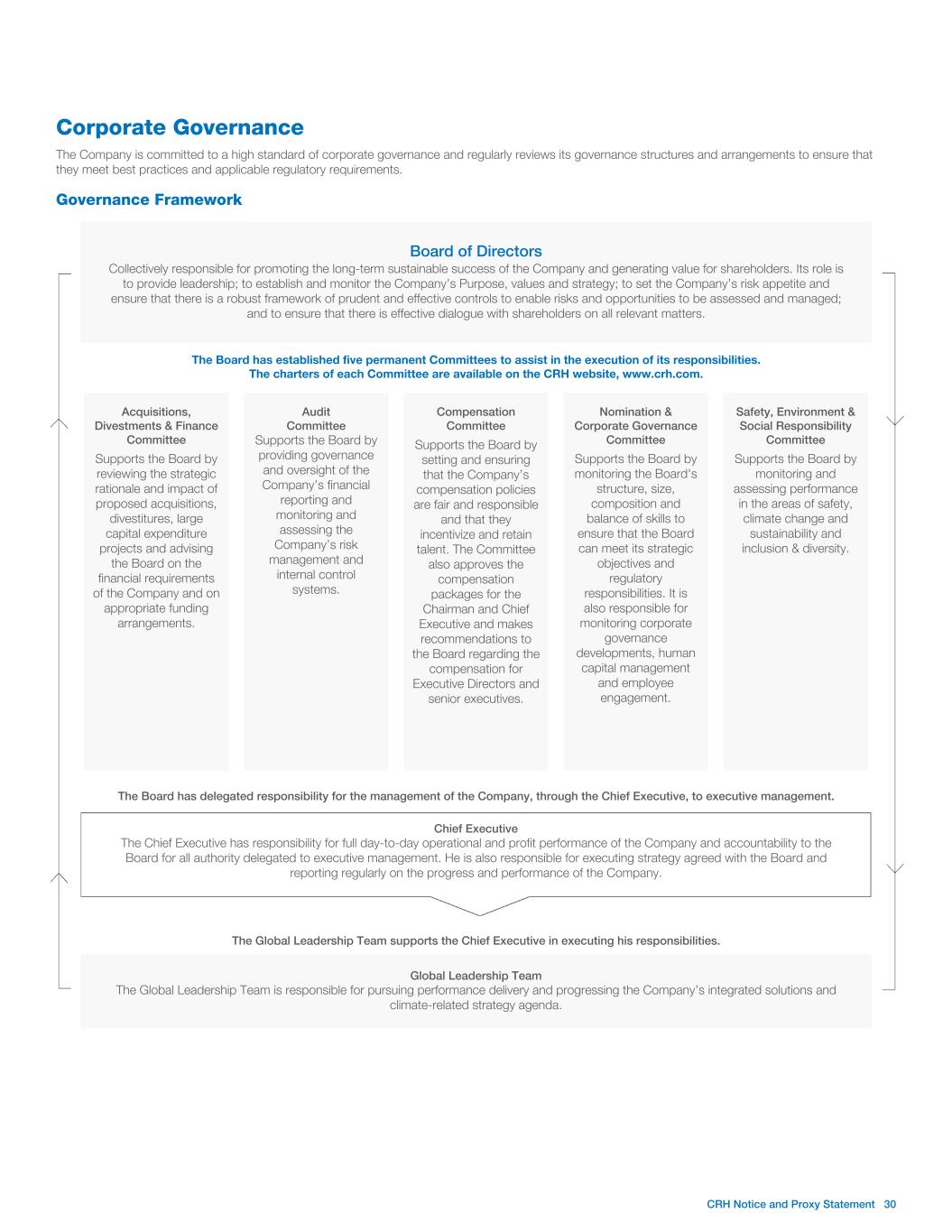Corporate Governance The Company is committed to a high standard of corporate governance and regularly reviews its governance structures and arrangements to ensure that they meet best practices and applicable regulatory requirements. Governance Framework Board of Directors Collectively responsible for promoting the long-term sustainable success of the Company and generating value for shareholders. Its role is to provide leadership; to establish and monitor the Company’s Purpose, values and strategy; to set the Company’s risk appetite and ensure that there is a robust framework of prudent and effective controls to enable risks and opportunities to be assessed and managed; and to ensure that there is effective dialogue with shareholders on all relevant matters. The Board has established five permanent Committees to assist in the execution of its responsibilities. The charters of each Committee are available on the CRH website, www.crh.com. Acquisitions, Divestments & Finance Committee Supports the Board by reviewing the strategic rationale and impact of proposed acquisitions, divestitures, large capital expenditure projects and advising the Board on the financial requirements of the Company and on appropriate funding arrangements. Audit Committee Supports the Board by providing governance and oversight of the Company’s financial reporting and monitoring and assessing the Company’s risk management and internal control systems. Compensation Committee Supports the Board by setting and ensuring that the Company’s compensation policies are fair and responsible and that they incentivize and retain talent. The Committee also approves the compensation packages for the Chairman and Chief Executive and makes recommendations to the Board regarding the compensation for Executive Directors and senior executives. Nomination & Corporate Governance Committee Supports the Board by monitoring the Board's structure, size, composition and balance of skills to ensure that the Board can meet its strategic objectives and regulatory responsibilities. It is also responsible for monitoring corporate governance developments, human capital management and employee engagement. Safety, Environment & Social Responsibility Committee Supports the Board by monitoring and assessing performance in the areas of safety, climate change and sustainability and inclusion & diversity. The Board has delegated responsibility for the management of the Company, through the Chief Executive, to executive management. Chief Executive The Chief Executive has responsibility for full day-to-day operational and profit performance of the Company and accountability to the Board for all authority delegated to executive management. He is also responsible for executing strategy agreed with the Board and reporting regularly on the progress and performance of the Company. The Global Leadership Team supports the Chief Executive in executing his responsibilities. Global Leadership Team The Global Leadership Team is responsible for pursuing performance delivery and progressing the Company’s integrated solutions and climate-related strategy agenda. CRH Notice and Proxy Statement 30