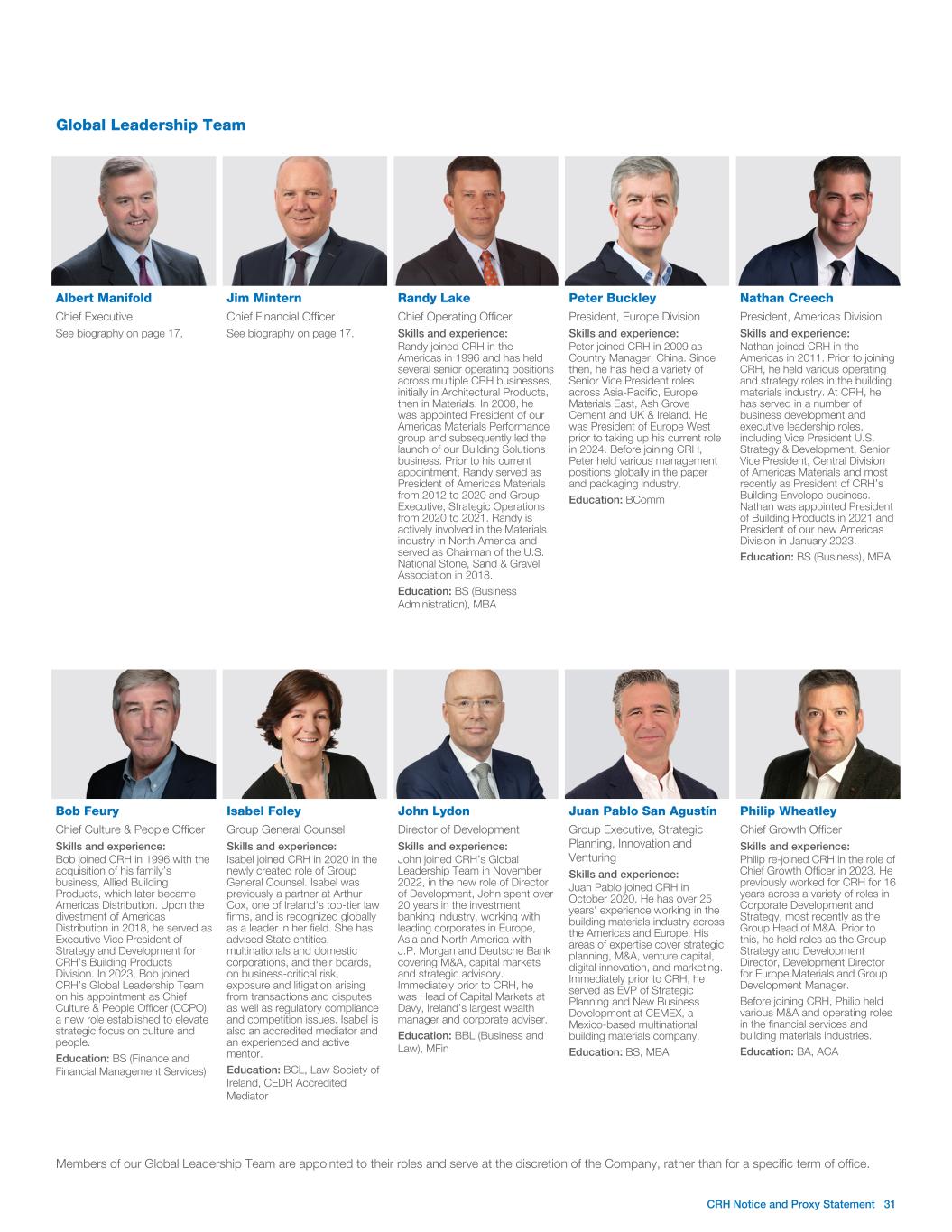 Global Leadership Team Albert Manifold Chief Executive See biography on page 17. Jim Mintern Chief Financial Officer See biography on page 17. Randy Lake Chief Operating Officer Skills and experience: Randy joined CRH in the Americas in 1996 and has held several senior operating positions across multiple CRH businesses, initially in Architectural Products, then in Materials. In 2008, he was appointed President of our Americas Materials Performance group and subsequently led the launch of our Building Solutions business. Prior to his current appointment, Randy served as President of Americas Materials from 2012 to 2020 and Group Executive, Strategic Operations from 2020 to 2021. Randy is actively involved in the Materials industry in North America and served as Chairman of the U.S. National Stone, Sand & Gravel Association in 2018. Education: BS (Business Administration), MBA Peter Buckley President, Europe Division Skills and experience: Peter joined CRH in 2009 as Country Manager, China. Since then, he has held a variety of Senior Vice President roles across Asia-Pacific, Europe Materials East, Ash Grove Cement and UK & Ireland. He was President of Europe West prior to taking up his current role in 2024. Before joining CRH, Peter held various management positions globally in the paper and packaging industry. Education: BComm Nathan Creech President, Americas Division Skills and experience: Nathan joined CRH in the Americas in 2011. Prior to joining CRH, he held various operating and strategy roles in the building materials industry. At CRH, he has served in a number of business development and executive leadership roles, including Vice President U.S. Strategy & Development, Senior Vice President, Central Division of Americas Materials and most recently as President of CRH’s Building Envelope business. Nathan was appointed President of Building Products in 2021 and President of our new Americas Division in January 2023. Education: BS (Business), MBA Bob Feury Chief Culture & People Officer Skills and experience: Bob joined CRH in 1996 with the acquisition of his family’s business, Allied Building Products, which later became Americas Distribution. Upon the divestment of Americas Distribution in 2018, he served as Executive Vice President of Strategy and Development for CRH’s Building Products Division. In 2023, Bob joined CRH’s Global Leadership Team on his appointment as Chief Culture & People Officer (CCPO), a new role established to elevate strategic focus on culture and people. Education: BS (Finance and Financial Management Services) Isabel Foley Group General Counsel Skills and experience: Isabel joined CRH in 2020 in the newly created role of Group General Counsel. Isabel was previously a partner at Arthur Cox, one of Ireland's top-tier law firms, and is recognized globally as a leader in her field. She has advised State entities, multinationals and domestic corporations, and their boards, on business-critical risk, exposure and litigation arising from transactions and disputes as well as regulatory compliance and competition issues. Isabel is also an accredited mediator and an experienced and active mentor. Education: BCL, Law Society of Ireland, CEDR Accredited Mediator John Lydon Director of Development Skills and experience: John joined CRH’s Global Leadership Team in November 2022, in the new role of Director of Development, John spent over 20 years in the investment banking industry, working with leading corporates in Europe, Asia and North America with J.P. Morgan and Deutsche Bank covering M&A, capital markets and strategic advisory. Immediately prior to CRH, he was Head of Capital Markets at Davy, Ireland’s largest wealth manager and corporate adviser. Education: BBL (Business and Law), MFin Juan Pablo San Agustín Group Executive, Strategic Planning, Innovation and Venturing Skills and experience: Juan Pablo joined CRH in October 2020. He has over 25 years' experience working in the building materials industry across the Americas and Europe. His areas of expertise cover strategic planning, M&A, venture capital, digital innovation, and marketing. Immediately prior to CRH, he served as EVP of Strategic Planning and New Business Development at CEMEX, a Mexico-based multinational building materials company. Education: BS, MBA Philip Wheatley Chief Growth Officer Skills and experience: Philip re-joined CRH in the role of Chief Growth Officer in 2023. He previously worked for CRH for 16 years across a variety of roles in Corporate Development and Strategy, most recently as the Group Head of M&A. Prior to this, he held roles as the Group Strategy and Development Director, Development Director for Europe Materials and Group Development Manager. Before joining CRH, Philip held various M&A and operating roles in the financial services and building materials industries. Education: BA, ACA Members of our Global Leadership Team are appointed to their roles and serve at the discretion of the Company, rather than for a specific term of office. CRH Notice and Proxy Statement 31