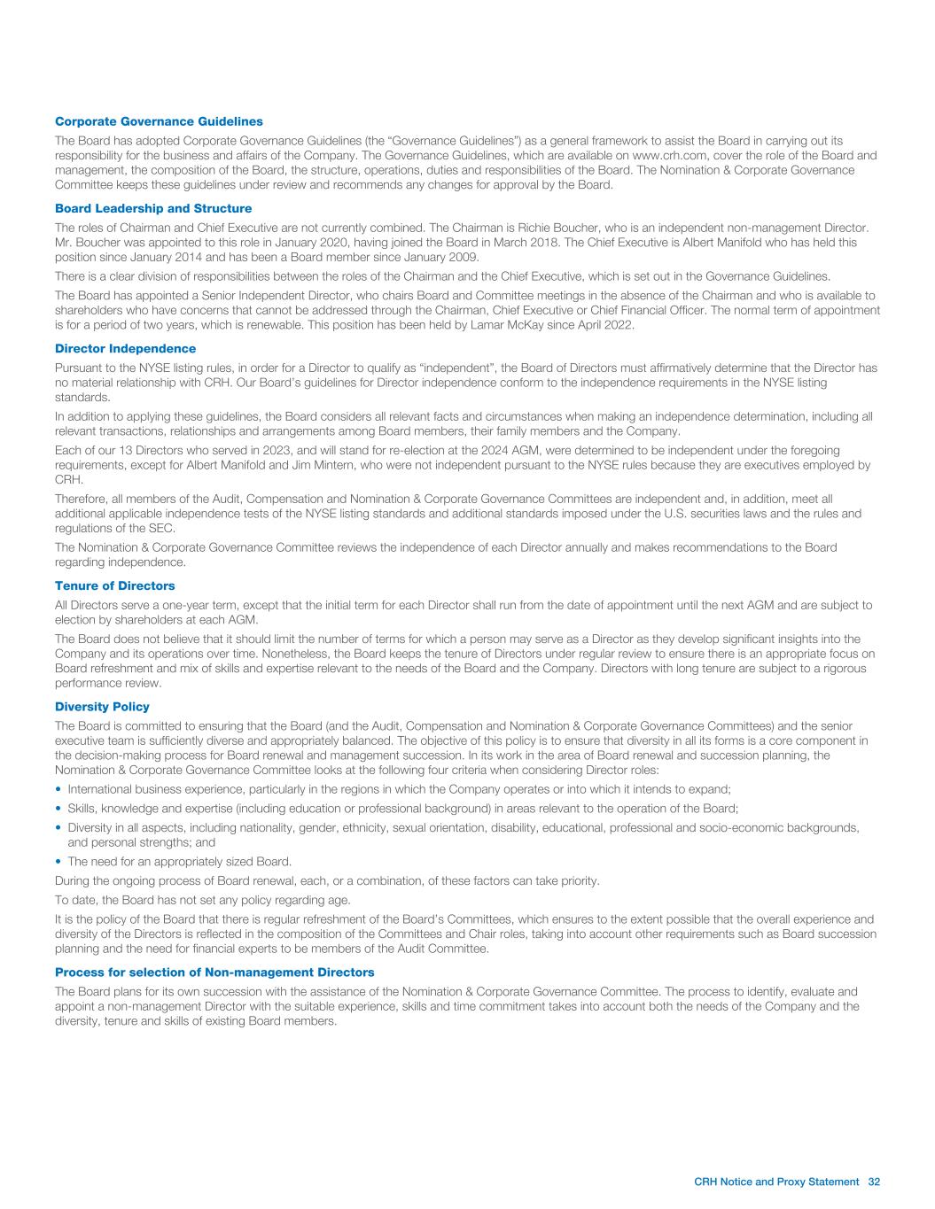 Corporate Governance Guidelines The Board has adopted Corporate Governance Guidelines (the “Governance Guidelines”) as a general framework to assist the Board in carrying out its responsibility for the business and affairs of the Company. The Governance Guidelines, which are available on www.crh.com, cover the role of the Board and management, the composition of the Board, the structure, operations, duties and responsibilities of the Board. The Nomination & Corporate Governance Committee keeps these guidelines under review and recommends any changes for approval by the Board. Board Leadership and Structure The roles of Chairman and Chief Executive are not currently combined. The Chairman is Richie Boucher, who is an independent non-management Director. Mr. Boucher was appointed to this role in January 2020, having joined the Board in March 2018. The Chief Executive is Albert Manifold who has held this position since January 2014 and has been a Board member since January 2009. There is a clear division of responsibilities between the roles of the Chairman and the Chief Executive, which is set out in the Governance Guidelines. The Board has appointed a Senior Independent Director, who chairs Board and Committee meetings in the absence of the Chairman and who is available to shareholders who have concerns that cannot be addressed through the Chairman, Chief Executive or Chief Financial Officer. The normal term of appointment is for a period of two years, which is renewable. This position has been held by Lamar McKay since April 2022. Director Independence Pursuant to the NYSE listing rules, in order for a Director to qualify as “independent”, the Board of Directors must affirmatively determine that the Director has no material relationship with CRH. Our Board’s guidelines for Director independence conform to the independence requirements in the NYSE listing standards. In addition to applying these guidelines, the Board considers all relevant facts and circumstances when making an independence determination, including all relevant transactions, relationships and arrangements among Board members, their family members and the Company. Each of our 13 Directors who served in 2023, and will stand for re-election at the 2024 AGM, were determined to be independent under the foregoing requirements, except for Albert Manifold and Jim Mintern, who were not independent pursuant to the NYSE rules because they are executives employed by CRH. Therefore, all members of the Audit, Compensation and Nomination & Corporate Governance Committees are independent and, in addition, meet all additional applicable independence tests of the NYSE listing standards and additional standards imposed under the U.S. securities laws and the rules and regulations of the SEC. The Nomination & Corporate Governance Committee reviews the independence of each Director annually and makes recommendations to the Board regarding independence. Tenure of Directors All Directors serve a one-year term, except that the initial term for each Director shall run from the date of appointment until the next AGM and are subject to election by shareholders at each AGM. The Board does not believe that it should limit the number of terms for which a person may serve as a Director as they develop significant insights into the Company and its operations over time. Nonetheless, the Board keeps the tenure of Directors under regular review to ensure there is an appropriate focus on Board refreshment and mix of skills and expertise relevant to the needs of the Board and the Company. Directors with long tenure are subject to a rigorous performance review. Diversity Policy The Board is committed to ensuring that the Board (and the Audit, Compensation and Nomination & Corporate Governance Committees) and the senior executive team is sufficiently diverse and appropriately balanced. The objective of this policy is to ensure that diversity in all its forms is a core component in the decision-making process for Board renewal and management succession. In its work in the area of Board renewal and succession planning, the Nomination & Corporate Governance Committee looks at the following four criteria when considering Director roles: • International business experience, particularly in the regions in which the Company operates or into which it intends to expand; • Skills, knowledge and expertise (including education or professional background) in areas relevant to the operation of the Board; • Diversity in all aspects, including nationality, gender, ethnicity, sexual orientation, disability, educational, professional and socio-economic backgrounds, and personal strengths; and • The need for an appropriately sized Board. During the ongoing process of Board renewal, each, or a combination, of these factors can take priority. To date, the Board has not set any policy regarding age. It is the policy of the Board that there is regular refreshment of the Board’s Committees, which ensures to the extent possible that the overall experience and diversity of the Directors is reflected in the composition of the Committees and Chair roles, taking into account other requirements such as Board succession planning and the need for financial experts to be members of the Audit Committee. Process for selection of Non-management Directors The Board plans for its own succession with the assistance of the Nomination & Corporate Governance Committee. The process to identify, evaluate and appoint a non-management Director with the suitable experience, skills and time commitment takes into account both the needs of the Company and the diversity, tenure and skills of existing Board members. CRH Notice and Proxy Statement 32