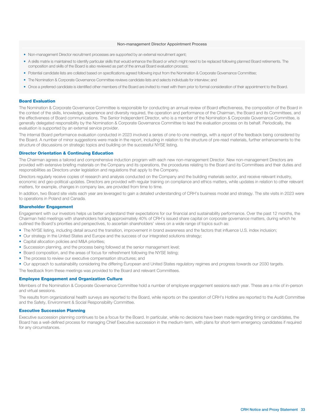 Non-management Director Appointment Process • Non-management Director recruitment processes are supported by an external recruitment agent; • A skills matrix is maintained to identify particular skills that would enhance the Board or which might need to be replaced following planned Board retirements. The composition and skills of the Board is also reviewed as part of the annual Board evaluation process; • Potential candidate lists are collated based on specifications agreed following input from the Nomination & Corporate Governance Committee; • The Nomination & Corporate Governance Committee reviews candidate lists and selects individuals for interview; and • Once a preferred candidate is identified other members of the Board are invited to meet with them prior to formal consideration of their appointment to the Board. Board Evaluation The Nomination & Corporate Governance Committee is responsible for conducting an annual review of Board effectiveness, the composition of the Board in the context of the skills, knowledge, experience and diversity required, the operation and performance of the Chairman, the Board and its Committees, and the effectiveness of Board communications. The Senior Independent Director, who is a member of the Nomination & Corporate Governance Committee, is generally delegated responsibility by the Nomination & Corporate Governance Committee to lead the evaluation process on its behalf. Periodically, the evaluation is supported by an external service provider. The internal Board performance evaluation conducted in 2023 involved a series of one-to-one meetings, with a report of the feedback being considered by the Board. A number of minor suggestions were made in the report, including in relation to the structure of pre-read materials, further enhancements to the structure of discussions on strategic topics and building on the successful NYSE listing. Director Orientation & Continuing Education The Chairman agrees a tailored and comprehensive induction program with each new non-management Director. New non-management Directors are provided with extensive briefing materials on the Company and its operations, the procedures relating to the Board and its Committees and their duties and responsibilities as Directors under legislation and regulations that apply to the Company. Directors regularly receive copies of research and analysis conducted on the Company and the building materials sector, and receive relevant industry, economic and geo-political updates. Directors are provided with regular training on compliance and ethics matters, while updates in relation to other relevant matters, for example, changes in company law, are provided from time to time. In addition, two Board site visits each year are leveraged to gain a detailed understanding of CRH’s business model and strategy. The site visits in 2023 were to operations in Poland and Canada. Shareholder Engagement Engagement with our investors helps us better understand their expectations for our financial and sustainability performance. Over the past 12 months, the Chairman held meetings with shareholders holding approximately 40% of CRH’s issued share capital on corporate governance matters, during which he outlined the Board’s priorities and perspectives, to ascertain shareholders' views on a wide range of topics such as: • The NYSE listing, including detail around the transition, improvement in brand awareness and the factors that influence U.S. index inclusion; • Our strategy in the United States and Europe and the success of our integrated solutions strategy; • Capital allocation policies and M&A priorities; • Succession planning, and the process being followed at the senior management level; • Board composition, and the areas of focus for refreshment following the NYSE listing; • The process to review our executive compensation structures; and • Our approach to sustainability considering the differing European and United States regulatory regimes and progress towards our 2030 targets. The feedback from these meetings was provided to the Board and relevant Committees. Employee Engagement and Organization Culture Members of the Nomination & Corporate Governance Committee hold a number of employee engagement sessions each year. These are a mix of in-person and virtual sessions. The results from organizational health surveys are reported to the Board, while reports on the operation of CRH’s Hotline are reported to the Audit Committee and the Safety, Environment & Social Responsibility Committee. Executive Succession Planning Executive succession planning continues to be a focus for the Board. In particular, while no decisions have been made regarding timing or candidates, the Board has a well-defined process for managing Chief Executive succession in the medium-term, with plans for short-term emergency candidates if required for any circumstances. CRH Notice and Proxy Statement 33