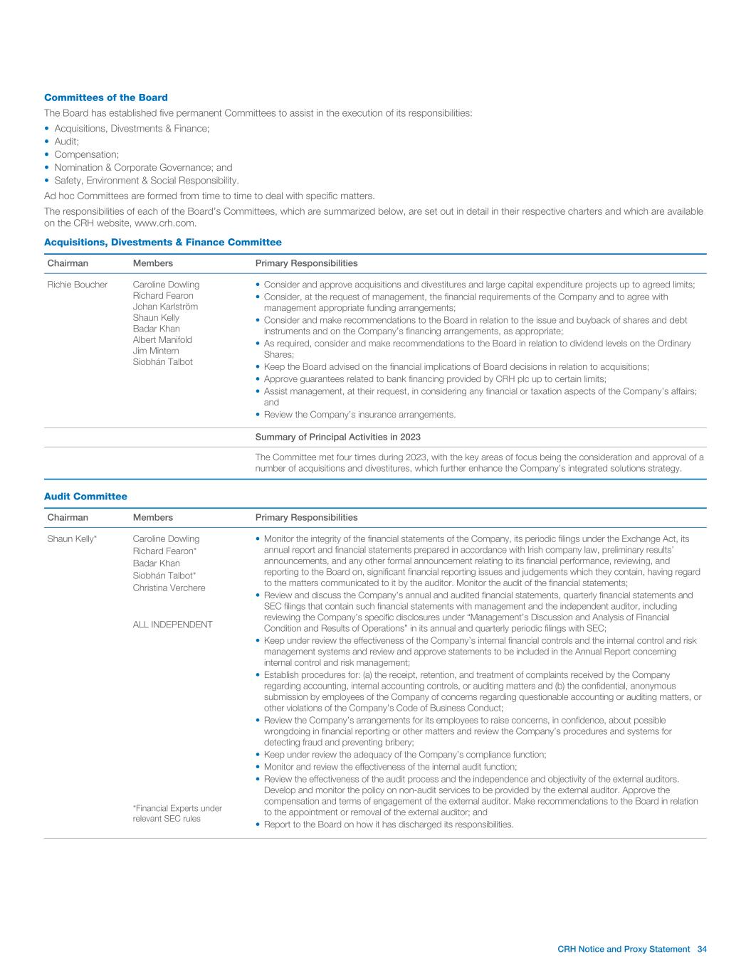 Committees of the Board The Board has established five permanent Committees to assist in the execution of its responsibilities: • Acquisitions, Divestments & Finance; • Audit; • Compensation; • Nomination & Corporate Governance; and • Safety, Environment & Social Responsibility. Ad hoc Committees are formed from time to time to deal with specific matters. The responsibilities of each of the Board’s Committees, which are summarized below, are set out in detail in their respective charters and which are available on the CRH website, www.crh.com. Acquisitions, Divestments & Finance Committee Chairman Members Primary Responsibilities Richie Boucher Caroline Dowling Richard Fearon Johan Karlström Shaun Kelly Badar Khan Albert Manifold Jim Mintern Siobhán Talbot • Consider and approve acquisitions and divestitures and large capital expenditure projects up to agreed limits; • Consider, at the request of management, the financial requirements of the Company and to agree with management appropriate funding arrangements; • Consider and make recommendations to the Board in relation to the issue and buyback of shares and debt instruments and on the Company’s financing arrangements, as appropriate; • As required, consider and make recommendations to the Board in relation to dividend levels on the Ordinary Shares; • Keep the Board advised on the financial implications of Board decisions in relation to acquisitions; • Approve guarantees related to bank financing provided by CRH plc up to certain limits; • Assist management, at their request, in considering any financial or taxation aspects of the Company’s affairs; and • Review the Company’s insurance arrangements. Summary of Principal Activities in 2023 The Committee met four times during 2023, with the key areas of focus being the consideration and approval of a number of acquisitions and divestitures, which further enhance the Company’s integrated solutions strategy. Audit Committee Chairman Members Primary Responsibilities Shaun Kelly* Caroline Dowling Richard Fearon* Badar Khan Siobhán Talbot* Christina Verchere ALL INDEPENDENT *Financial Experts under relevant SEC rules • Monitor the integrity of the financial statements of the Company, its periodic filings under the Exchange Act, its annual report and financial statements prepared in accordance with Irish company law, preliminary results’ announcements, and any other formal announcement relating to its financial performance, reviewing, and reporting to the Board on, significant financial reporting issues and judgements which they contain, having regard to the matters communicated to it by the auditor. Monitor the audit of the financial statements; • Review and discuss the Company’s annual and audited financial statements, quarterly financial statements and SEC filings that contain such financial statements with management and the independent auditor, including reviewing the Company’s specific disclosures under “Management’s Discussion and Analysis of Financial Condition and Results of Operations” in its annual and quarterly periodic filings with SEC; • Keep under review the effectiveness of the Company’s internal financial controls and the internal control and risk management systems and review and approve statements to be included in the Annual Report concerning internal control and risk management; • Establish procedures for: (a) the receipt, retention, and treatment of complaints received by the Company regarding accounting, internal accounting controls, or auditing matters and (b) the confidential, anonymous submission by employees of the Company of concerns regarding questionable accounting or auditing matters, or other violations of the Company’s Code of Business Conduct; • Review the Company’s arrangements for its employees to raise concerns, in confidence, about possible wrongdoing in financial reporting or other matters and review the Company’s procedures and systems for detecting fraud and preventing bribery; • Keep under review the adequacy of the Company’s compliance function; • Monitor and review the effectiveness of the internal audit function; • Review the effectiveness of the audit process and the independence and objectivity of the external auditors. Develop and monitor the policy on non-audit services to be provided by the external auditor. Approve the compensation and terms of engagement of the external auditor. Make recommendations to the Board in relation to the appointment or removal of the external auditor; and • Report to the Board on how it has discharged its responsibilities. CRH Notice and Proxy Statement 34