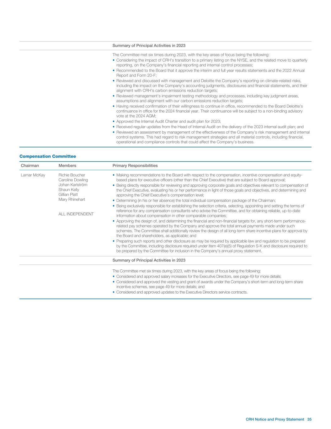 Summary of Principal Activities in 2023 The Committee met six times during 2023, with the key areas of focus being the following: • Considering the impact of CRH's transition to a primary listing on the NYSE, and the related move to quarterly reporting, on the Company's financial reporting and internal control processes; • Recommended to the Board that it approve the interim and full year results statements and the 2022 Annual Report and Form 20-F; • Reviewed and discussed with management and Deloitte the Company's reporting on climate-related risks, including the impact on the Company's accounting judgments, disclosures and financial statements, and their alignment with CRH's carbon emissions reduction targets; • Reviewed management's impairment testing methodology and processes, including key judgment areas, assumptions and alignment with our carbon emissions reduction targets; • Having received confirmation of their willingness to continue in office, recommended to the Board Deloitte's continuance in office for the 2024 financial year. Their continuance will be subject to a non-binding advisory vote at the 2024 AGM; • Approved the Internal Audit Charter and audit plan for 2023; • Received regular updates from the Head of Internal Audit on the delivery of the 2023 internal audit plan; and • Reviewed an assessment by management of the effectiveness of the Company’s risk management and internal control systems. This had regard to risk management strategies and all material controls, including financial, operational and compliance controls that could affect the Company’s business. Compensation Committee Chairman Members Primary Responsibilities Lamar McKay Richie Boucher Caroline Dowling Johan Karlström Shaun Kelly Gillian Platt Mary Rhinehart ALL INDEPENDENT • Making recommendations to the Board with respect to the compensation, incentive compensation and equity- based plans for executive officers (other than the Chief Executive) that are subject to Board approval; • Being directly responsible for reviewing and approving corporate goals and objectives relevant to compensation of the Chief Executive, evaluating his or her performance in light of those goals and objectives, and determining and approving the Chief Executive’s compensation level; • Determining (in his or her absence) the total individual compensation package of the Chairman; • Being exclusively responsible for establishing the selection criteria, selecting, appointing and setting the terms of reference for any compensation consultants who advise the Committee, and for obtaining reliable, up-to-date information about compensation in other comparable companies; • Approving the design of, and determining the financial and non-financial targets for, any short-term performance- related pay schemes operated by the Company and approve the total annual payments made under such schemes. The Committee shall additionally review the design of all long-term share incentive plans for approval by the Board and shareholders, as applicable; and • Preparing such reports and other disclosure as may be required by applicable law and regulation to be prepared by the Committee, including disclosure required under Item 407(e)(5) of Regulation S-K and disclosure required to be prepared by the Committee for inclusion in the Company’s annual proxy statement. Summary of Principal Activities in 2023 The Committee met six times during 2023, with the key areas of focus being the following: • Considered and approved salary increases for the Executive Directors, see page 49 for more details; • Considered and approved the vesting and grant of awards under the Company’s short-term and long-term share incentive schemes, see page 49 for more details; and • Considered and approved updates to the Executive Directors service contracts. CRH Notice and Proxy Statement 35