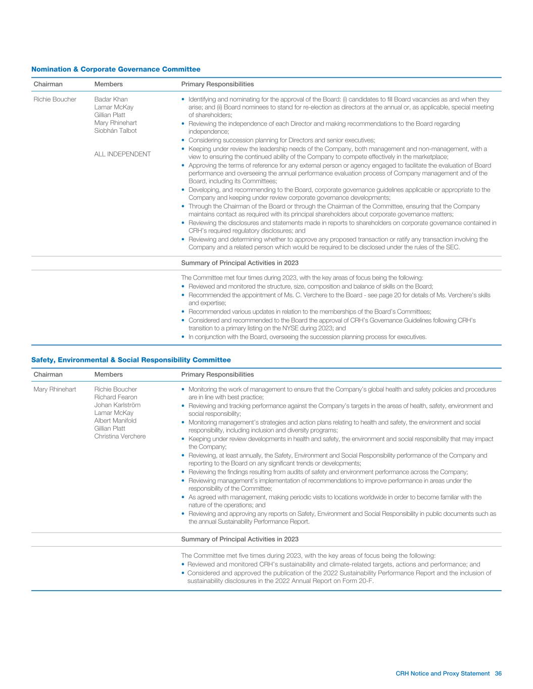 Nomination & Corporate Governance Committee Chairman Members Primary Responsibilities Richie Boucher Badar Khan Lamar McKay Gillian Platt Mary Rhinehart Siobhán Talbot ALL INDEPENDENT • Identifying and nominating for the approval of the Board: (i) candidates to fill Board vacancies as and when they arise; and (ii) Board nominees to stand for re-election as directors at the annual or, as applicable, special meeting of shareholders; • Reviewing the independence of each Director and making recommendations to the Board regarding independence; • Considering succession planning for Directors and senior executives; • Keeping under review the leadership needs of the Company, both management and non-management, with a view to ensuring the continued ability of the Company to compete effectively in the marketplace; • Approving the terms of reference for any external person or agency engaged to facilitate the evaluation of Board performance and overseeing the annual performance evaluation process of Company management and of the Board, including its Committees; • Developing, and recommending to the Board, corporate governance guidelines applicable or appropriate to the Company and keeping under review corporate governance developments; • Through the Chairman of the Board or through the Chairman of the Committee, ensuring that the Company maintains contact as required with its principal shareholders about corporate governance matters; • Reviewing the disclosures and statements made in reports to shareholders on corporate governance contained in CRH’s required regulatory disclosures; and • Reviewing and determining whether to approve any proposed transaction or ratify any transaction involving the Company and a related person which would be required to be disclosed under the rules of the SEC. Summary of Principal Activities in 2023 The Committee met four times during 2023, with the key areas of focus being the following: • Reviewed and monitored the structure, size, composition and balance of skills on the Board; • Recommended the appointment of Ms. C. Verchere to the Board - see page 20 for details of Ms. Verchere’s skills and expertise; • Recommended various updates in relation to the memberships of the Board’s Committees; • Considered and recommended to the Board the approval of CRH’s Governance Guidelines following CRH’s transition to a primary listing on the NYSE during 2023; and • In conjunction with the Board, overseeing the succession planning process for executives. Safety, Environmental & Social Responsibility Committee Chairman Members Primary Responsibilities Mary Rhinehart Richie Boucher Richard Fearon Johan Karlström Lamar McKay Albert Manifold Gillian Platt Christina Verchere • Monitoring the work of management to ensure that the Company’s global health and safety policies and procedures are in line with best practice; • Reviewing and tracking performance against the Company’s targets in the areas of health, safety, environment and social responsibility; • Monitoring management’s strategies and action plans relating to health and safety, the environment and social responsibility, including inclusion and diversity programs; • Keeping under review developments in health and safety, the environment and social responsibility that may impact the Company; • Reviewing, at least annually, the Safety, Environment and Social Responsibility performance of the Company and reporting to the Board on any significant trends or developments; • Reviewing the findings resulting from audits of safety and environment performance across the Company; • Reviewing management’s implementation of recommendations to improve performance in areas under the responsibility of the Committee; • As agreed with management, making periodic visits to locations worldwide in order to become familiar with the nature of the operations; and • Reviewing and approving any reports on Safety, Environment and Social Responsibility in public documents such as the annual Sustainability Performance Report. Summary of Principal Activities in 2023 The Committee met five times during 2023, with the key areas of focus being the following: • Reviewed and monitored CRH’s sustainability and climate-related targets, actions and performance; and • Considered and approved the publication of the 2022 Sustainability Performance Report and the inclusion of sustainability disclosures in the 2022 Annual Report on Form 20-F. CRH Notice and Proxy Statement 36