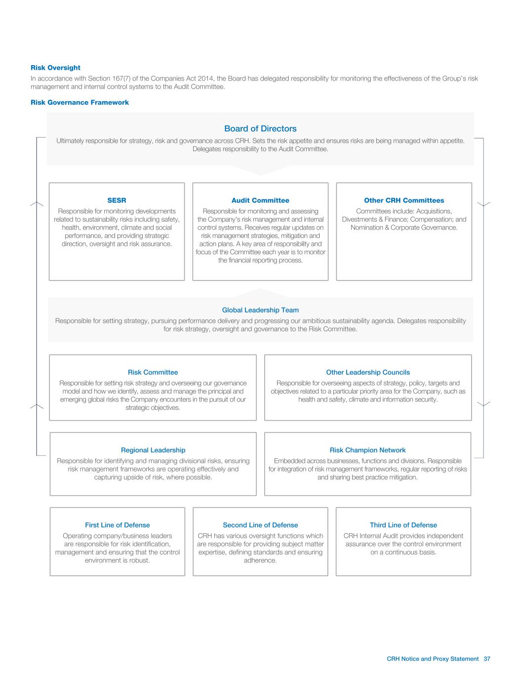 Risk Oversight In accordance with Section 167(7) of the Companies Act 2014, the Board has delegated responsibility for monitoring the effectiveness of the Group’s risk management and internal control systems to the Audit Committee. Risk Governance Framework Board of Directors Ultimately responsible for strategy, risk and governance across CRH. Sets the risk appetite and ensures risks are being managed within appetite. Delegates responsibility to the Audit Committee. SESR Responsible for monitoring developments related to sustainability risks including safety, health, environment, climate and social performance, and providing strategic direction, oversight and risk assurance. Audit Committee Responsible for monitoring and assessing the Company's risk management and internal control systems. Receives regular updates on risk management strategies, mitigation and action plans. A key area of responsibility and focus of the Committee each year is to monitor the financial reporting process. Other CRH Committees Committees include: Acquisitions, Divestments & Finance; Compensation; and Nomination & Corporate Governance. Global Leadership Team Responsible for setting strategy, pursuing performance delivery and progressing our ambitious sustainability agenda. Delegates responsibility for risk strategy, oversight and governance to the Risk Committee. Risk Committee Responsible for setting risk strategy and overseeing our governance model and how we identify, assess and manage the principal and emerging global risks the Company encounters in the pursuit of our strategic objectives. Other Leadership Councils Responsible for overseeing aspects of strategy, policy, targets and objectives related to a particular priority area for the Company, such as health and safety, climate and information security. Regional Leadership Responsible for identifying and managing divisional risks, ensuring risk management frameworks are operating effectively and capturing upside of risk, where possible. Risk Champion Network Embedded across businesses, functions and divisions. Responsible for integration of risk management frameworks, regular reporting of risks and sharing best practice mitigation. First Line of Defense Operating company/business leaders are responsible for risk identification, management and ensuring that the control environment is robust. Second Line of Defense CRH has various oversight functions which are responsible for providing subject matter expertise, defining standards and ensuring adherence. Third Line of Defense CRH Internal Audit provides independent assurance over the control environment on a continuous basis. CRH Notice and Proxy Statement 37